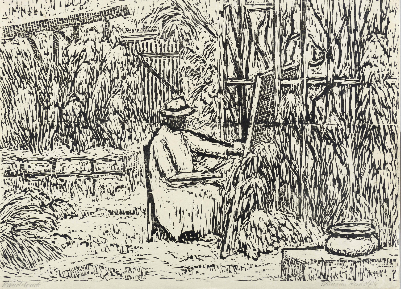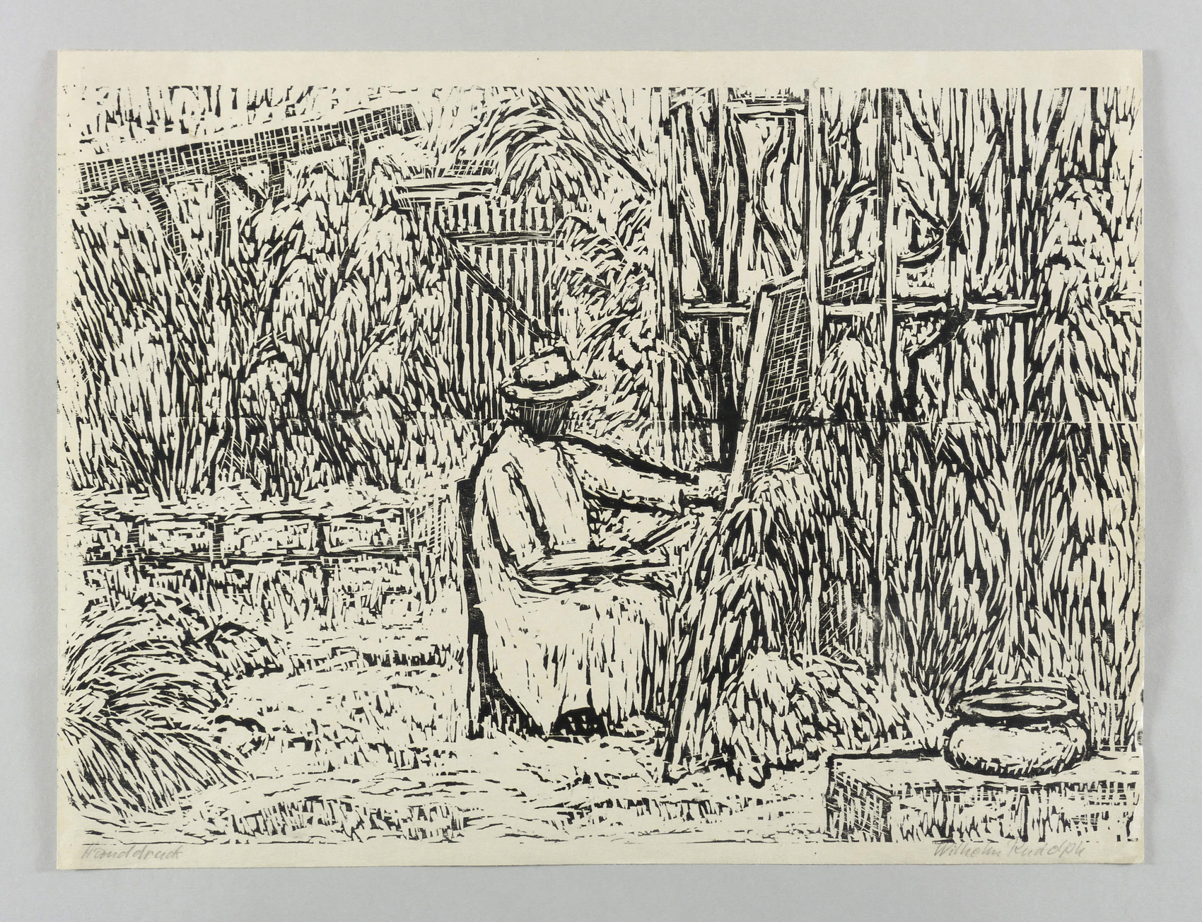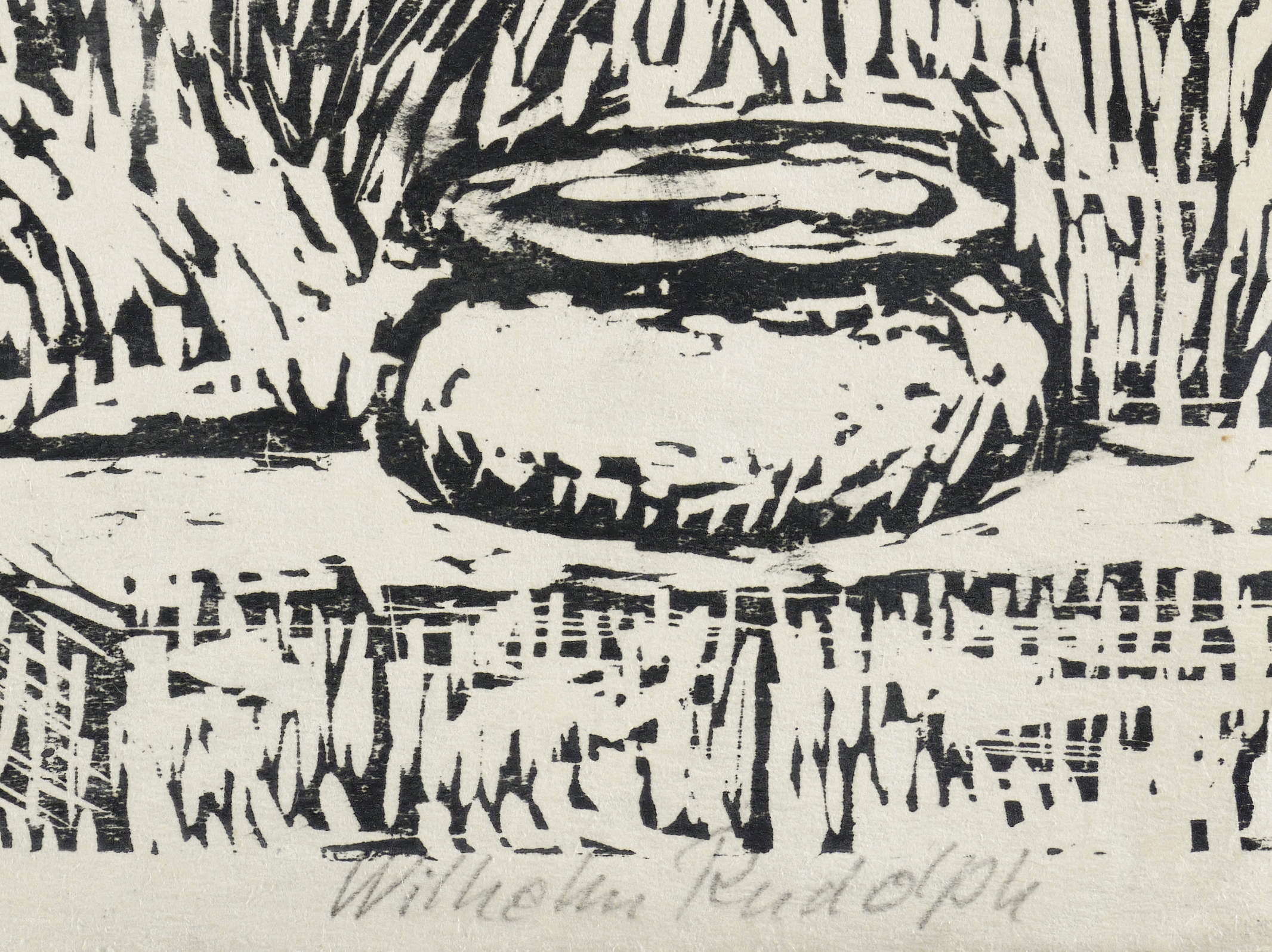 Rechts unten in Bleistift signiert: ″Wilhelm Rudolph″. Links bezeichnet: ″Handdruck″. – Eigenhändiger Abzug bzw. Abrieb des Künstlers. – Blattrand mit leichten Lagerspuren. Insgesamt gut erhalten.