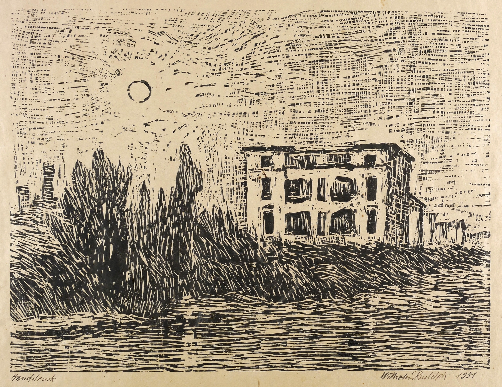 Rechts unten in schwarzer Feder signiert und datiert: ″Wilhelm Rudolph 1951″. Links bezeichnet: ″Handdruck″. – Eigenhändiger Abzug bzw. Abrieb des Künstlers auf eigens getöntem Papier. - Ausstellung: 1982 Galerie Döbele Ravensburg (Ausst.-Kat. Nr. 144). - Literatur: W.R. Dresden 45. Holzschnitte und Federzeichnungen (Leipzig: Reclam 1983), Abb. S. 45. – Leichte Altersspuren, im Rand bisweilen leichte Flecken. Insgesamt guter Zustand.