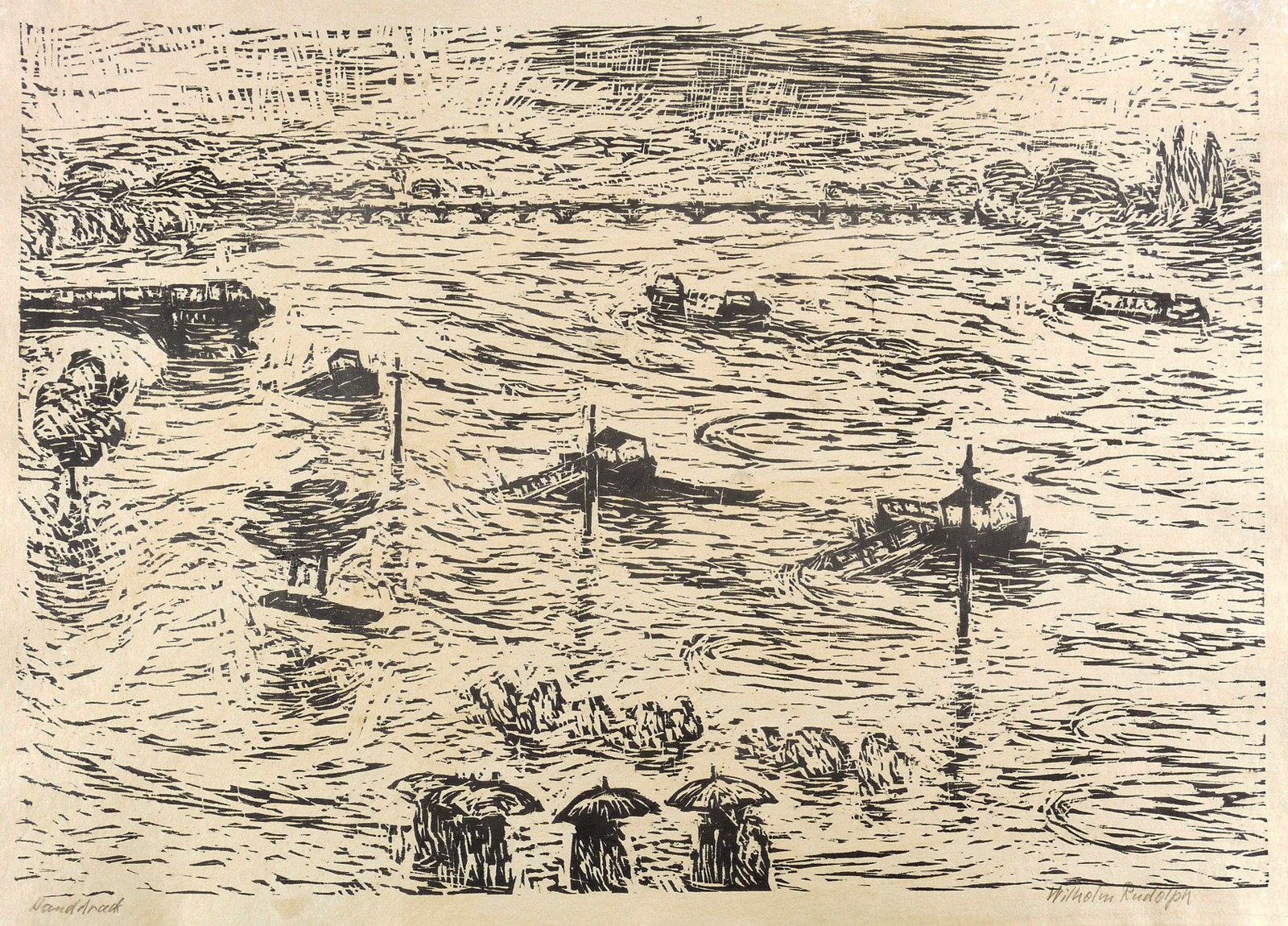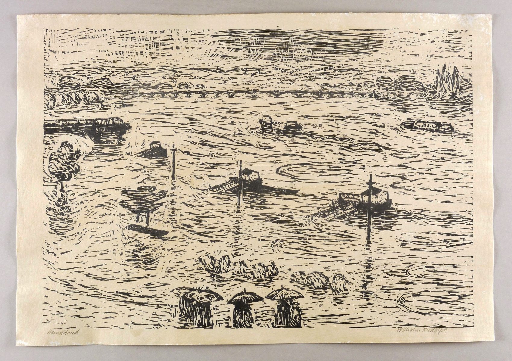 Rechts unten in Bleistift signiert: ″Wilhelm Rudolph″. Links bezeichnet: ″Handdruck″. – Eigenhändiger Abzug bzw. Abrieb des Künstlers. - Hier der ursprüngliche erste Zustand dieses Holzschnitts mit den Passanten mit Regenschirmen im unteren Rand. Der spätere Zustand verschiedentlich ausgestellt (siehe unten). - Ausstellung: 1982 Galerie Döbele Ravensburg (Kat.-Nr. 212), 1988 Galerie Döbele Ravensburg (Kat.-Nr. 94, Abb. S. 52, hier falsch als ″Schiffe auf der Elbe″), 2014 Städtische Galerie Dresden (Kat.-Nr. 129, Abb. S. 121). - Die Darstellung zeigt die zerstörte Carolabrücke mit der Augustusbrücke im Hintergrund während des Hochwassers von 1954. – Guter Zustand.