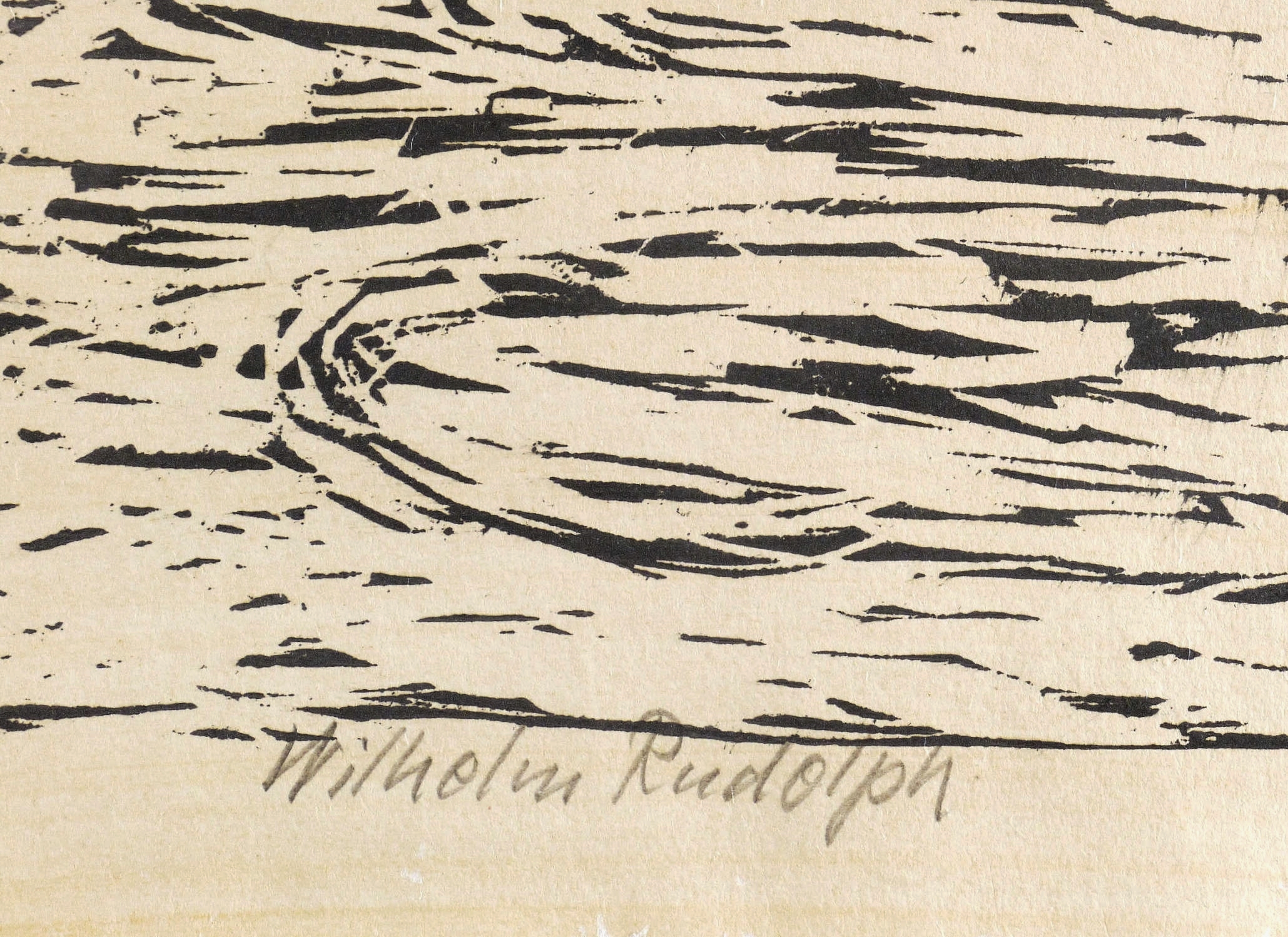 1954. Holzschnitt, in Schwarz, auf sandfarben eingestrichenem Velinkarton. – Originale Künstlergrafik, von Wilhelm Rudolph. – 45,4 x 65,3 cm (Darstellung / Druckstock), 50 x 73 cm (Blatt).