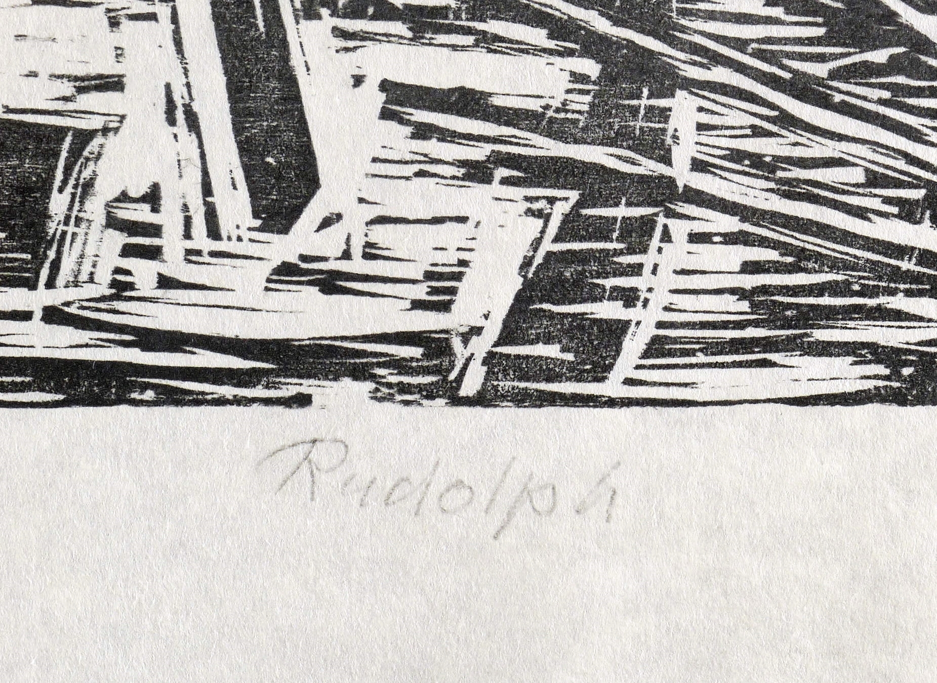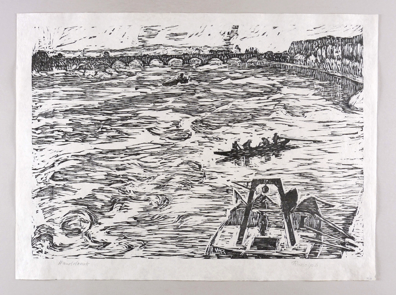 Rechts unten in Bleistift signiert: ″Rudolph″. Links bezeichnet: ″Handdruck″. Im Druckstock rechts unten im Schiffsanleger Monogramm: ″WR″. – Eigenhändiger Abzug bzw. Abrieb des Künstlers. - Die Augustusbrücke etwa von der Marienbrücke aus gesehen. Das Elbwasser im Vordergrund wie durch Windböen stark bewegt. - Späterer Zustand des in den Jahren um 1930 entstandenen Holzschnitts. Als Ausweis der vor 1945 erfolgten Anlage des Holzschnitts gilt das Monogramm, das später keine Verwendung fand. Rechts oberhalb der Brücke dargestellte Gebäude der Dresdner Altstadt offenbar nach der Kriegszerstörung der Bombennacht vom 13. Februar 1945 weggeschnitten. - Ausstellung: 1982 Galerie Döbele Ravensburg (Kat.-Nr. 212), 1988 Galerie Döbele Ravensburg (Kat.-Nr. 65, Abb. S. 32, hier betitelt als ″Elbbrücke mit Lastkahn″ und ″Die Elbe bei steigendem Wasser″ sowie datiert auf ″vor 1945″). – Sehr guter Zustand.