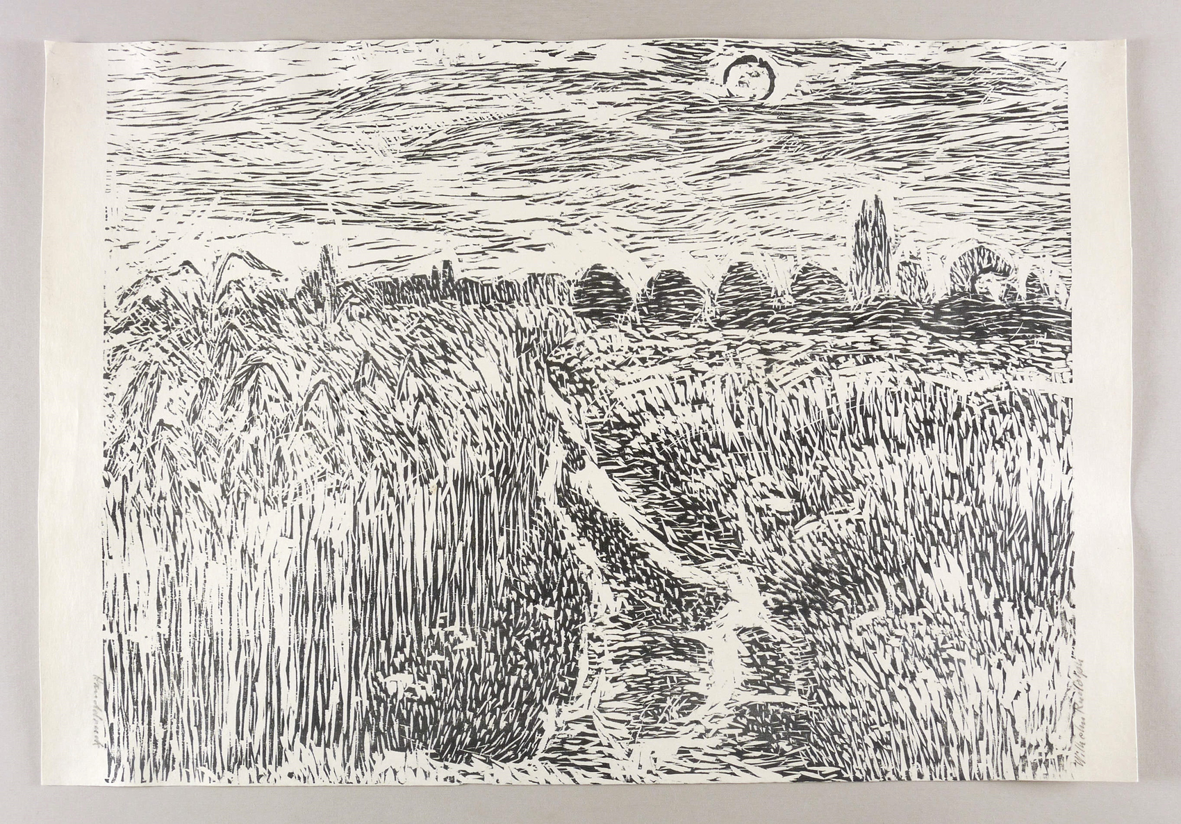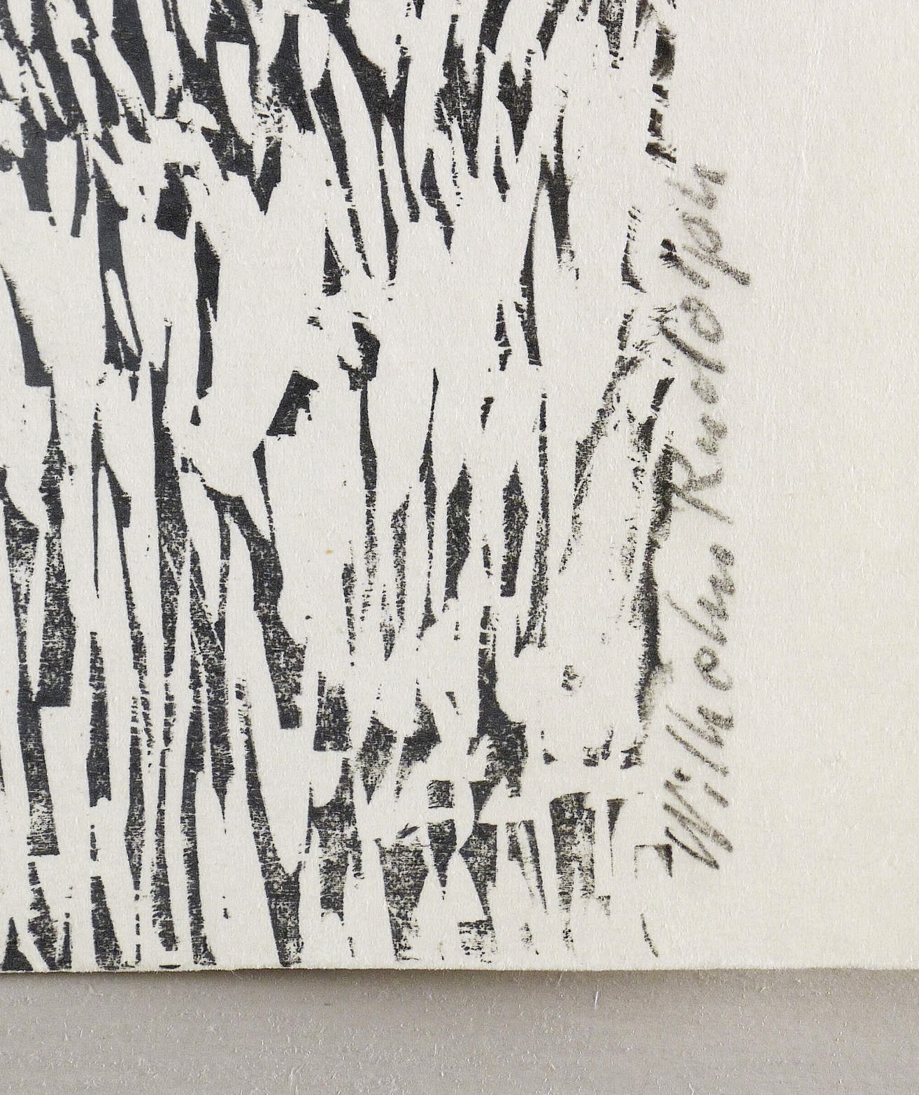 Am rechten Druckrand unten in Bleistift signiert: ″Wilhelm Rudolph″. Links bezeichnet: ″Handdruck″. – Eigenhändiger Abzug bzw. Abrieb des Künstlers. Wie oft bei Rudolph oben und unten randlos gedruckt. – Martin Schmidt erwähnt diesen Holzschnitt als Beispiel für eine neue Formgebung und kleinteiligere Schnittweise bei Wilhelm Rudolph ab den 1950er Jahren. Auf die frühere expressionistische Vereinfachung und drangvolle Form antwortet nun eine ausgewogen-harmonische Komposition, überzogen von einem impressionistischen Flirren. (Vgl. Martin Schmidt, W.R. In Licht und Dunkelheit des Lebens und der Natur, Dresden: Hochschule für Bildende Künste 2003, S. 141-143). - Ausstellung: 1982 Galerie Döbele Ravensburg, (Kat.-Nr. 184, Abb.), 1988 Galerie Döbele Ravensburg (Kat.-Nr. 101, Abb. S. 47). – Tadelos. Sehr guter Zustand.