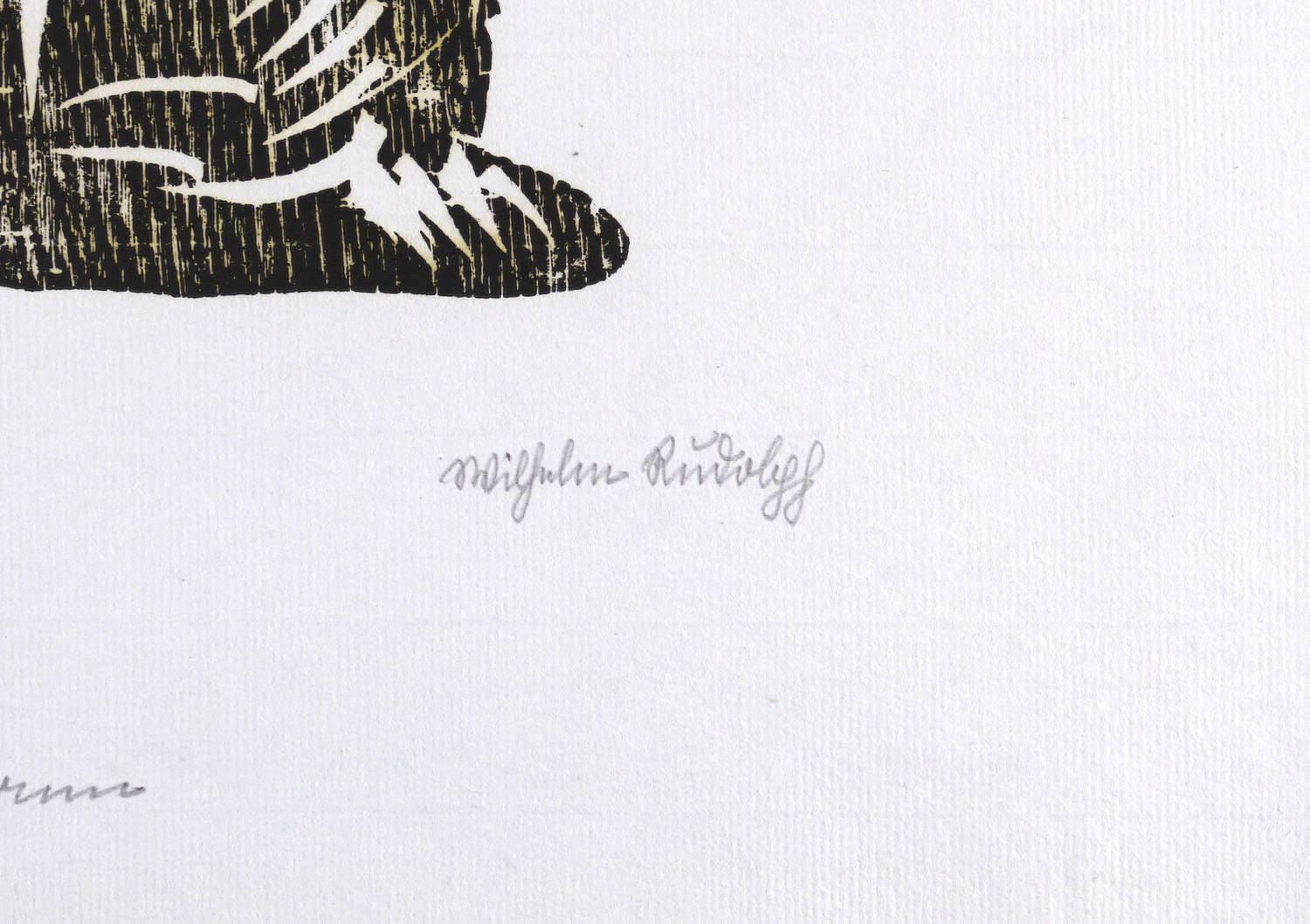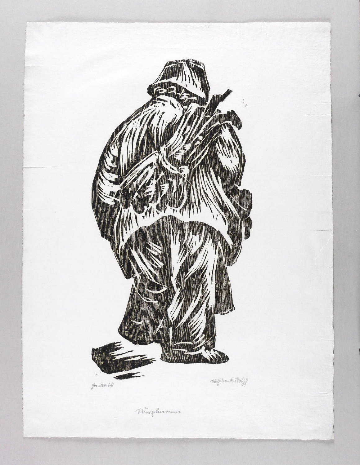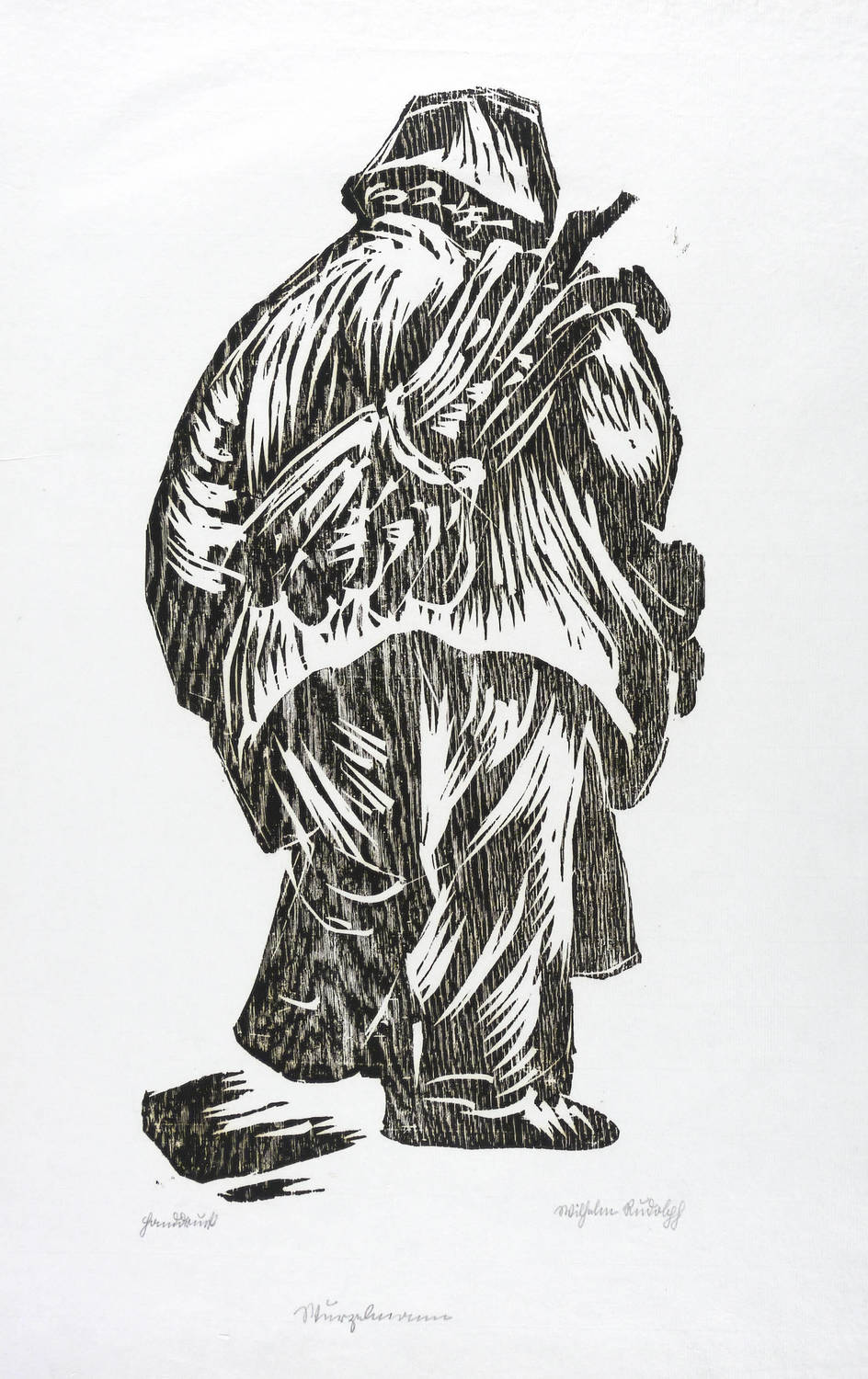 Rechts unten in Bleistift in Sütterlin signiert: ″Wilhelm Rudolph″. Links bezeichnet: ″Handdruck″. Etwas weiter unten mittig Titel: ″Wurzelmann″. Unleserliches Wasserzeichen, etwa: ″Willa″. – Bislang nicht publiziert. Selten. – Unbeschnittenes originalrandiges Exemplar. Umlaufend breiter Papierrand. Keine Mängel. Sehr guter Zustand.