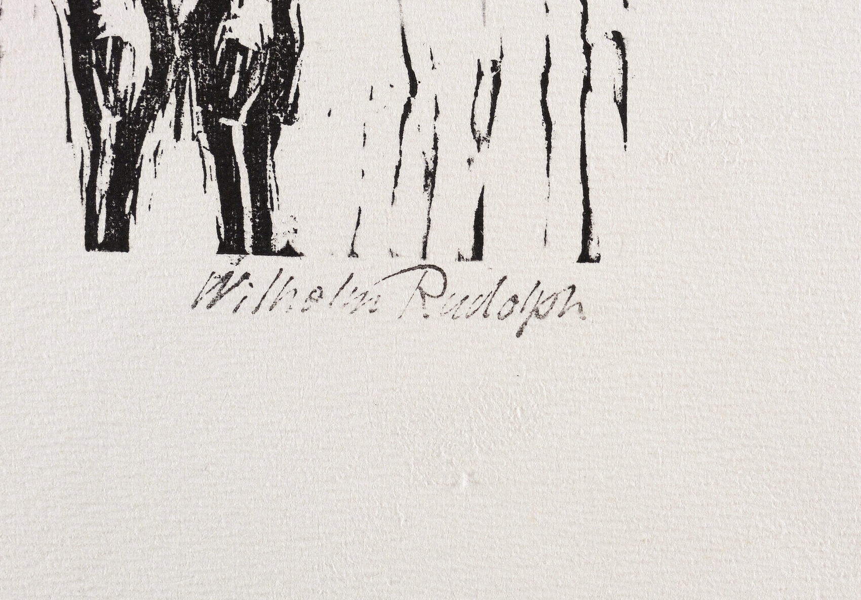 Nicht handsigniert. Rechts unten Stempel-Signatur: ″Wilhelm Rudolph″. Verso weiterer Stempel: ″Handdruck: B. Koban″. Dieser in Bleistift signiert, nummeriert und datiert: ″I/28/35 BK. 88″. Links unten Blindstempel der Grafik-Edition des Staatlichen Kunsthandels der DDR. – Posthumer Abzug bzw. Abrieb vom originalen Druckstock durch den Wilhelm-Rudolph-Schüler Bernhard Koban aus dem Jahr 1988. – Breitrandiges Exemplar. Im oberen Rand längs Montagespur. Mäßig guter Zustand.