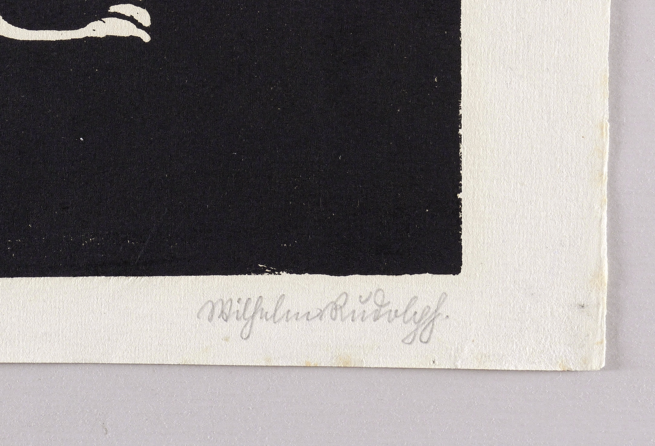 Rechts unten in Bleistift (Kurrentschrift) signiert: ″Wilhelm Rudolph″. Links bezeichnet: ″Handdruck″. Im Holzstock rechts oben geschnittene Signatur: ″W.R.″ – Eine von den vier frühen zwischen 1919 und 1922 entstandenen Tierdarstellungen im Weißlinienholzschnitt. - Vgl. Martin Schmidt, W.R. Licht und Dunkelheit des Lebens und der Natur (Dresden 2002), S. 32-34, Abb. 21. – Leichte Lagerspuren im Papierrand. Sonst ohne Tadel. Insgesamt guter Zustand.