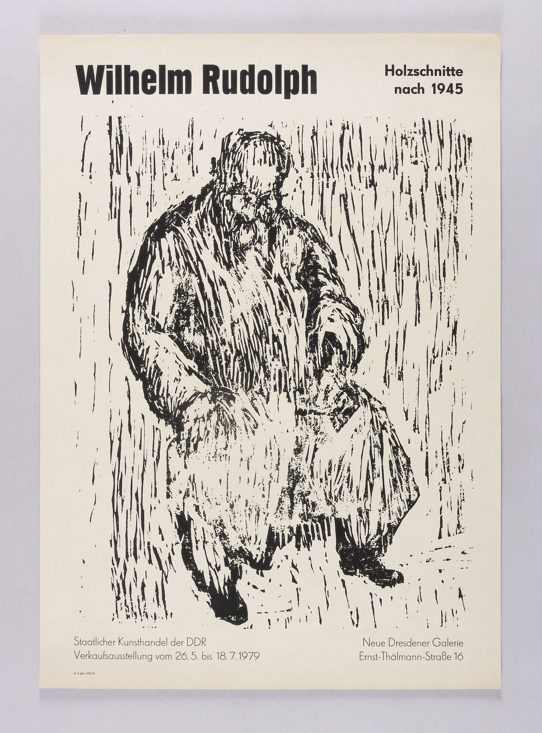 Nicht handsigniert. Diverse Plakat-Inschriften. – Künstlerplakat zur Ausstellung ″Wilhelm Rudolph Holzschnitte nach 1945″ in der Neuen Dresdener Galerie des Staatlichen Kunsthandels der DDR in Dresden 26.5.-18.7.1979. Mit der leicht verkleinerten Wiedergabe des Holzschnitts ″Sitzender Alter im Mantel″ von 1945-1950. – Provenienz: Sammlung Erhard Frommhold, Dresden. – Sehr guter Zustand.