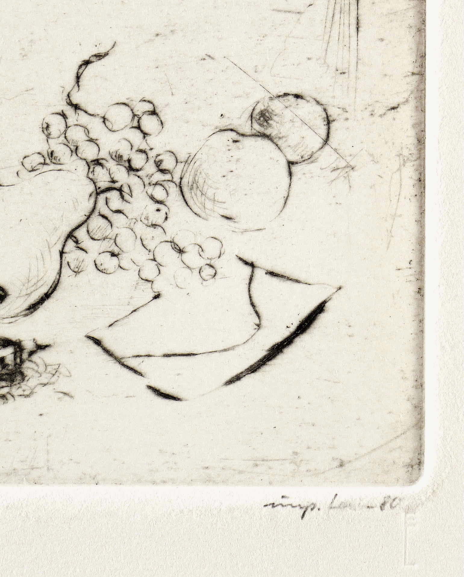 George 98. – Aus: Max Schwimmer II. Radierungen (Leipzig: Staatlicher Kunsthandel der DDR / Galerie am Sachsenplatz 1980). – Rechts unten in Bleistift signiert und datiert vom Drucker Ernst Lau. Dazu Trockenstempel. Links Auflagenbezeichnung. Verso in Bleistift signiert von der wissenschaftlichen Betreuerin des Nachlasses Magdalena George. – Posthumer Abzug von der originalen Platte. – Sehr guter Zustand.
