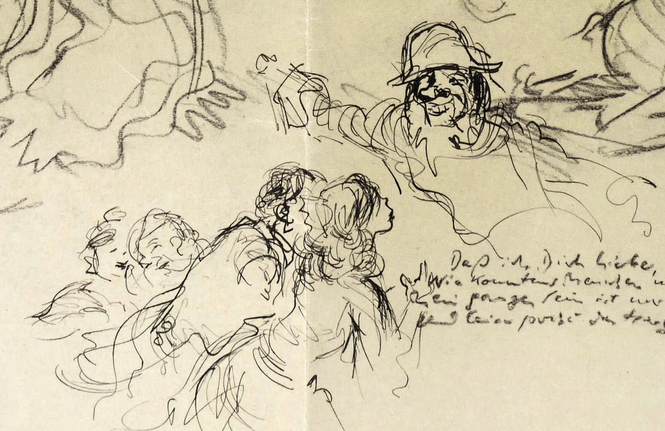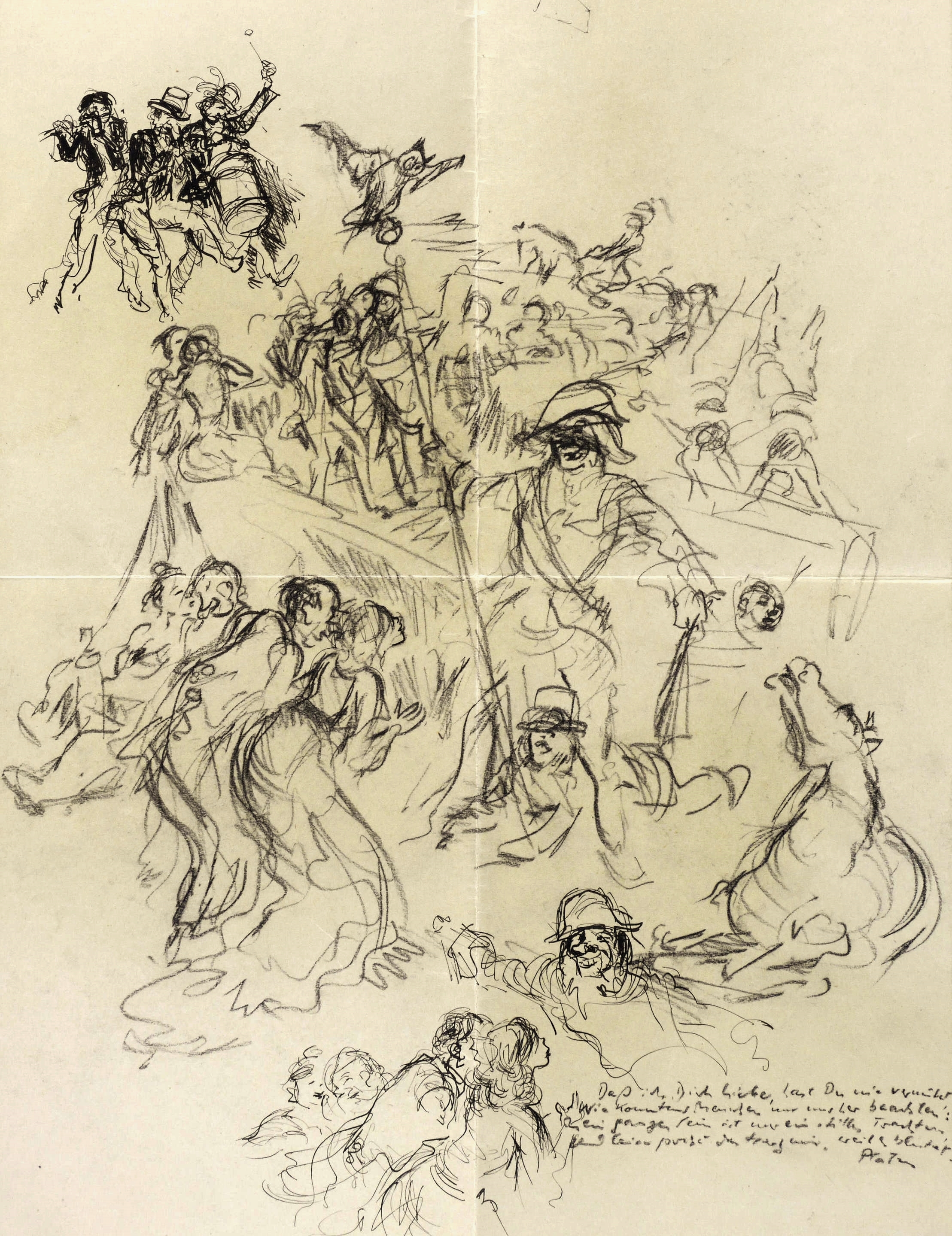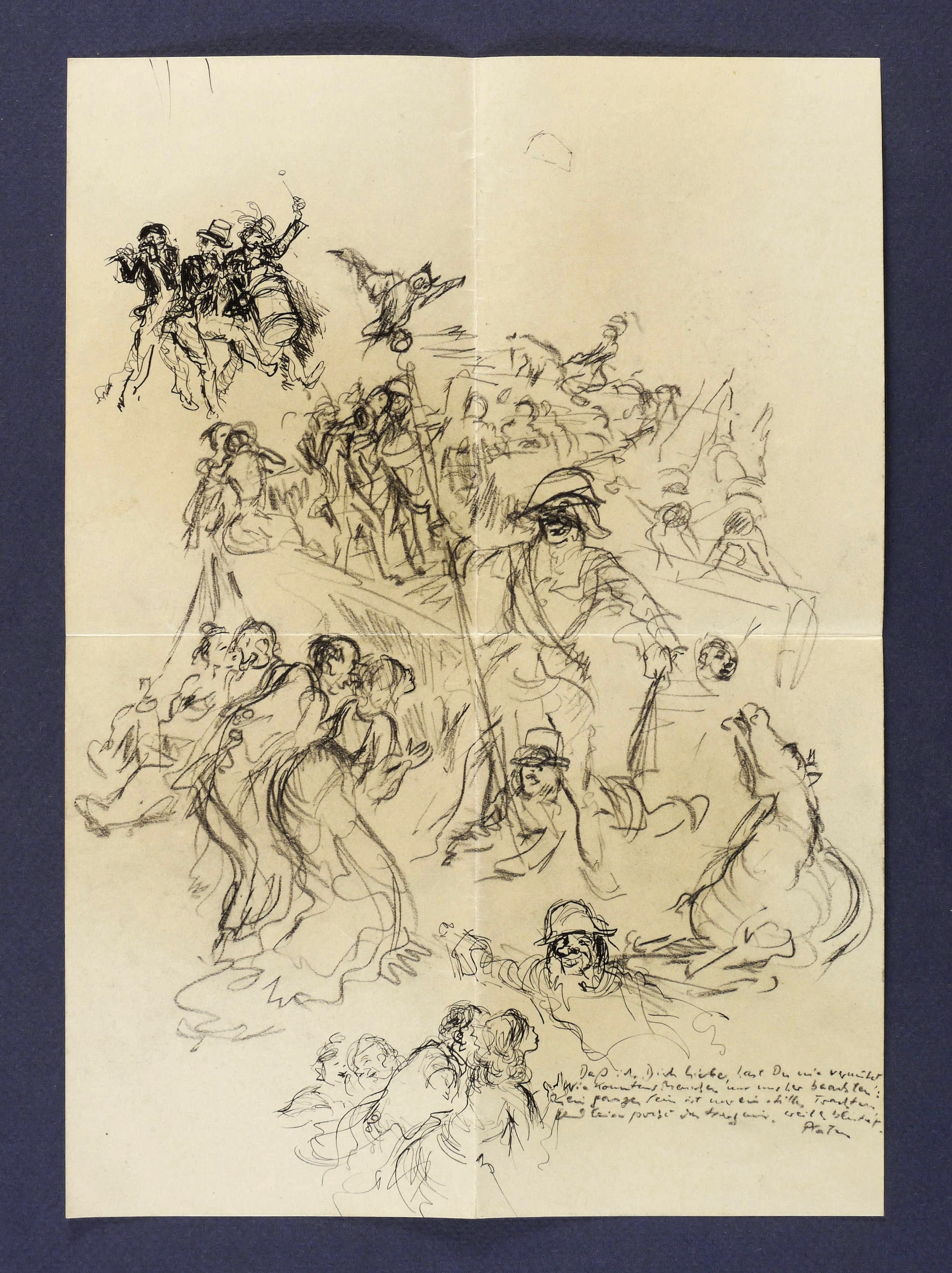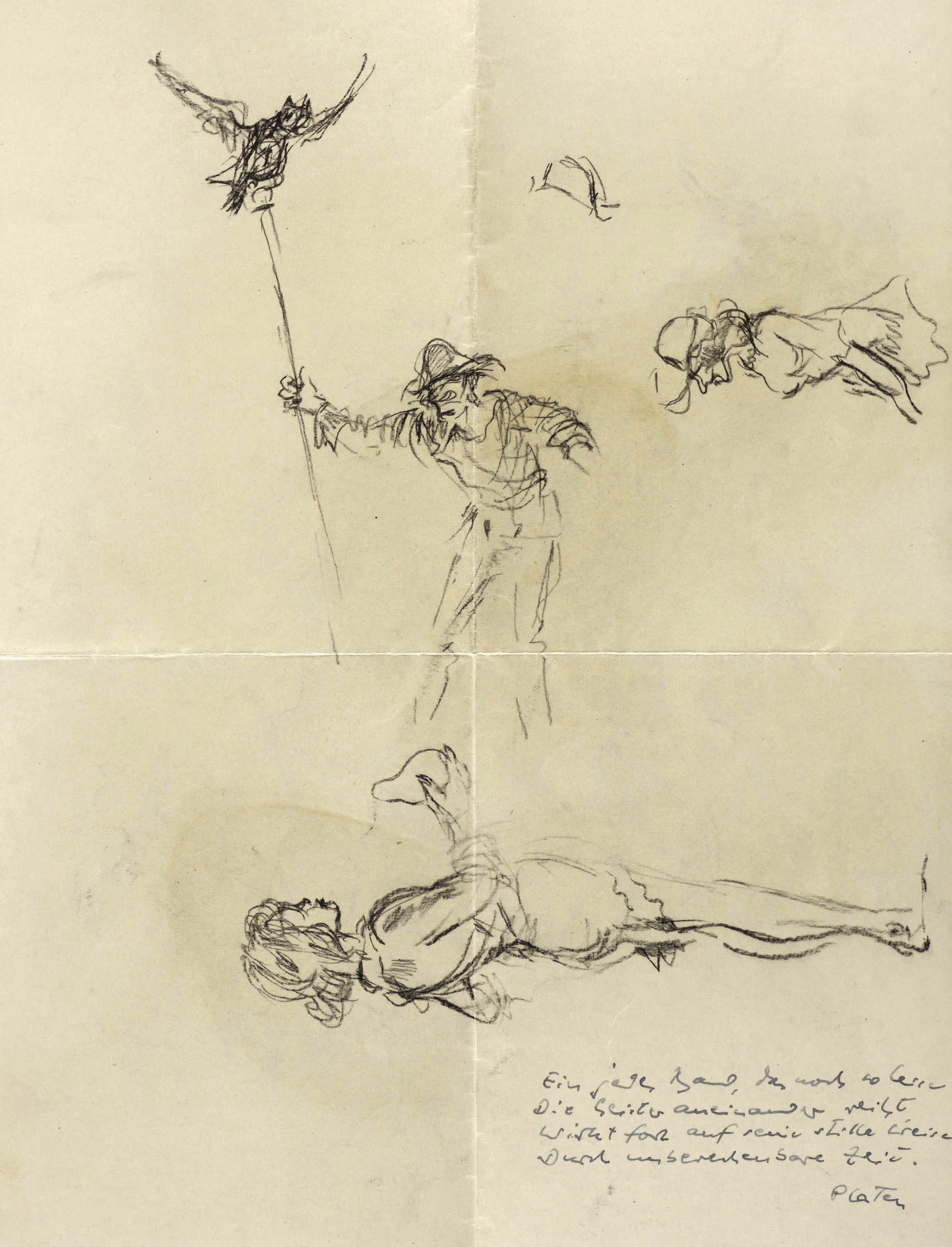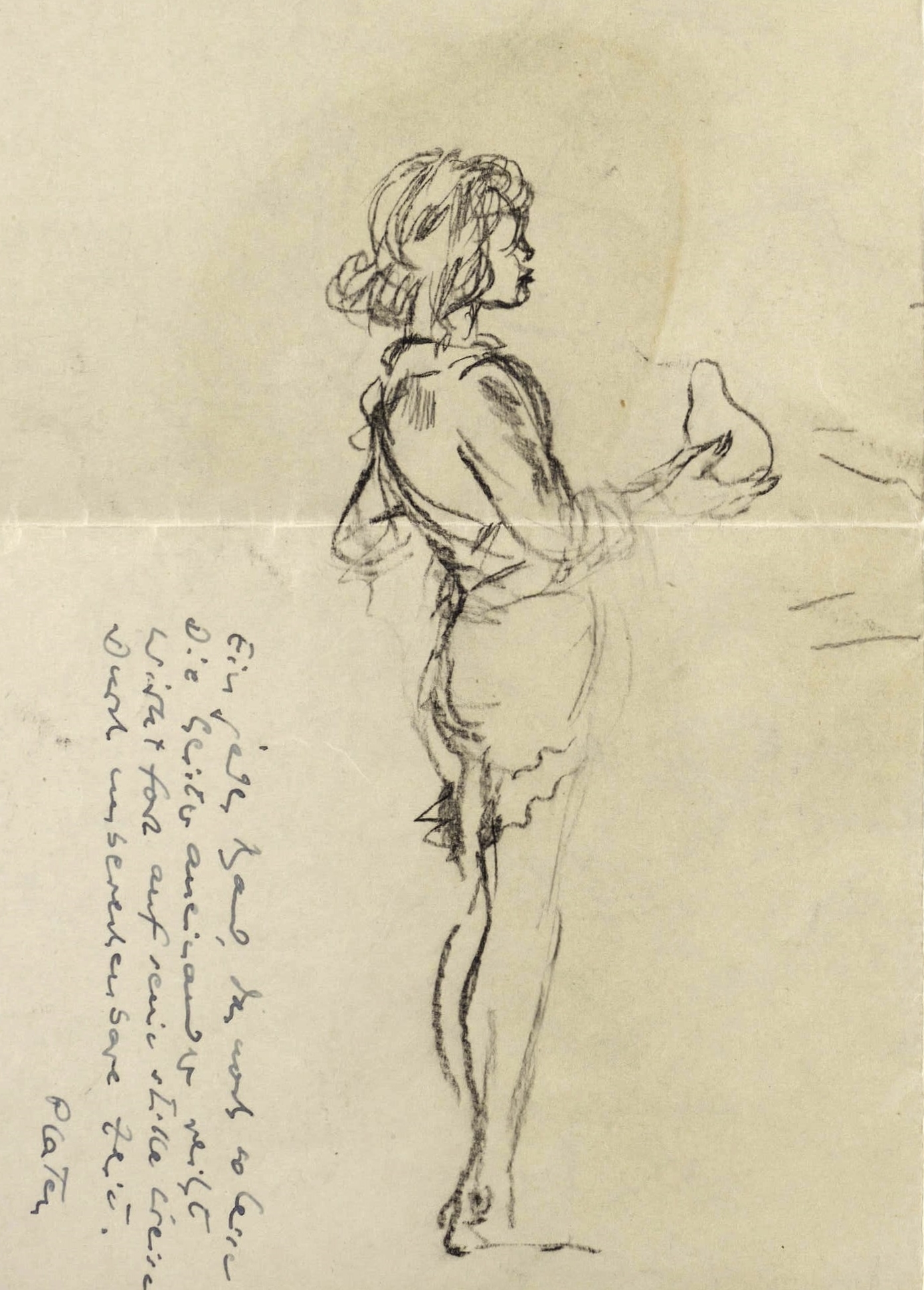 Rechts unten in schwarzer Kreide Zitat: ″Daß ich dich liebe, hast du nie vermutet, / Nie konnten's Menschen um uns her beachten: / Mein ganzes Sein ist nur ein stilles Trachten, / Und leise pocht das Herz mir, weil es blutet. / Platen″. Verso in blauer Feder weiter: ″Ein jedes Band, das noch so leise / Die Geister aneinander reiht, / Wirkt fort auf seine stille Weise / Durch unberechenbare Zeit. / Platen″. – Vorder- und Rückseite mit vielfältigen Skizzen in Kreide, bisweilen auch in Feder. Charmantes Blatt mit Werkstattcharakter. - Provenienz: Nachlass Gertrud Griessbach (*1925 Satzung im Erzgebirge, †2018 Waldkraiburg; geborene Gertrud Horn, in erster Ehe Gertrud Horn-Lieven), Schülerin und Muse des Künstlers. – Zwei Lagerfalten. Sonst tadellos. Insgesamt guter Zustand.