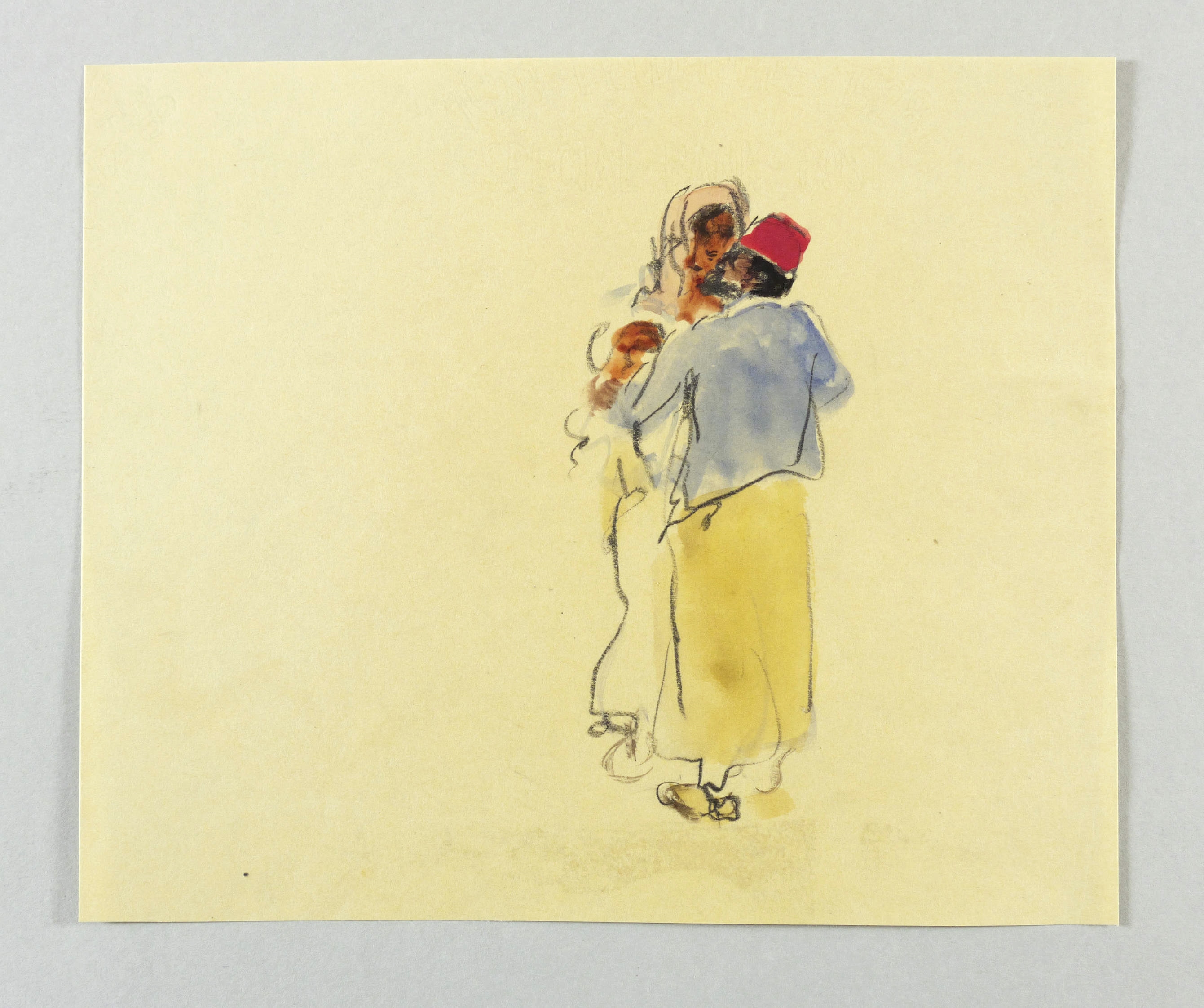 1936-1939. Zeichnung / Bleistiftzeichnung, aquarelliert, auf gelbem Velin. – Originale Künstlergrafik, von Max Schwimmer. – Unikat. – 13,2 x 5,9 cm (Darstellung), 17,5 x 21,0 cm (Blatt).