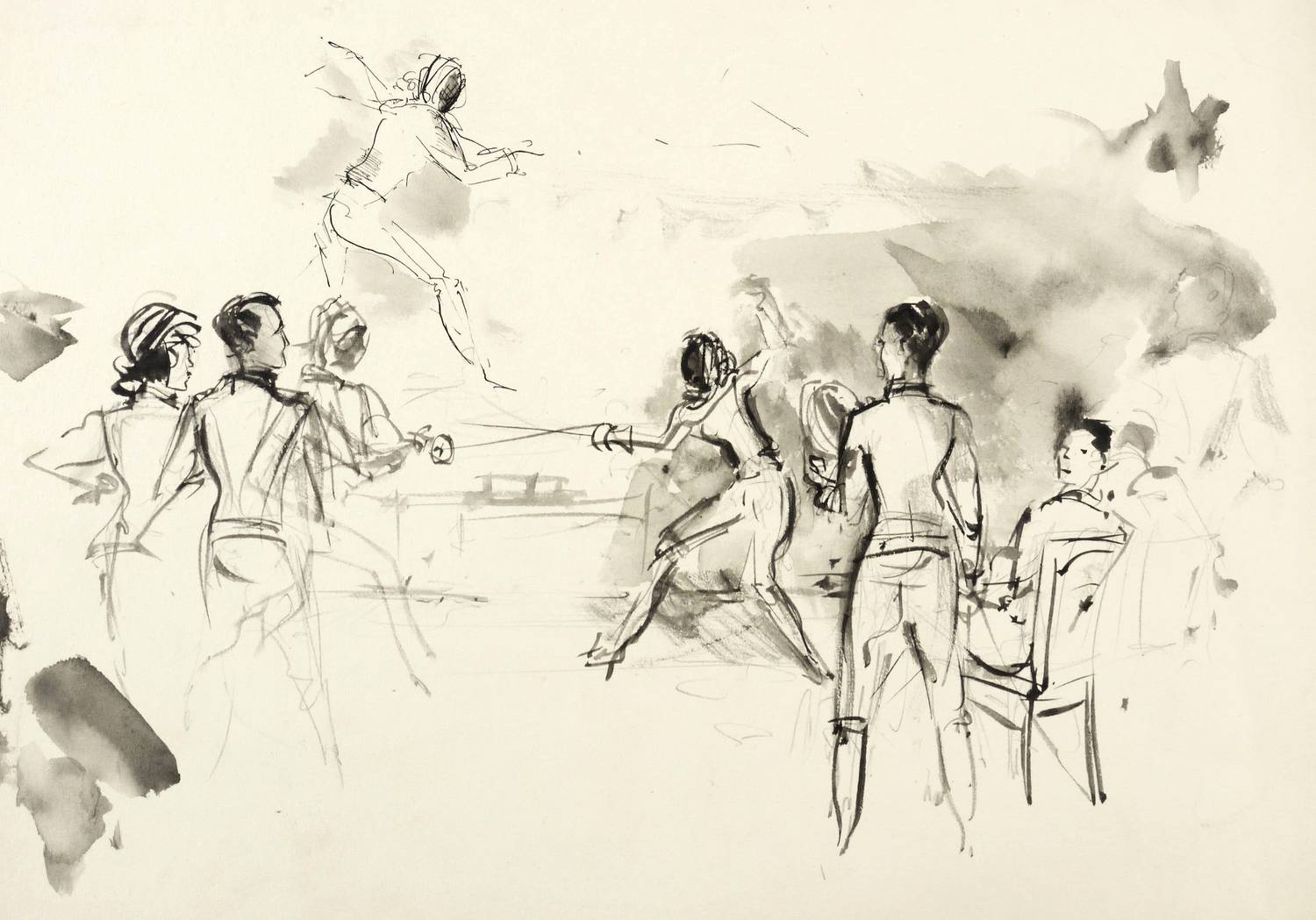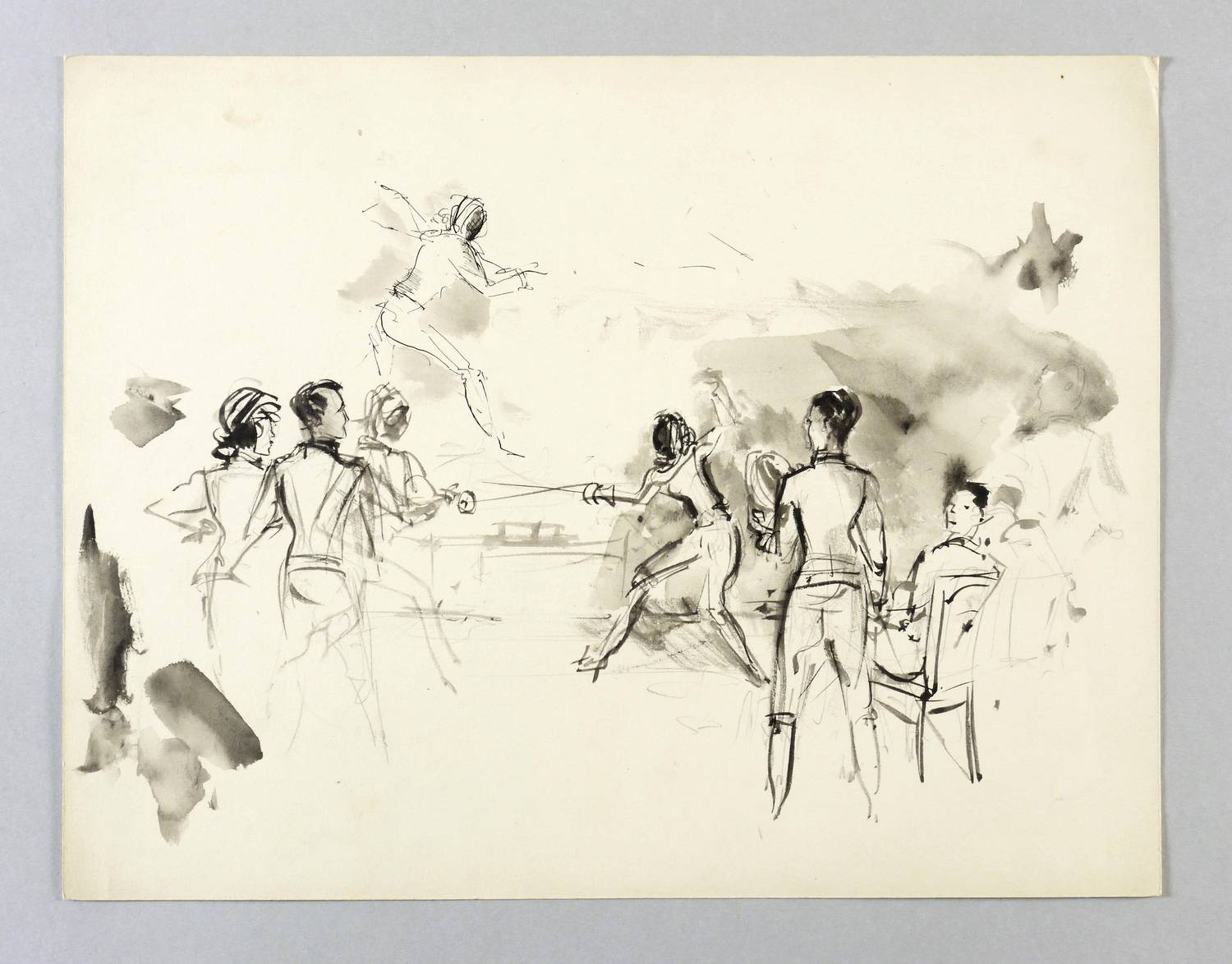 1950-1960. Zeichnung / Pinsel- & Federzeichnung, in schwarzer Tusche, laviert, auf hellem Karton. – Originale Künstlergrafik, von Max Schwimmer. – Unikat. – 18,8 x 28,6 cm (Darstellung), 25 x 32 cm (Blatt).