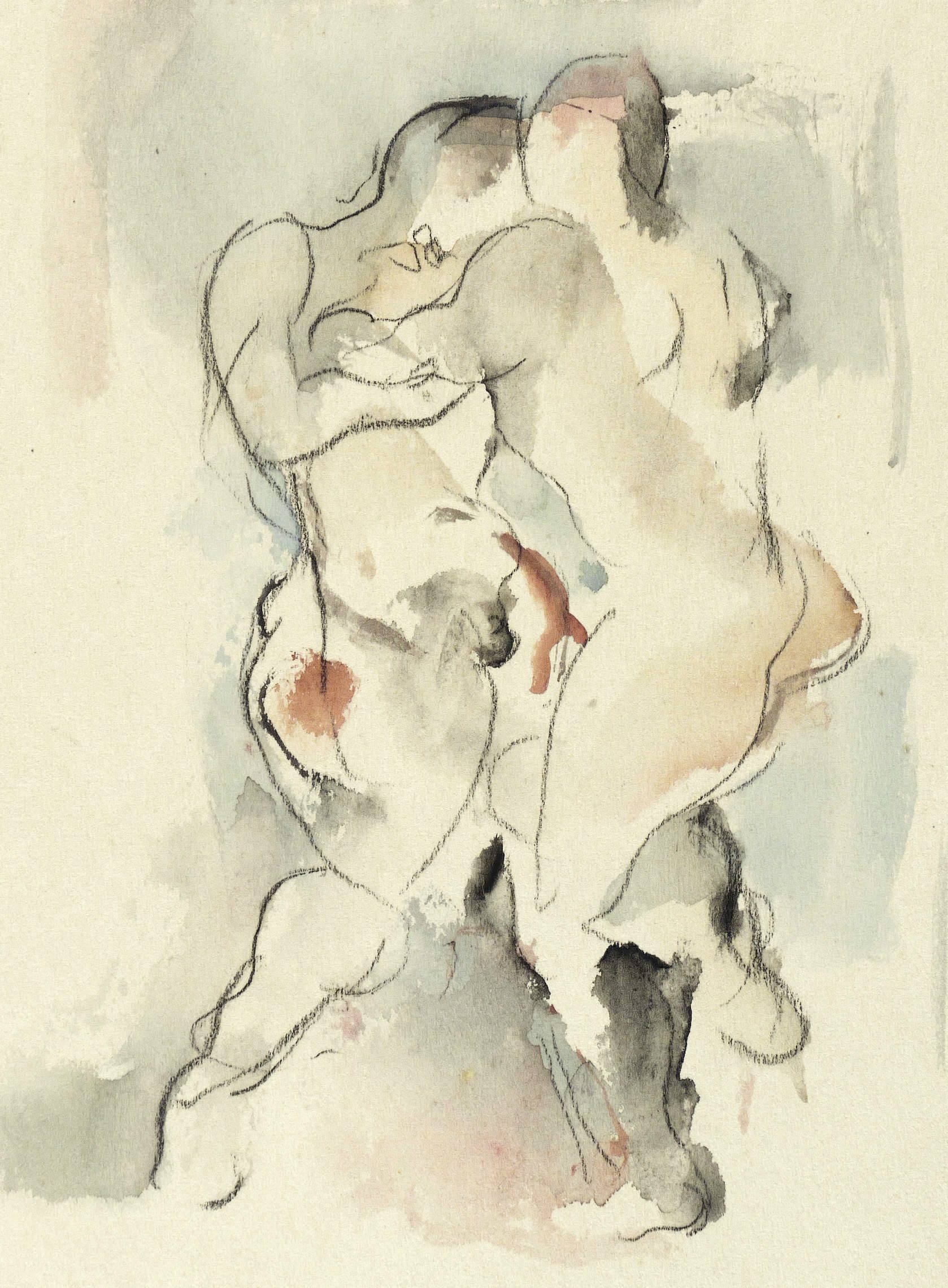 1950-1960. Aquarell, über schwarzer Kreide, auf gelbem Velin. – Originale Künstlergrafik, von Max Schwimmer. – Unikat. – 16,9 x 12,8 cm (Darstellung), 22,0 x 17,5 cm (Blatt).