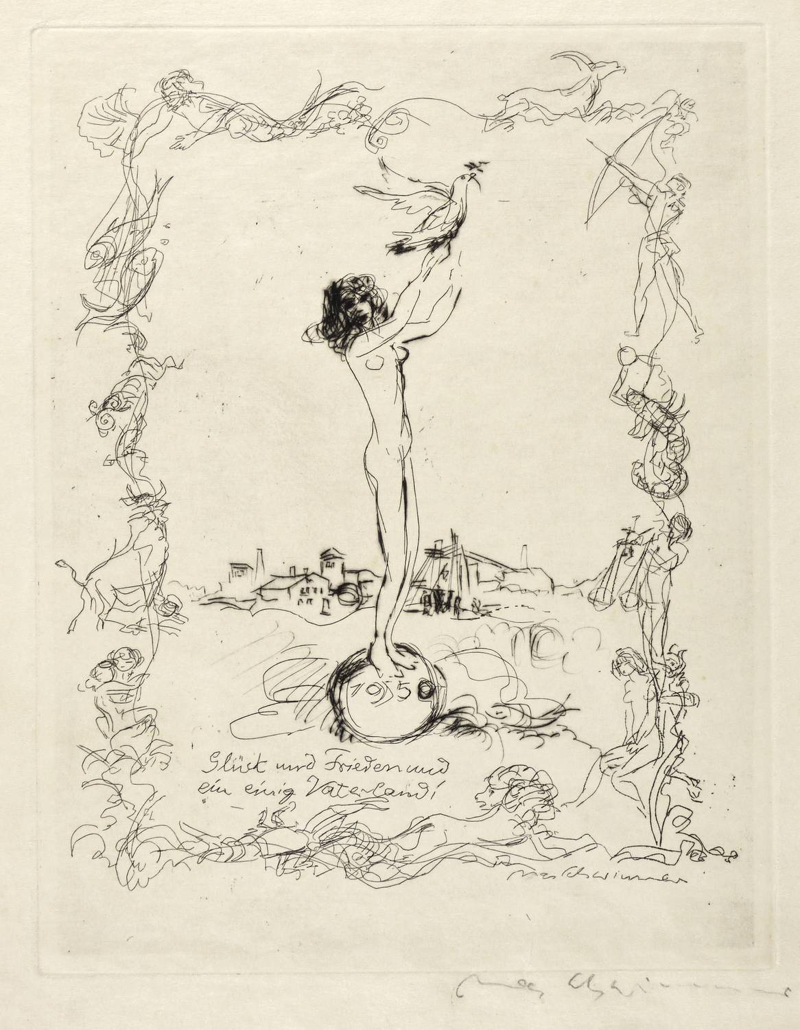 George 128. – Rechts unten in Bleistift signiert: ″Max Schwimmer″. In der Platte rechst unten nochmals signiert. Dazu Inschrift: ″1950 / Glück und Frieden und ein einig Vaterland!″ – Geringe Lagerspuren. Guter Zustand.