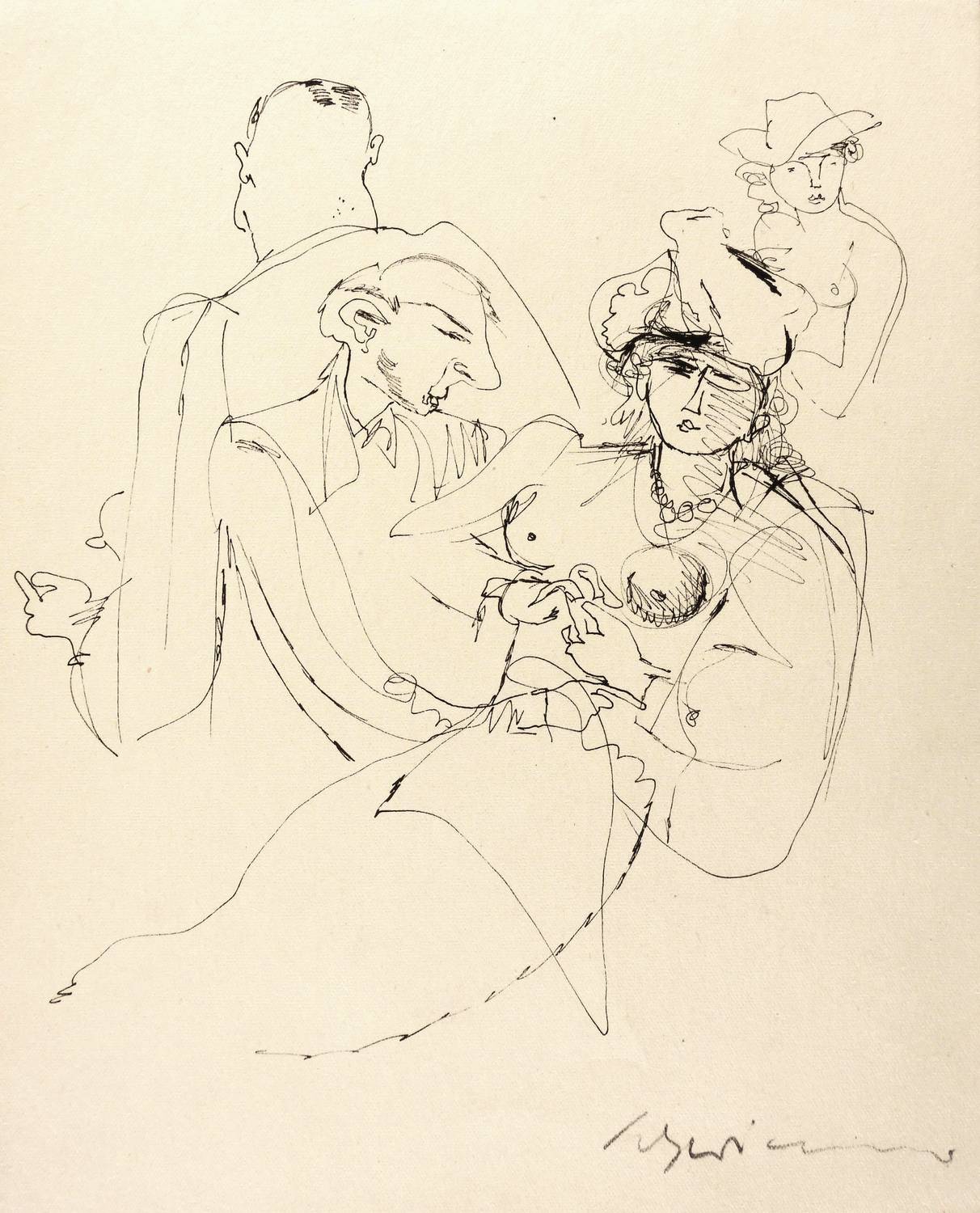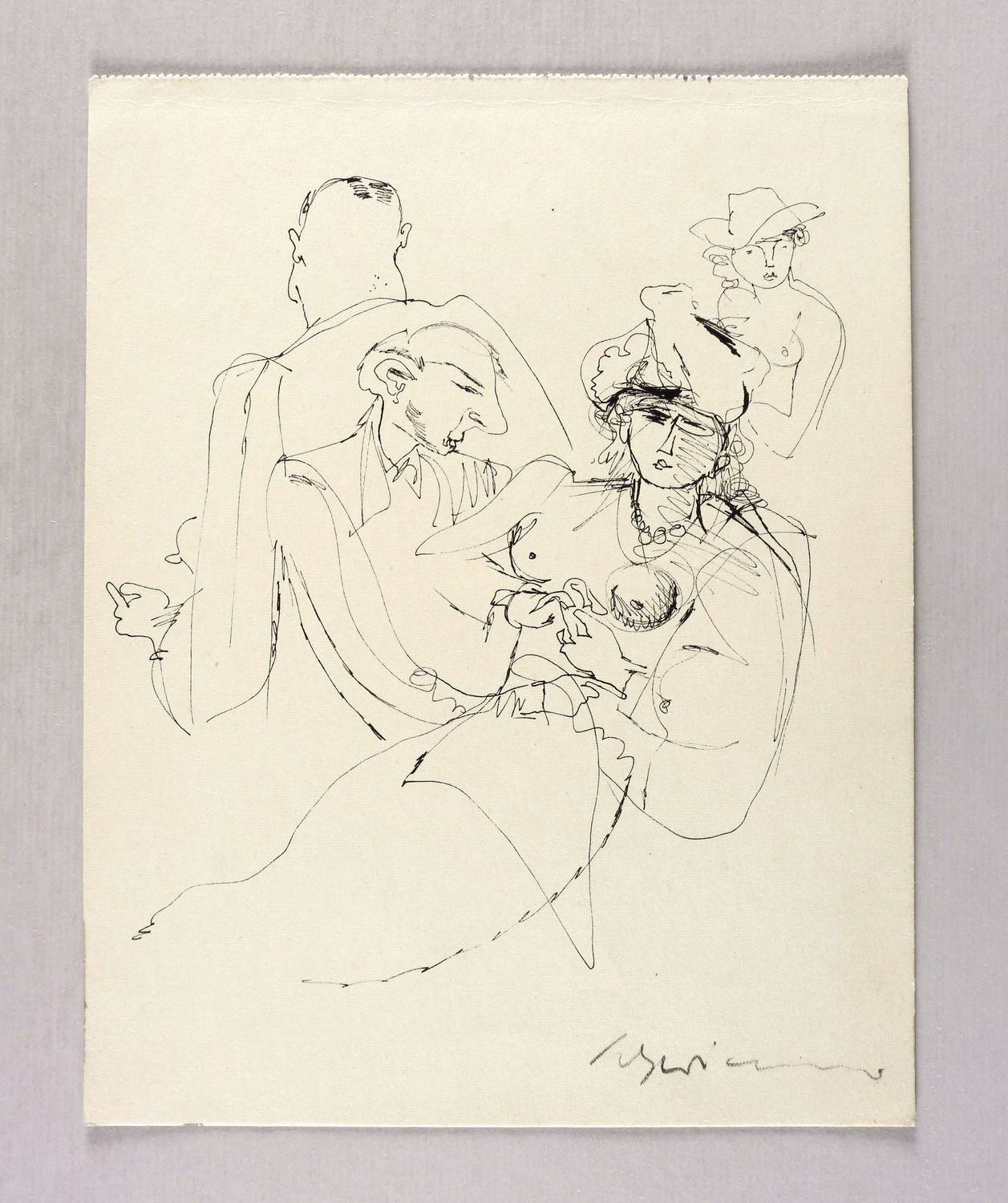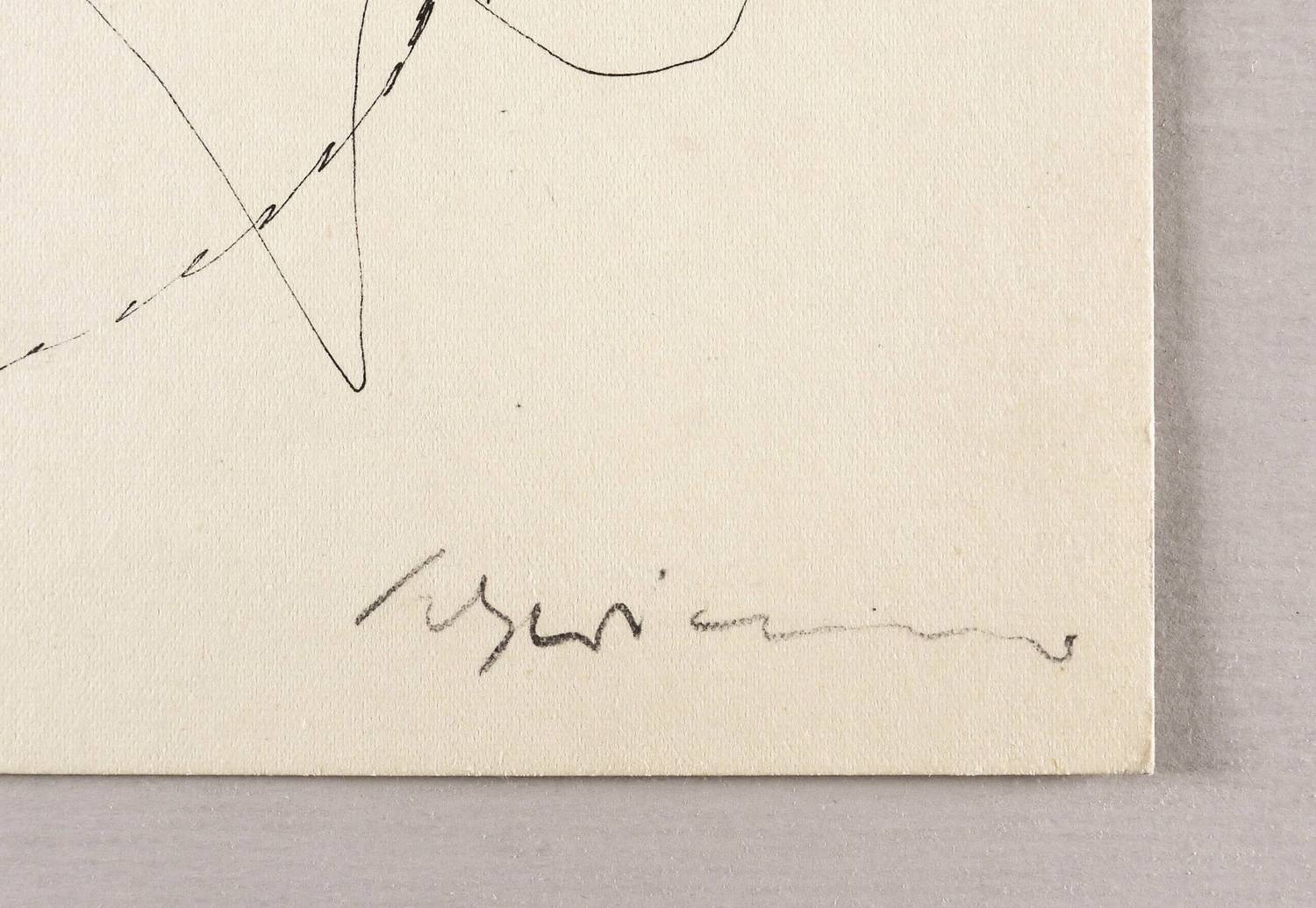 Um 1940. Zeichnung / Federzeichnung, in schwarzer Tusche, auf hellgelbem Velinkarton. – Originale Künstlergrafik, von Max Schwimmer. – Unikat. – 23,4 x 18,5 cm (Blatt), 18,2 x 16,5 cm (Darstellung).