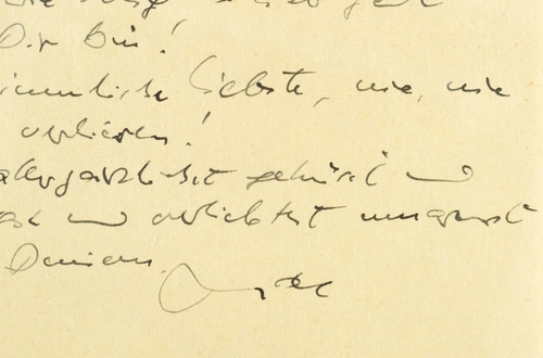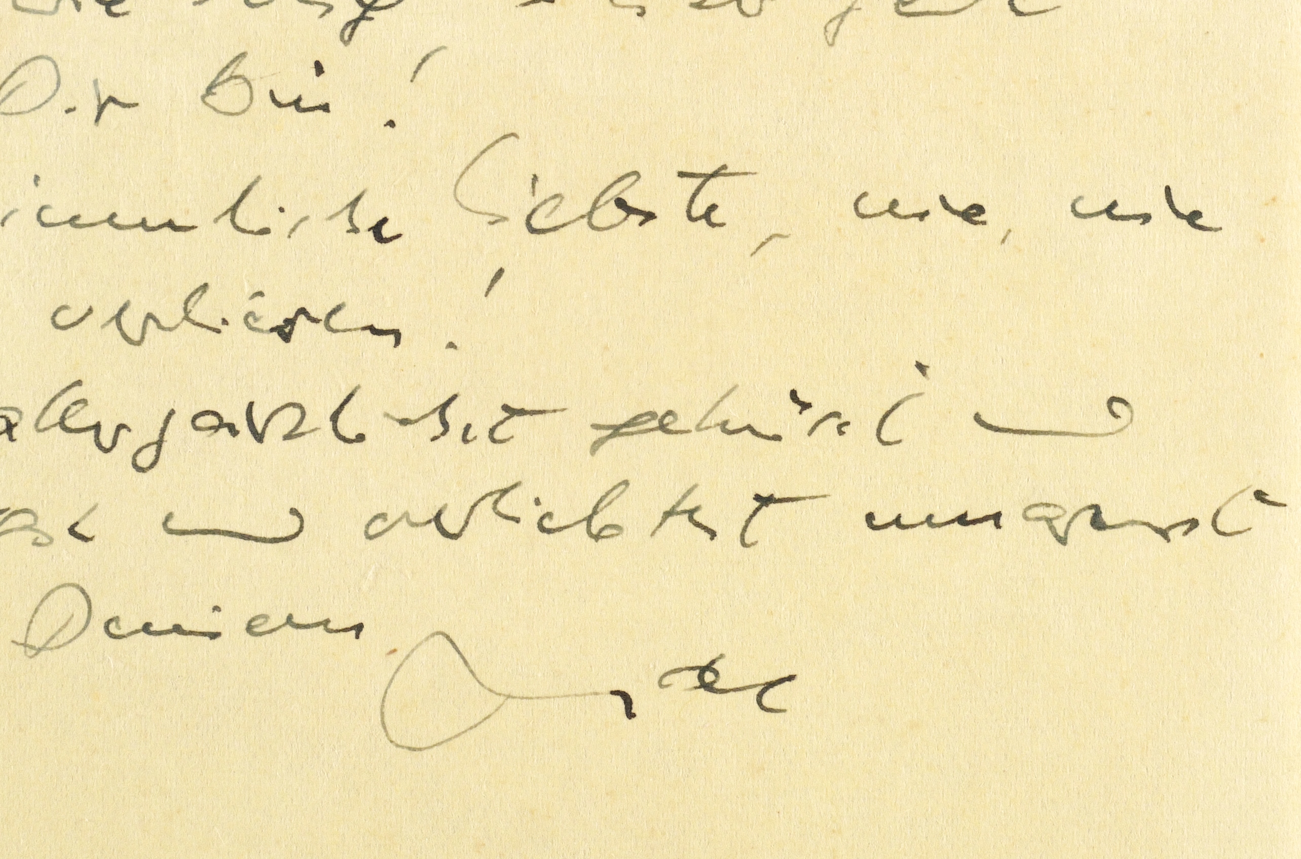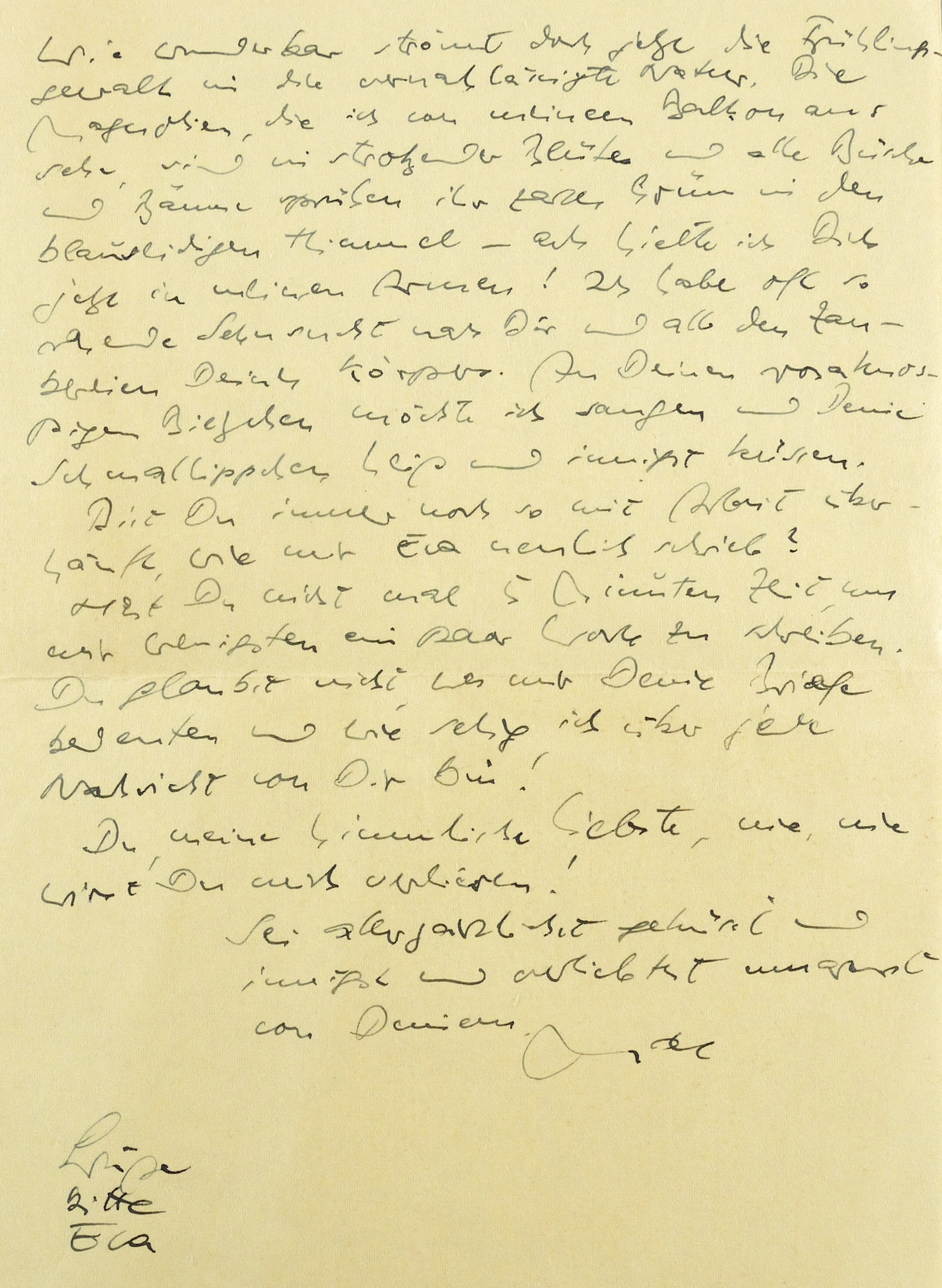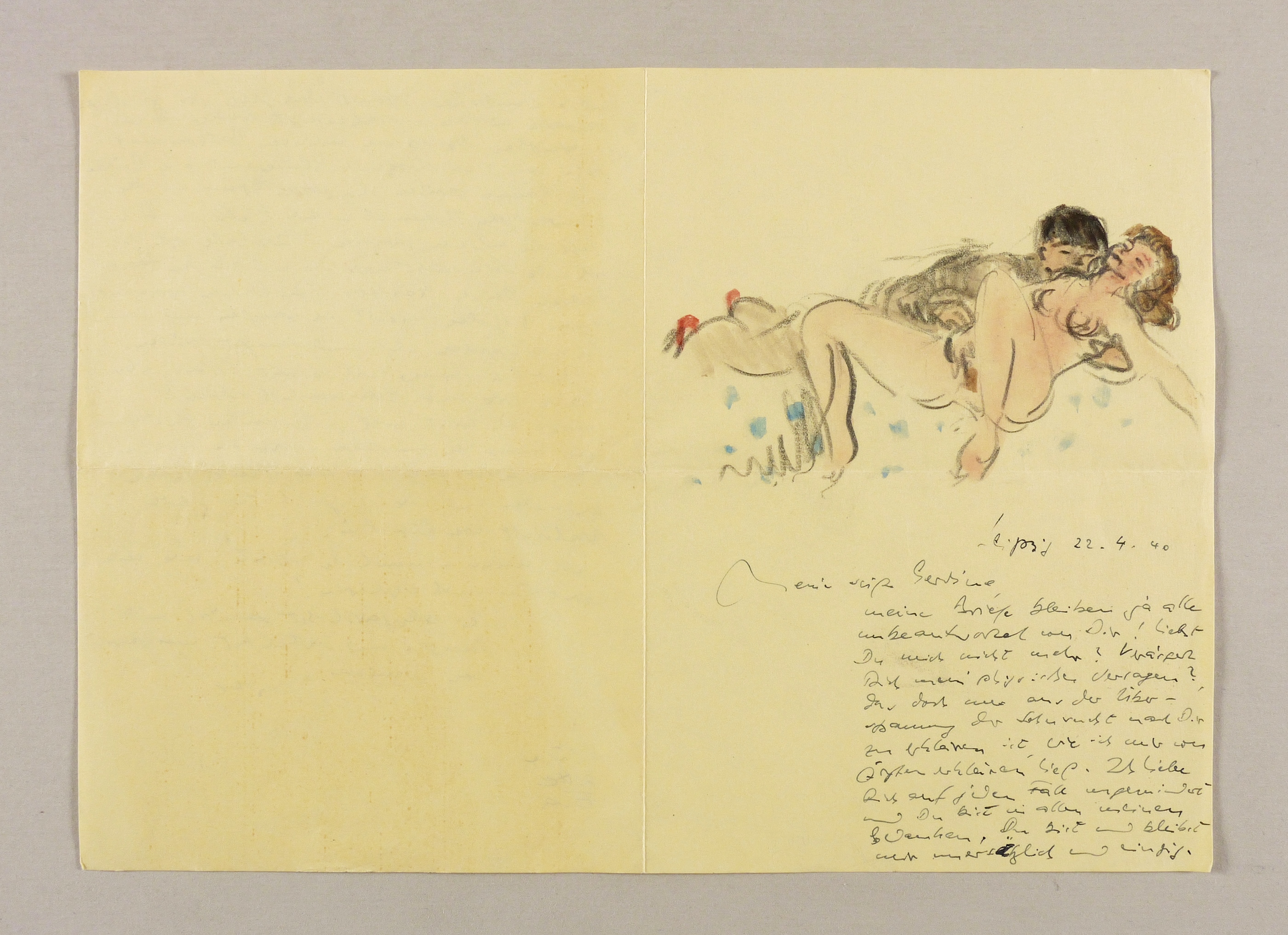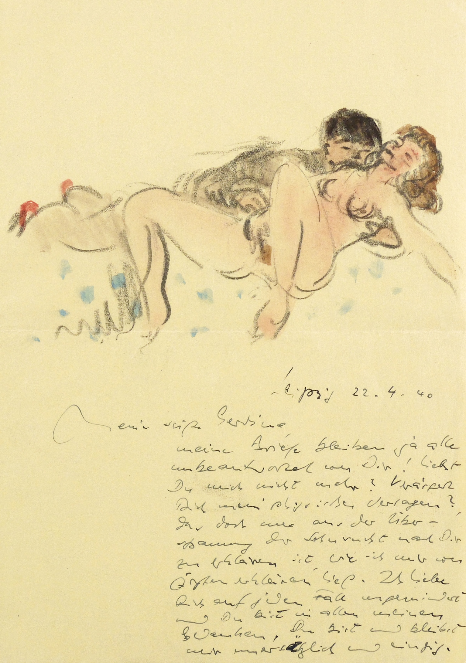 Dazu in dunkelblauer Feder Brief an Gerda (Gerdine) Schimpf in Berlin: ″Leipzig 22.4.40 / Meine süße Gerdine, / meine Briefe bleiben ja alle unbeantwortet von Dir! Liebst Du mich nicht mehr? Verärgert Dich mein physisches Versagen?, das doch nur aus der Überspannung der Sehnsucht nach Dir zu erklären ist, wie ich mir von Ärzten erklären ließ. Ich liebe Dich auf jeden Fall ungemindert und Du bist in allen meinen Gedanken. Du bist und bleibst mir unersetzlich und einzig. // Wie wunderbar strömt doch jetzt die Frühlingsgewalt in die vernachlässigte Natur. Die Magnolien, die ich von meinem Balkon aus sehe, sind in strotzender Blüte und alle Büsche und Bäume sprühen ihr zartes Grün in den blaustichigen Himmel – ach hielte ich Dich jetzt in meinen Armen! Ich habe oft so rasende Sehnsucht nach Dir und all den Zaubereien Deines Körpers. An Deinen rosaknospigen Biezchen möchte ich saugen und Deine Schmallippchen heiß und innigst küssen. / Bist Du immer noch so mit Arbeit überhäuft, wie mir Eva neulich schrieb? / Hast Du nicht mal 5 Minuten Zeit, um mir wenigstens ein paar Worte zu schreiben. Du glaubst nicht, was mir Deine Briefe bedeuten und wie selig ich über jede Nachricht von Dir bin! / Du meine himmlische Liebste, nie, nie wirst Du mich verlieren! / Sei allerzärtlichst geküsst und innigst und verliebtest umarmt von Deinem Max // Grüße bitte Eva″. – Provenienz: Privatbesitz Berlin, aus dem Nachlass der Berliner Fotografin Gerda Schimpf (1913-2014). – Originale Brieffalten über Kreuz weitgehend geglättet. Sehr guter Zustand.