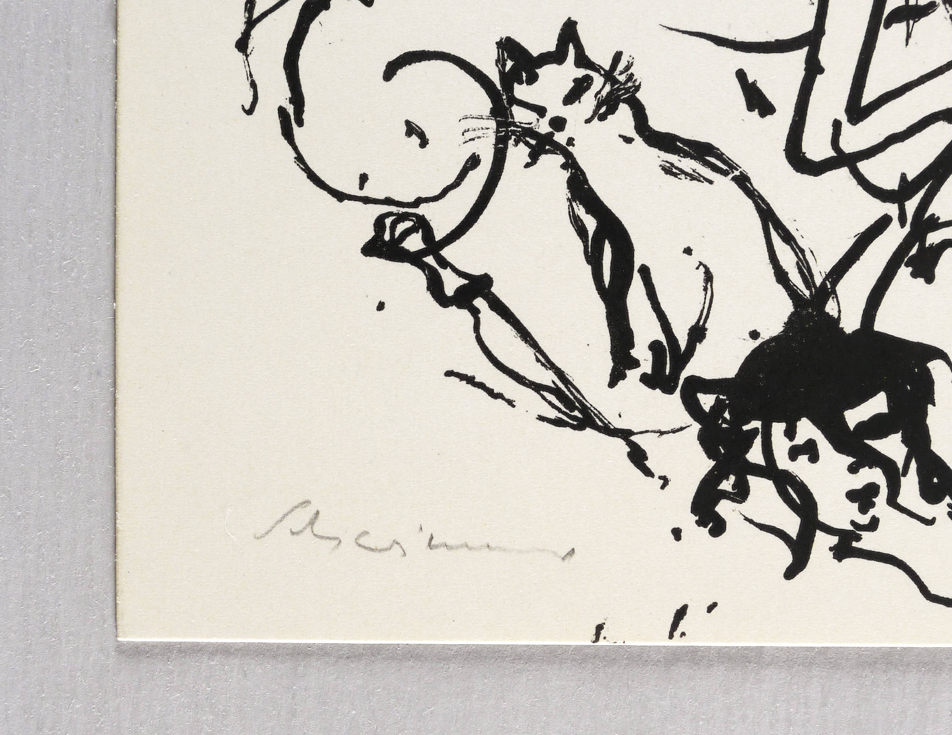 1957. Lithografie / Pinsellithografie, in Schwarz, auf glattem gelbem Kupferdruckkarton. – Originale Künstlergrafik, von Max Schwimmer. – 14,8 x 21,2 cm (Darstellung / Blatt).