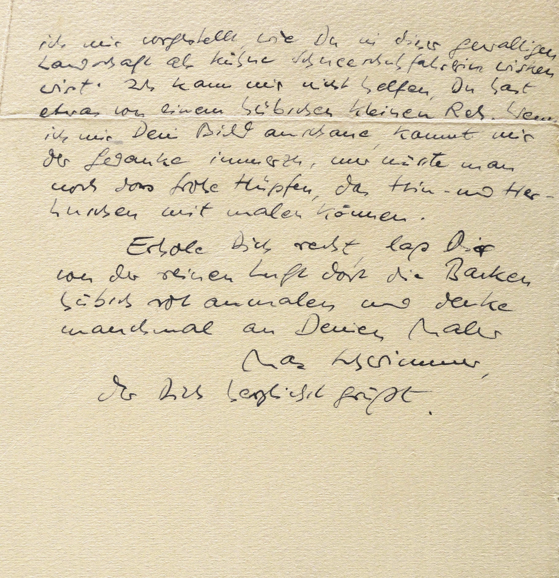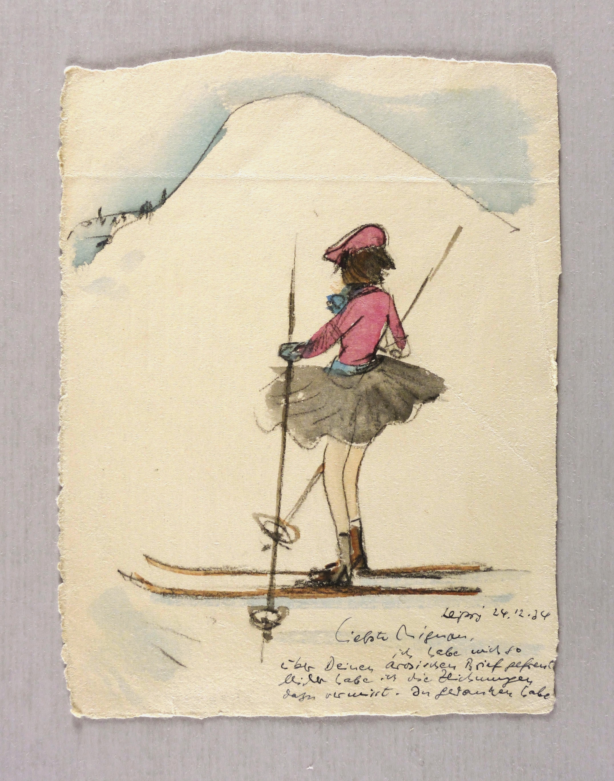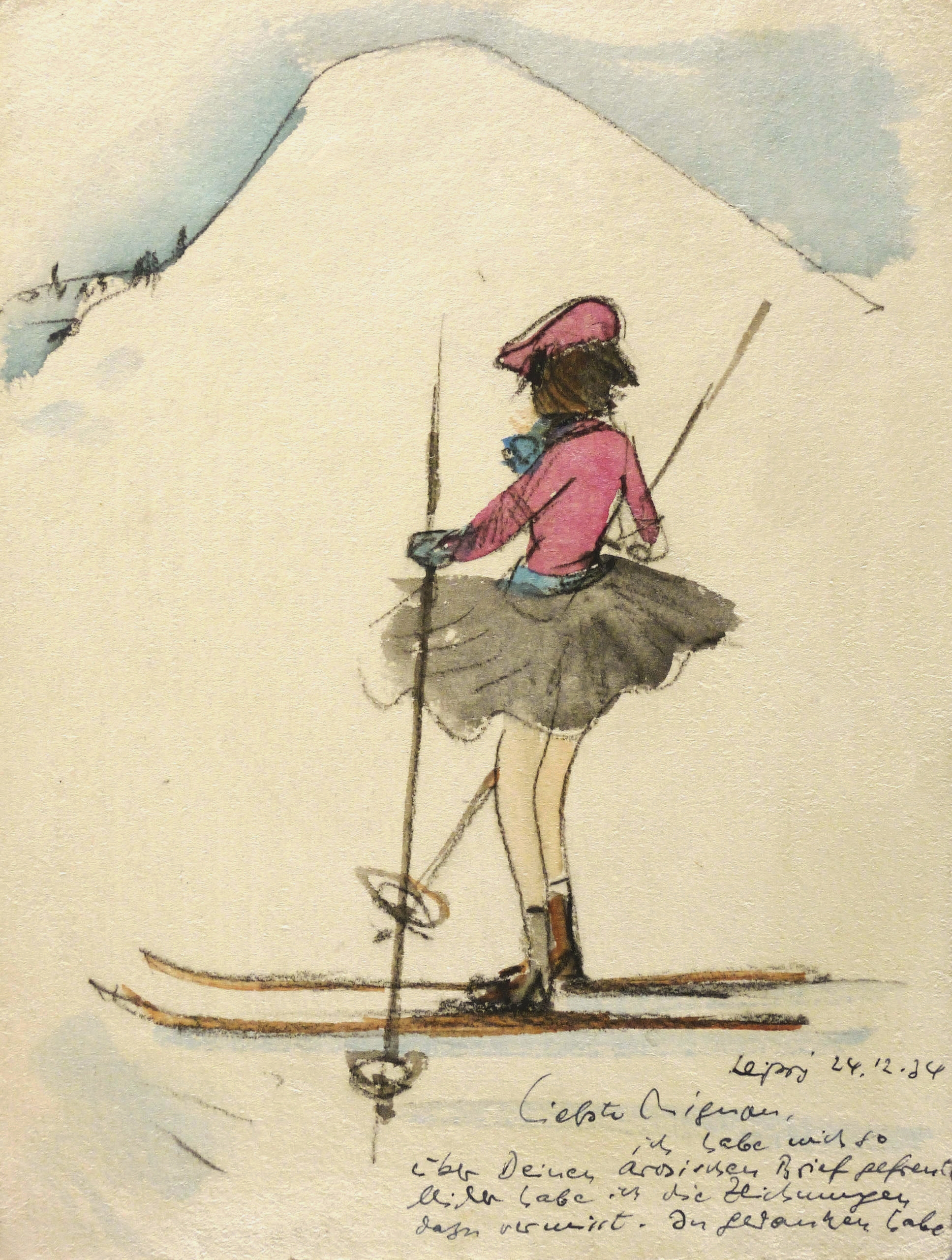 Daneben und rückseitig in schwarzer Feder Gruß an Mignon Rosenfelder: ″Leipzig 24.12.34 / Liebste Mignon, / ich habe mich so / über Deinen arosischen [Arosa] Brief gefreut / leider habe ich die Zeichnungen / dazu vermisst. In Gedanken habe // ich mir vorgestellt, wie Du in dieser gewaltigen / Landschaft als kühne Schneeschuhfahrerin wirken / wirst. Ich kann mir nicht helfen, Du hast / etwas von einem hübschen kleinen Reh. Wenn / ich mir Dein Bild anschaue, kommt mir / der Gedanke immerzu, nur müsste man / noch das frohe Hüpfen, das Hin- und Her- / huschen mit malen können. / Erhole Dich recht, laß Dir / von der reinen Luft dort die Backen / hübsch rot anmalen und denke / manchmal an Deinen Maler / Max Schwimmer, / der Dich herzlichst grüßt″. – Provenienz: Familie Rosika, Felix und Mignon Rosenfelder, Leipzig. – Originale horizontale Knickfalte im oberen Bereich. Geringfügig knickspurig. Noch guter Zustand.