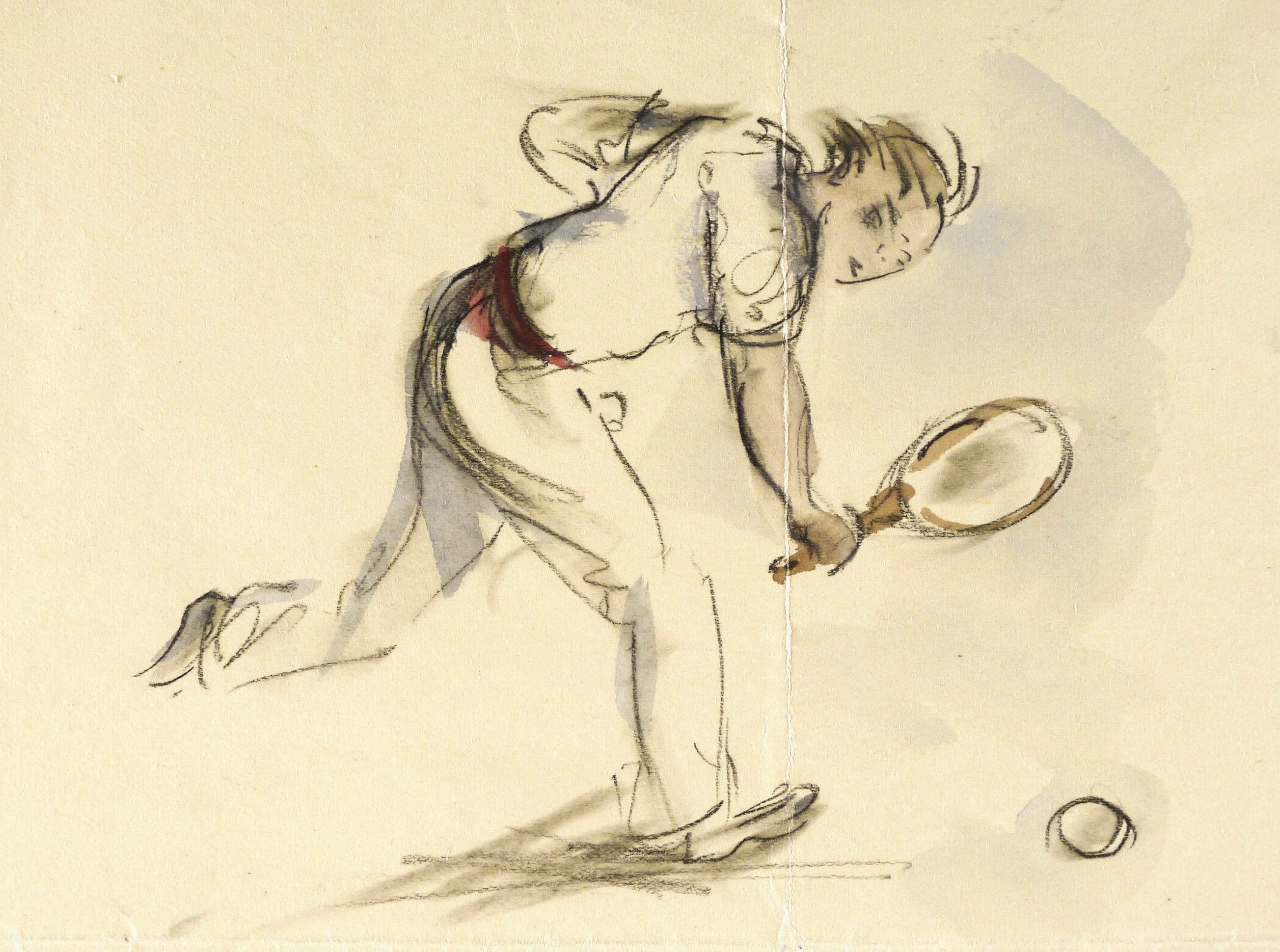 Dazu in schwarzer Feder Gruß an Felix Rosenfelder in Leipzig: ″Lieber Herr Felix R. / ich hörte von / Ihrem schmerzlichen Handicap beim / Tennis. Hoffentlich ist die Schluß- / vignette nur eine vorübergehende Tat- / sache Ihres Zustandes gewesen. Meine / tennissportliche Unerfahrenheit macht / Ihnen die gutgemeinten Zeichnungen / hoffentlich nicht zu einem Greuel. / Alle guten Wünsche für Ihre / Gesundheit. / Ihr dankbarer / M Schwimmer″. – Provenienz: Familie Rosika, Felix und Mignon Rosenfelder, Leipzig. – Originale vertikale und horizontale Knickfalten weitgehend geglättet. Guter Zustand.