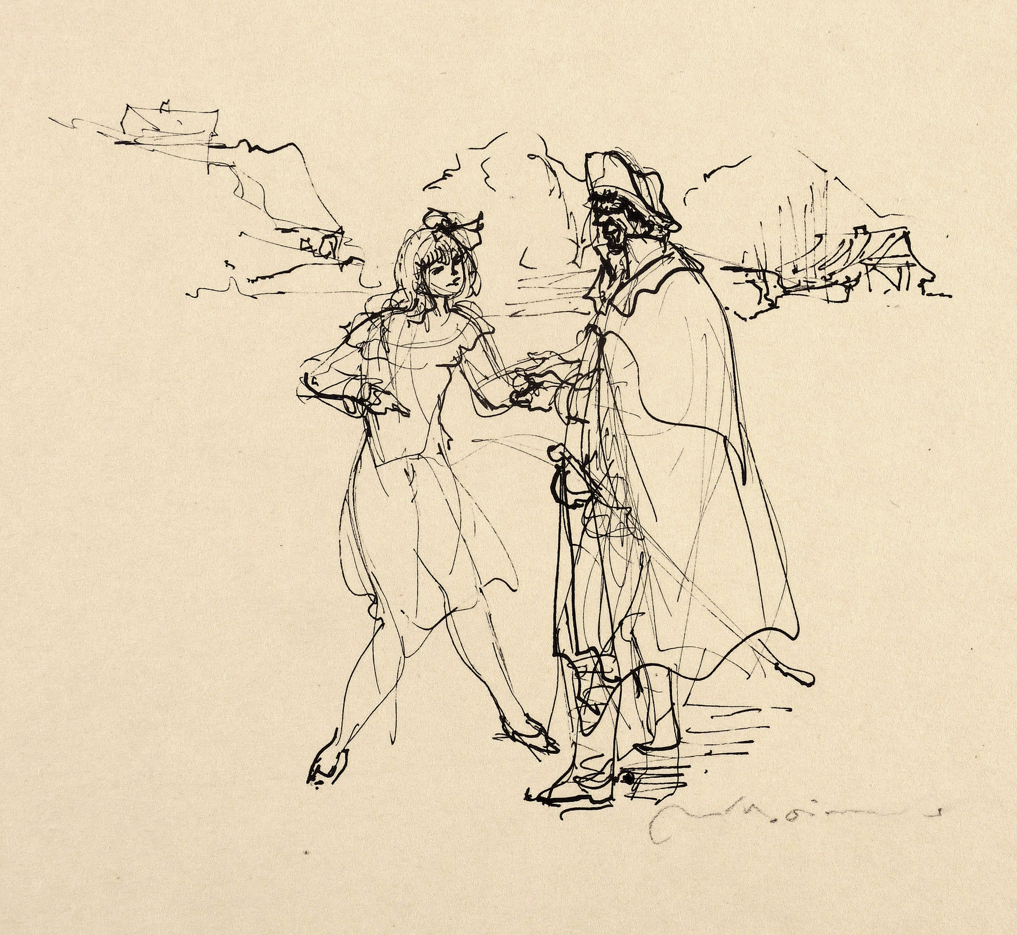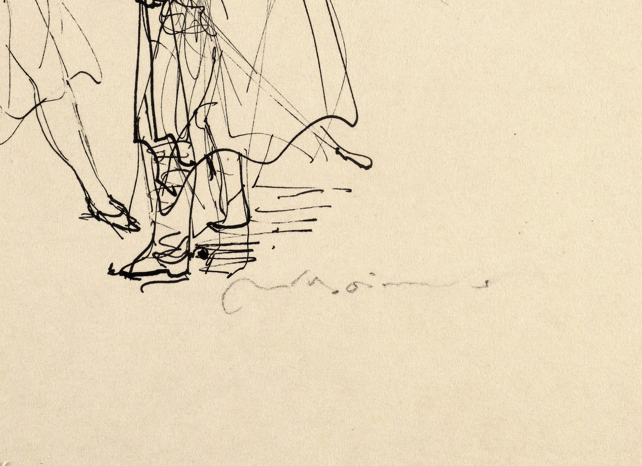 Um 1955. Zeichnung / Federzeichnung, in schwarzer Tusche, auf gelbem Velinkarton. – Originale Künstlergrafik, von Max Schwimmer. – Unikat. – 10,5 x 13,2 cm (Darstellung), 19 x 26 cm (Blatt).