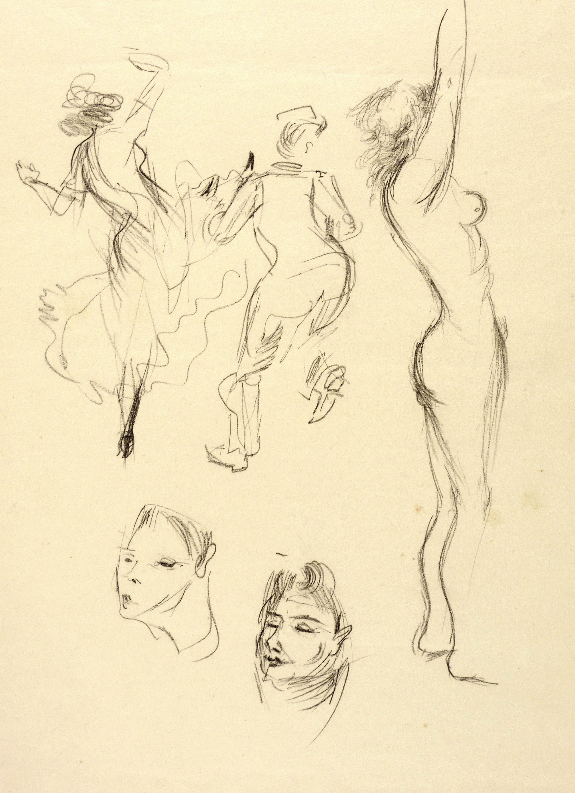Nicht handsigniert. – Auf der Rückseite diverse Kreide- Zeichnungen mit einem tanzenden Paar, einem stehenden Frauenakt und zwei Köpfen. – Provenienz: aus dem Nachlass von Herta Günther, die 1951-57 an der Dresdner Kunstakademie bei Max Schwimmer studierte. – Guter Zustand.