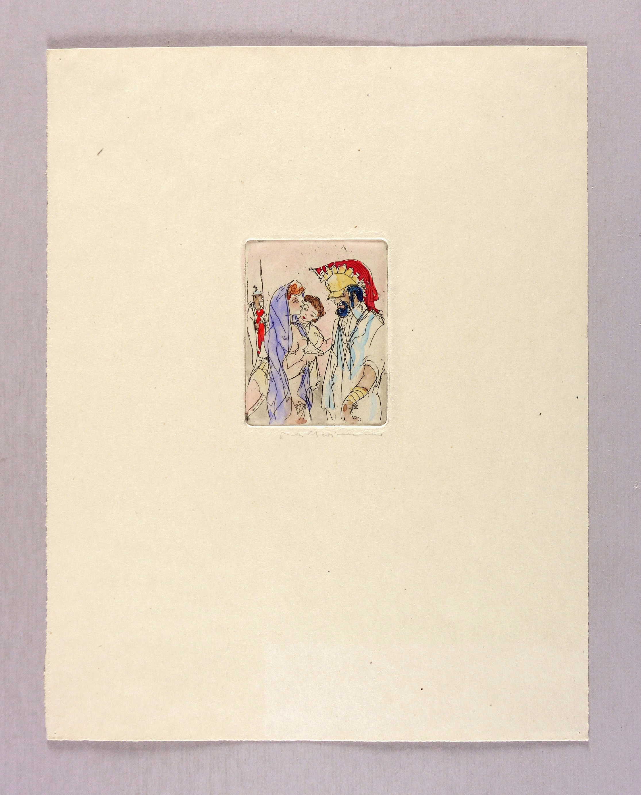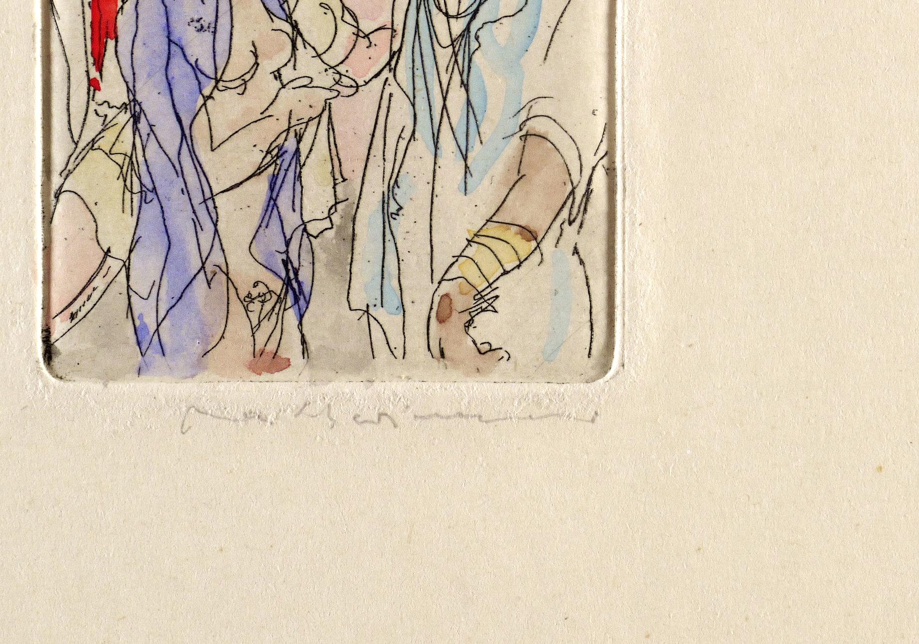 1953-1958. Radierung / Strichätzung, in Schwarz, aquarelliert, auf hellgelbem Velinkarton. – Originale Künstlergrafik, von Max Schwimmer. – 8,1 x 6,2 cm (Darstellung / Platte), 30 x 24 cm (Blatt).