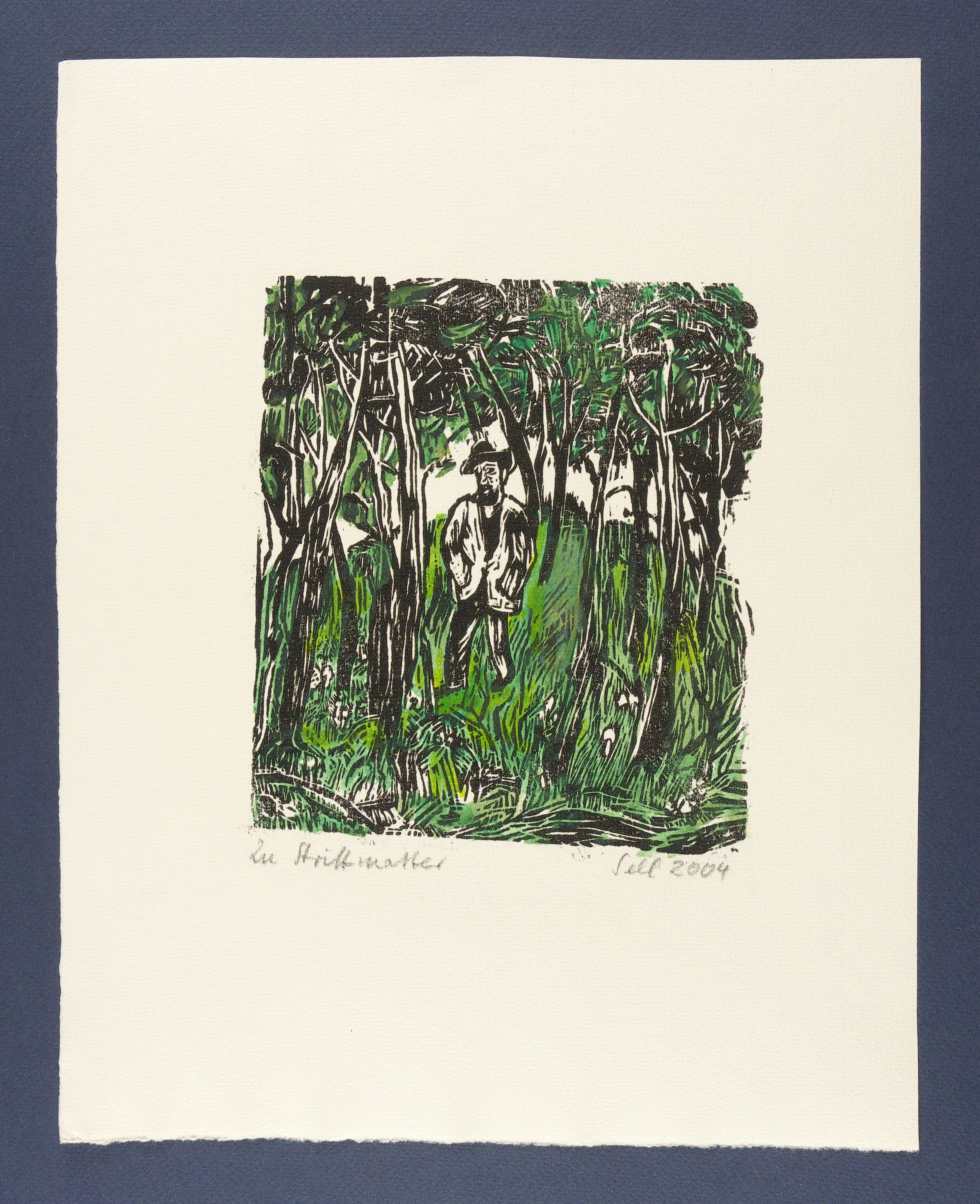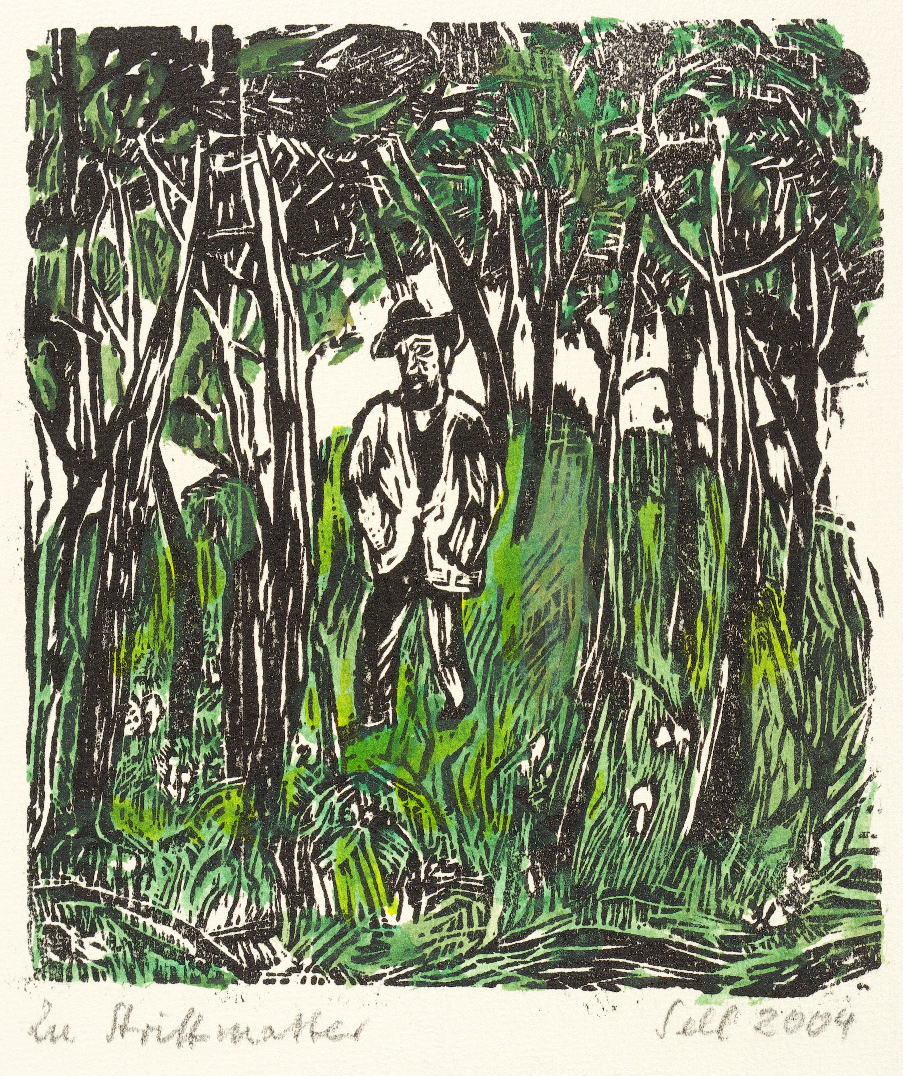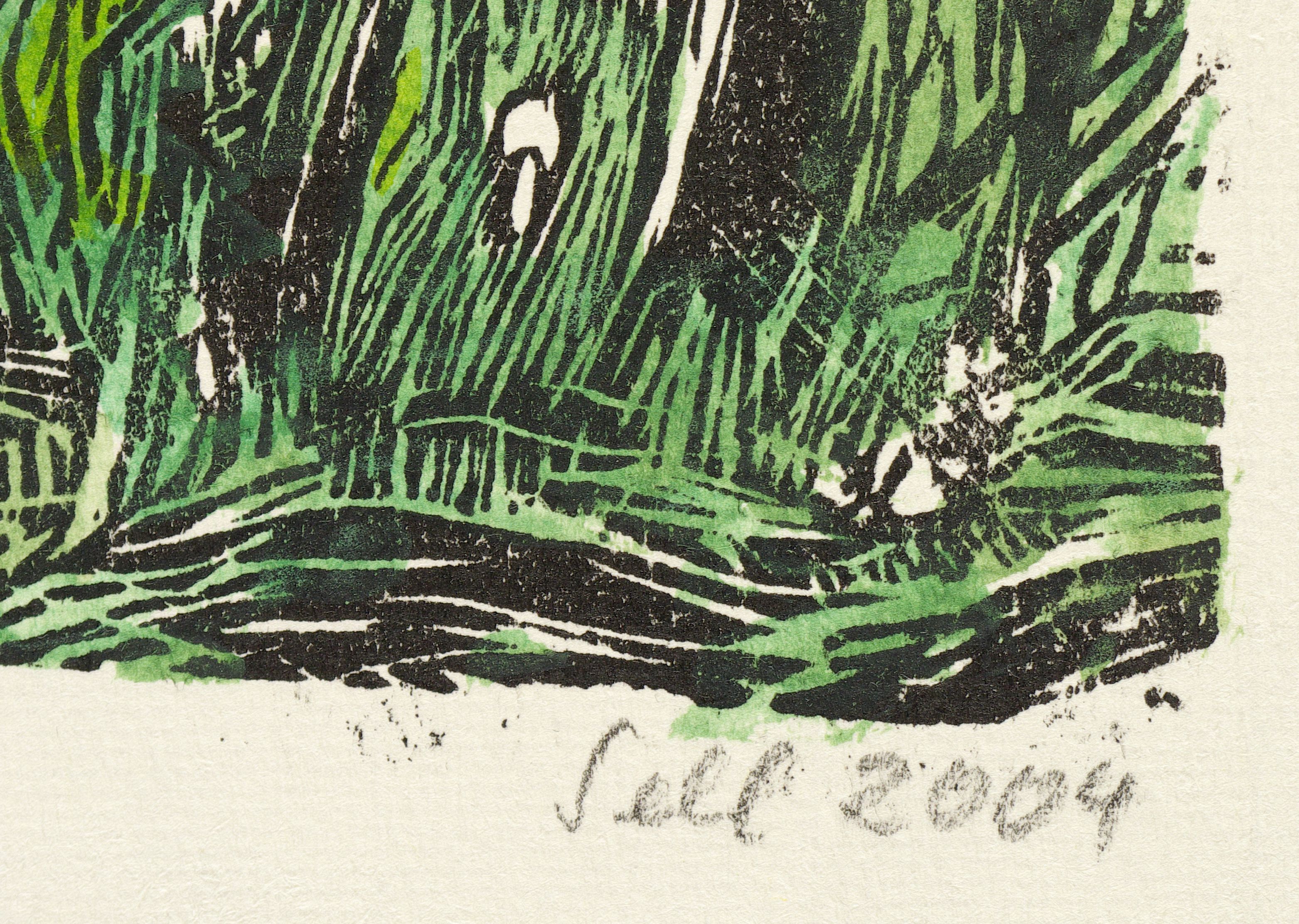 2004. Farbholzschnitt, in Grün & Schwarz, auf hellem Velin. – Originale Künstlergrafik, von Lothar Sell. – 16,8 x 14,0 cm (Darstellung / Druckstock), 32 x 25,5 cm (Blatt).