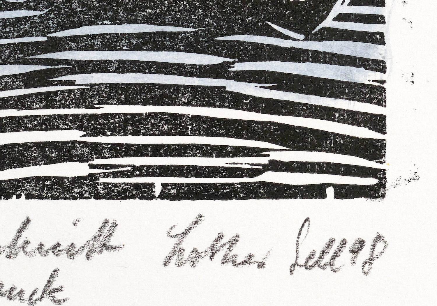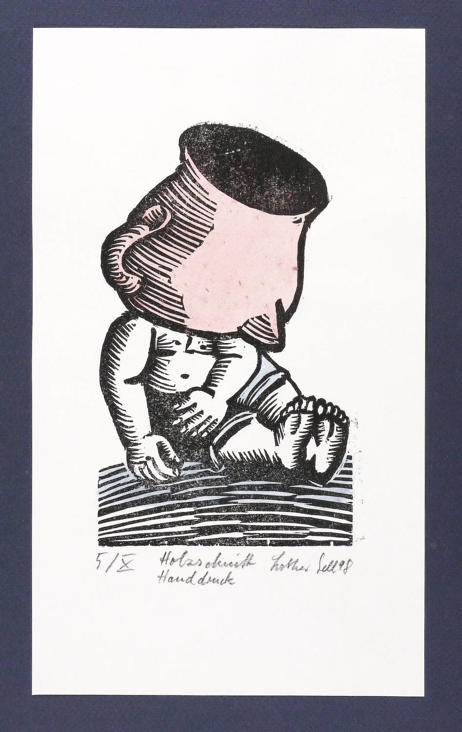 1998. Holzschnitt, in Schwarz, aquarelliert, auf weißem Velinkarton. – Originale Künstlergrafik, von Lothar Sell. – Auflage Exemplar Nr. 5/10. – 18,0 x 10,8 cm (Darstellung), 28 x 17 cm (Blatt).