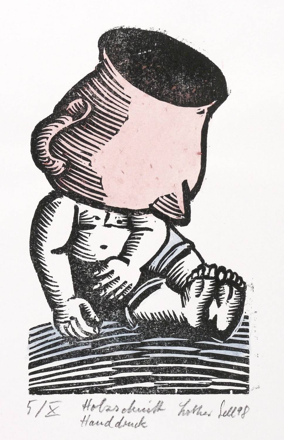 Lothar Sell (1939 Teuenbrietzen - 2009 Meißen). Deutscher Grafiker, Illustrator und Keramiker. 1957-63 Studium an der Hochschule für Bildende Künste Dresden (HfBK), bei Hans Theo Richter und Max Schwimmer. 1966-69 Meisterschüler an der Akademie der Künste Berlin (AdK). 1974-88 Lehrauftrag an der Burg Giebichenstein Hochschule für Kunst und Design in Halle. Mitglied im Verband Bildender Künstler der DDR. Seine Grafiken und Plastiken sind oft geprägt von einem humorigen "bäuerlichen" Charakter. Stilistisch dominiert deshalb eine oft derbe, zumeist auch naive Anmutung. 1976 Illustrationen zu Erwin Strittmatters "Ochsenkutscher". Die Leibesfülle, typisch für Sells Darstellung des menschlichen Körpers, charakterisiert u.a. die Keramiken des Brunnen im Meißner Zollhof.