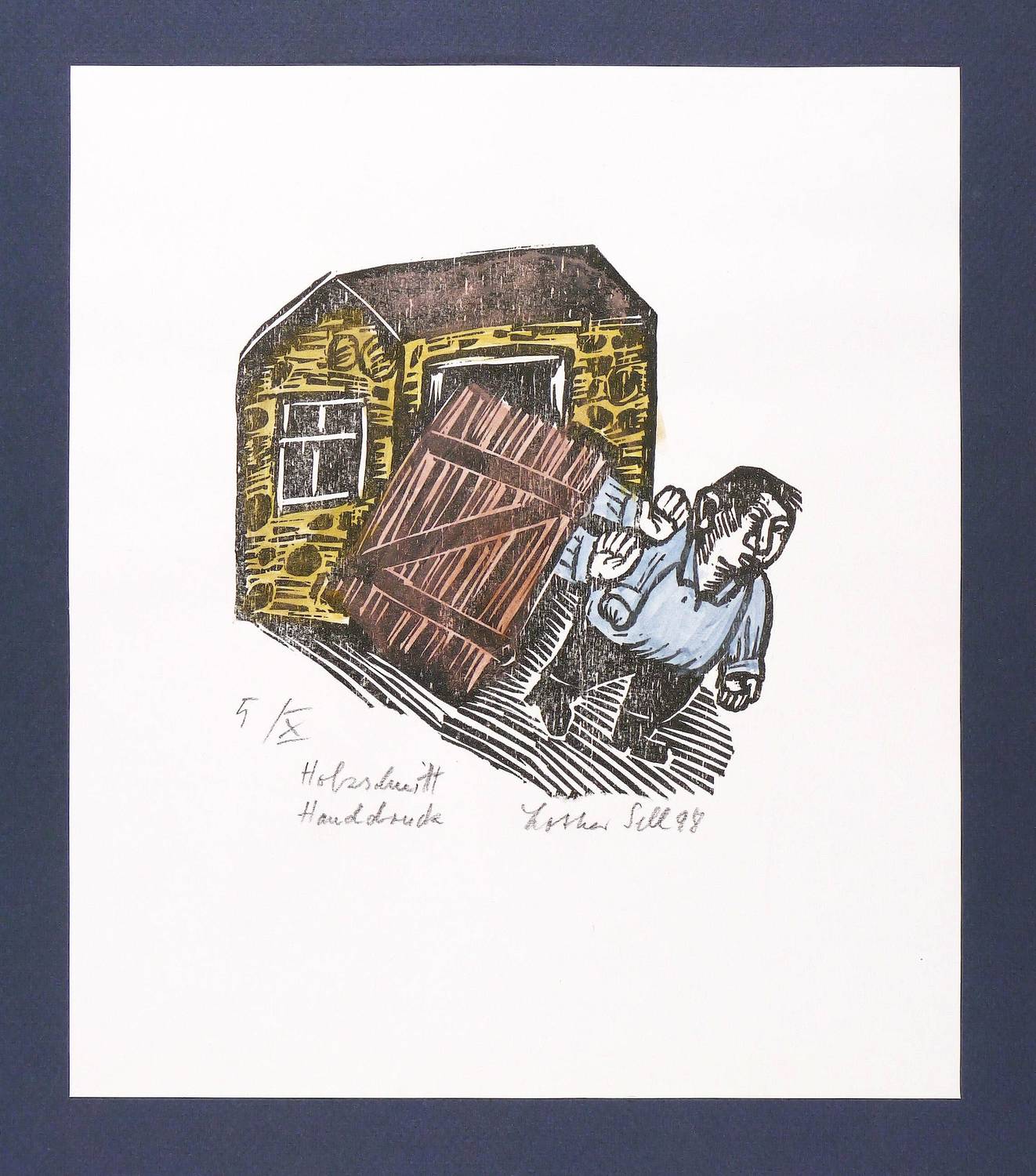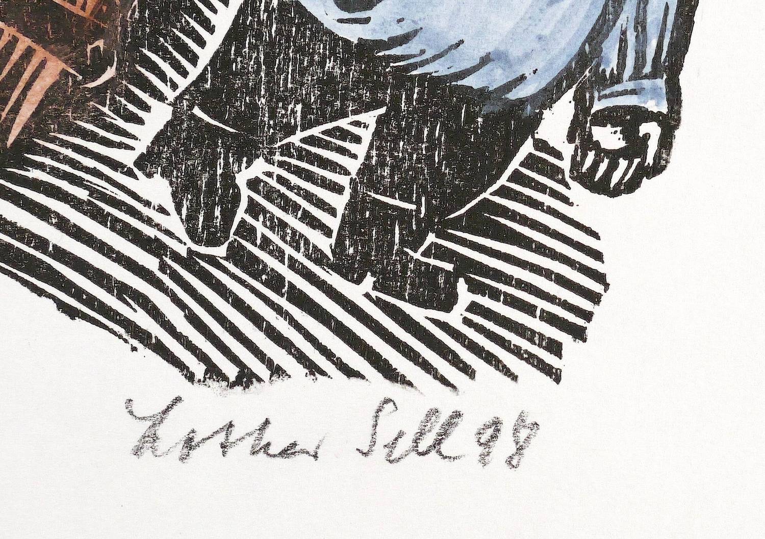 1998. Holzschnitt, in Schwarz, in Aquarellfarben koloriert, auf weißem Karton. – Originale Künstlergrafik, von Lothar Sell. – Auflage Exemplar Nr. 5/10. – 14,9 x 15,2 cm (Darstellung), 28 x 24 cm (Blatt).