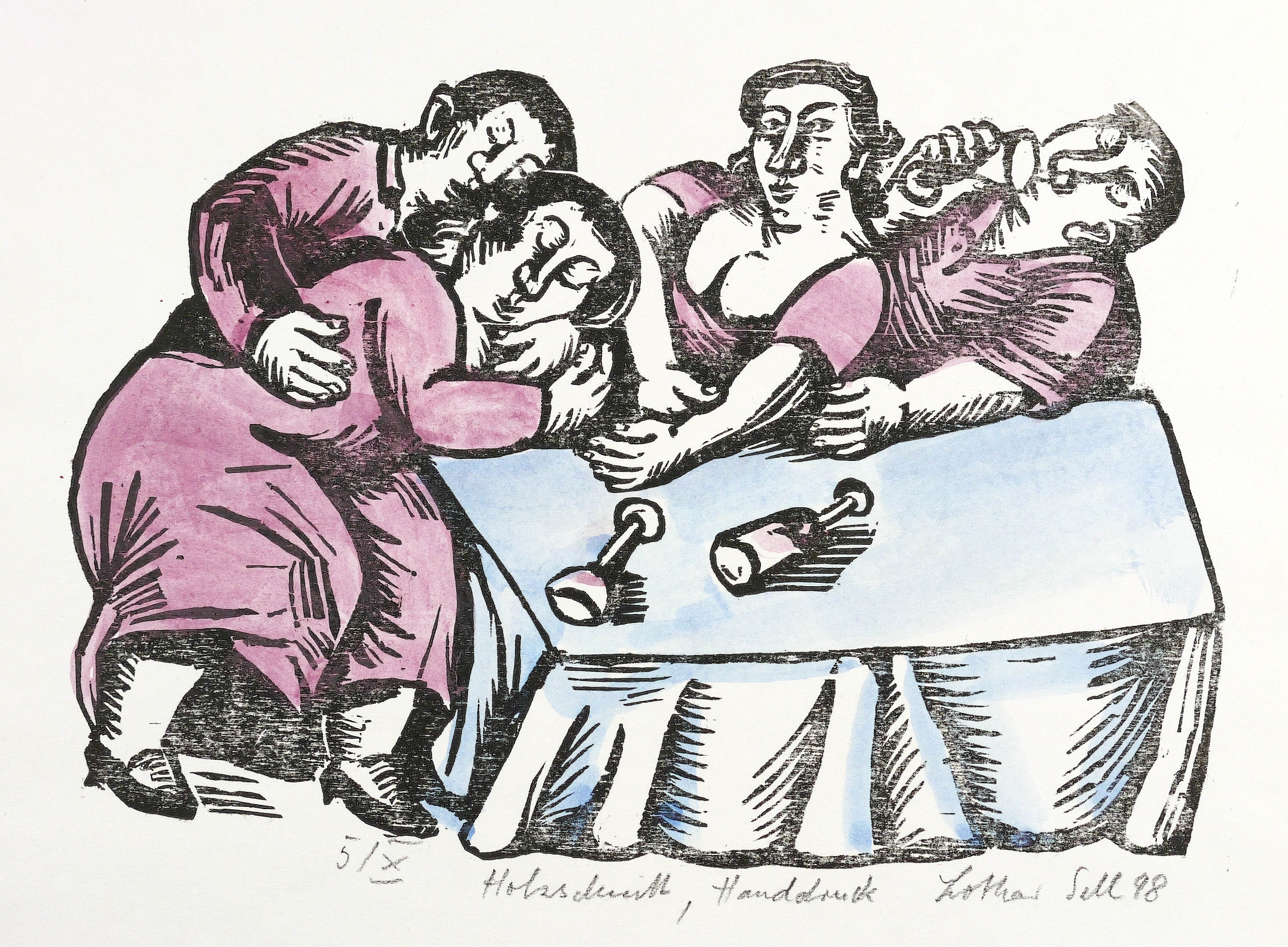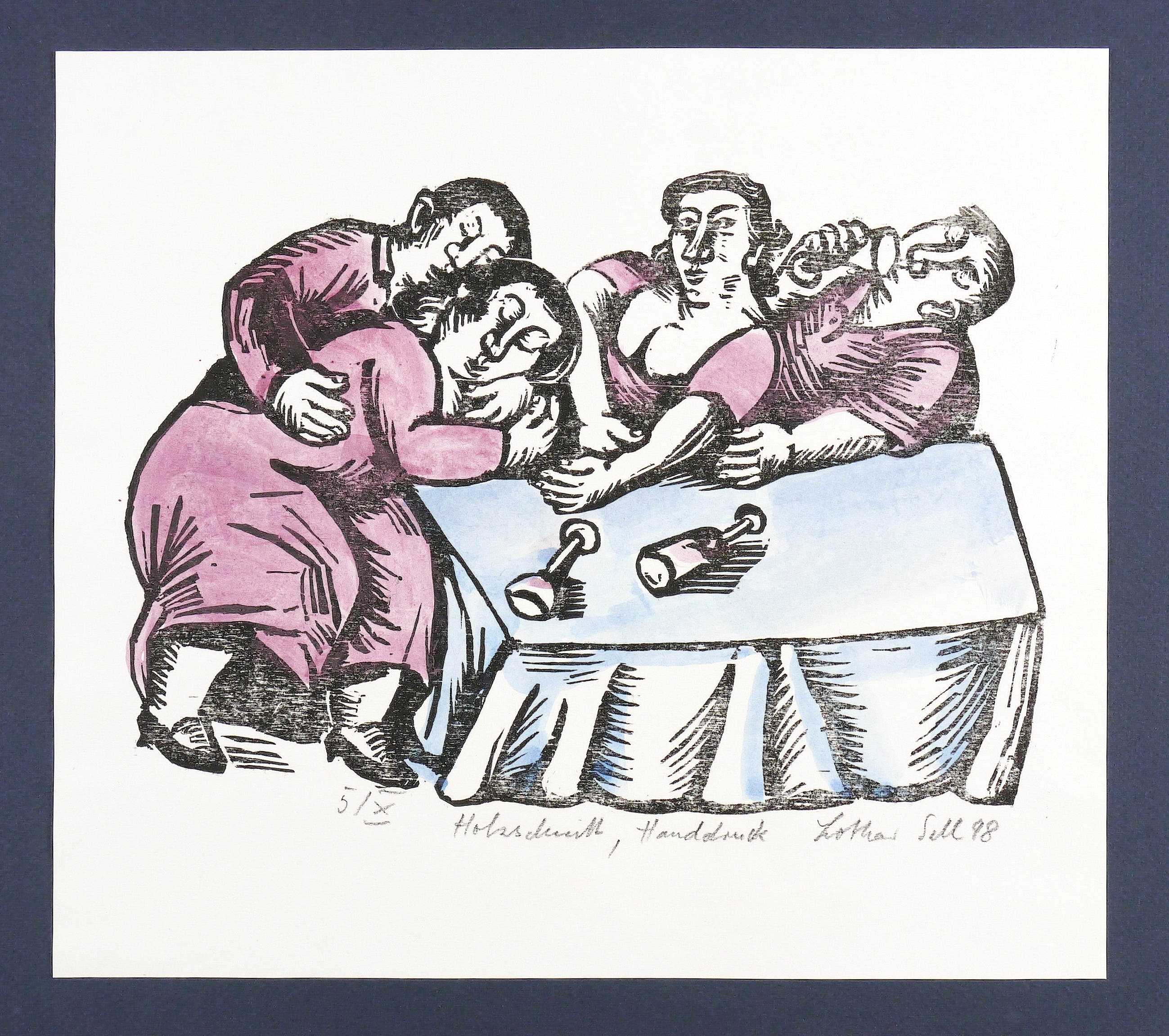 1998. Holzschnitt, in Schwarz, aquarelliert, auf weißem Velin. – Originale Künstlergrafik, von Lothar Sell. – Auflage Exemplar Nr. 5/10. – 18,2 x 25,8 cm (Darstellung), 26 x 30 cm (Blatt).