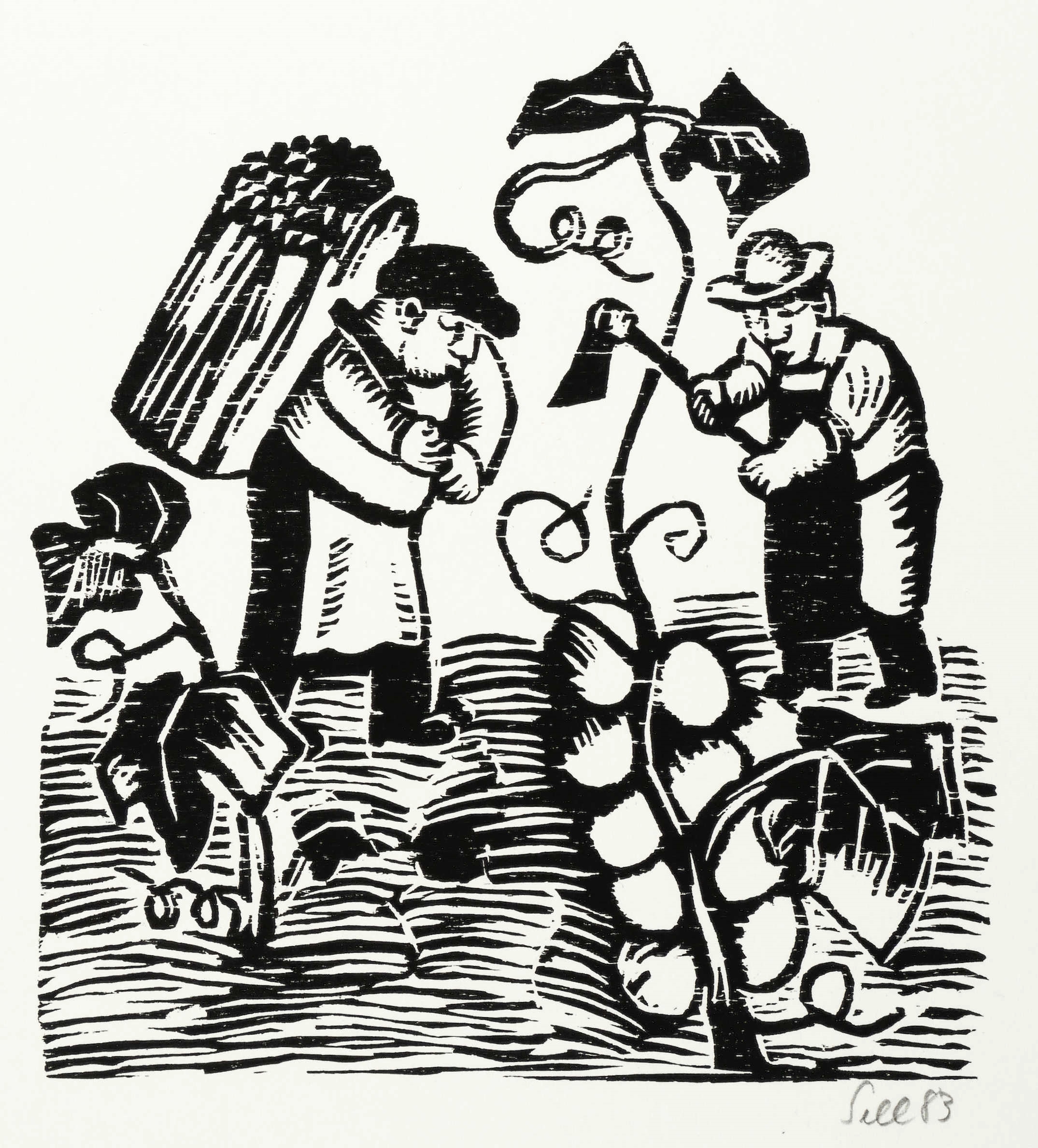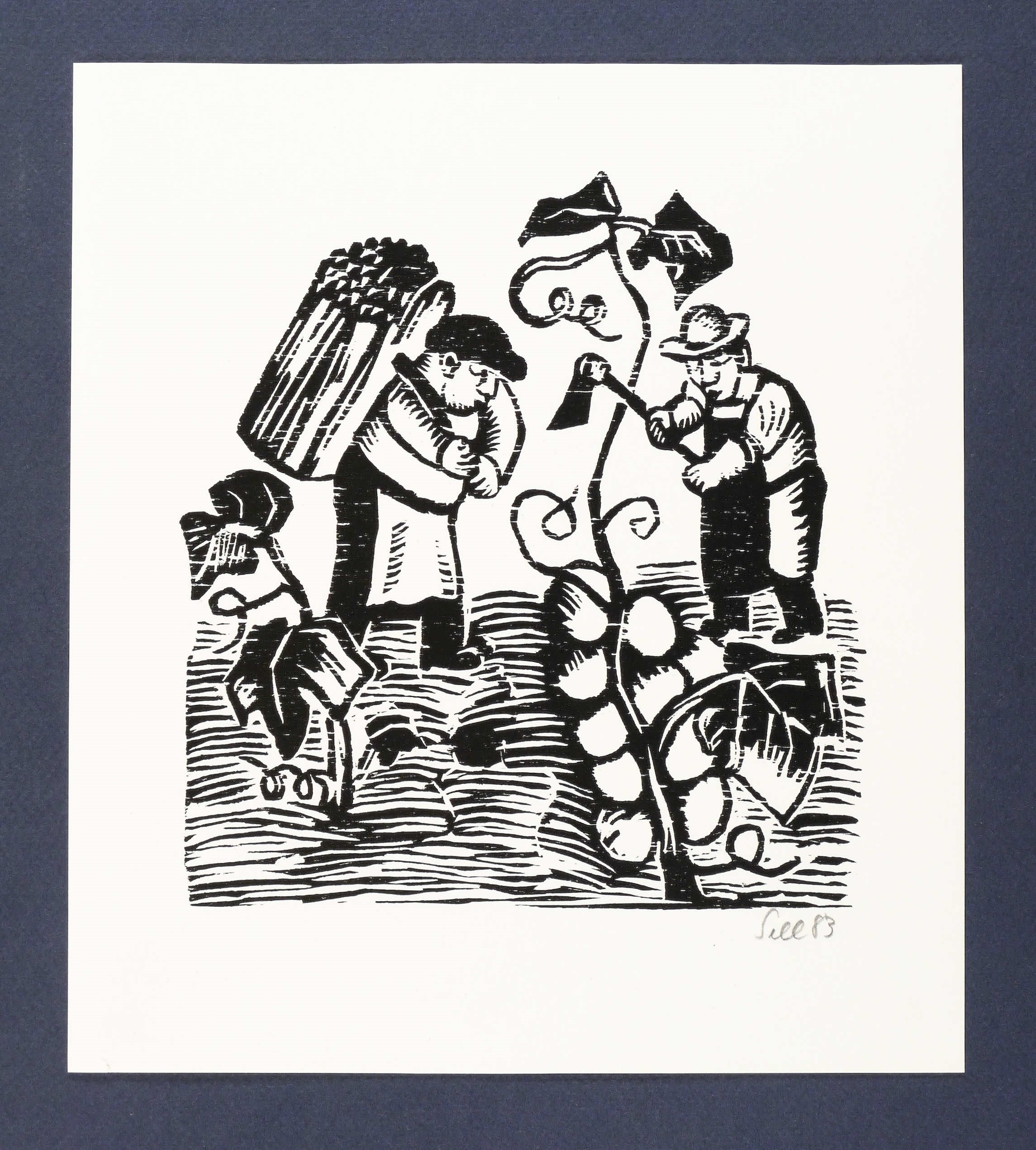 1983. Holzschnitt, in Schwarz, auf weißem Karton. – Originale Künstlergrafik, von Lothar Sell. – 18,2 x 16,7 cm (Darstellung), 25 x 22 cm (Blatt).
