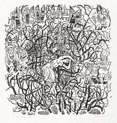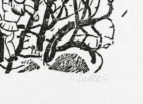Aus: Lothar Sell, Grimms Märchen. 13. Druck der Kabinettpresse (Berlin: Kabinettpresse 1969). – Rechts unten in Bleistift signiert und datiert: ″L. Sell 69″. Links Titel. – Sehr gut erhalten. Schönes Exemplar.