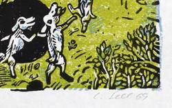 Aus: Lothar Sell, Grimms Märchen. 13. Druck der Kabinettpresse (Berlin: Kabinettpresse 1969). – Rechts unten in Bleistift signiert und datiert: ″L. Sell 69″. Links Titel. – Sehr gut erhalten. Schönes Exemplar.
