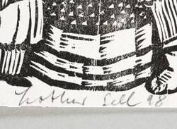 Lothar Sell (1939 Teuenbrietzen - 2009 Meißen). Deutscher Grafiker, Illustrator und Keramiker. 1957-63 Studium an der Hochschule für Bildende Künste Dresden (HfBK), bei Hans Theo Richter und Max Schwimmer. 1966-69 Meisterschüler an der Akademie der Künste Berlin (AdK). 1974-88 Lehrauftrag an der Burg Giebichenstein Hochschule für Kunst und Design in Halle. Mitglied im Verband Bildender Künstler der DDR. Seine Grafiken und Plastiken sind oft geprägt von einem humorigen "bäuerlichen" Charakter. Stilistisch dominiert deshalb eine oft derbe, zumeist auch naive Anmutung. 1976 Illustrationen zu Erwin Strittmatters "Ochsenkutscher". Die Leibesfülle, typisch für Sells Darstellung des menschlichen Körpers, charakterisiert u.a. die Keramiken des Brunnen im Meißner Zollhof.
