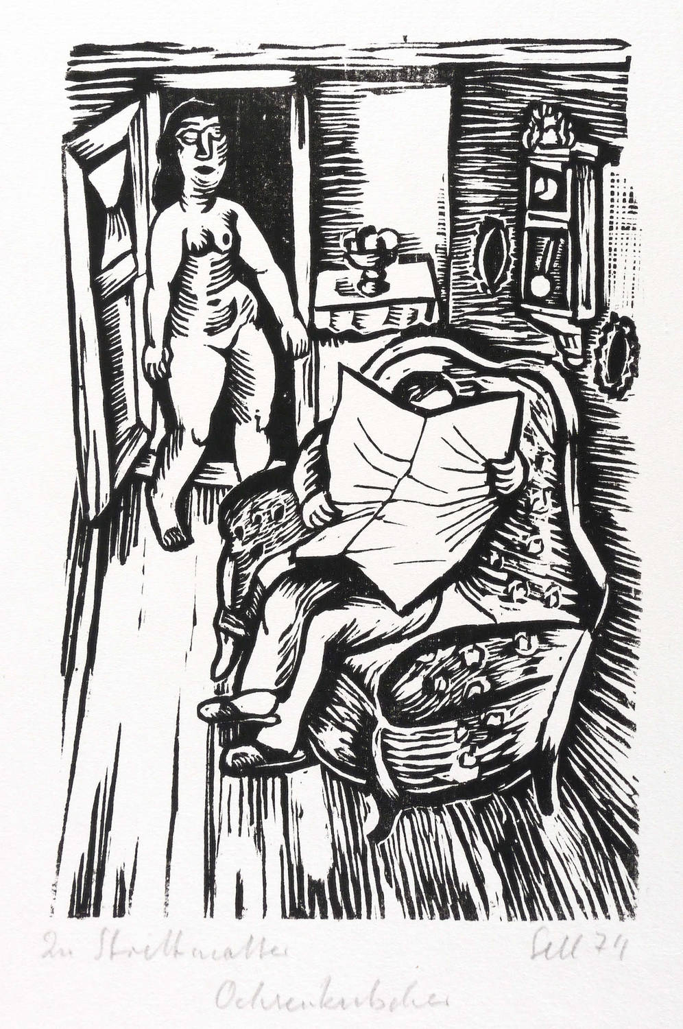 1974. Holzschnitt, in Schwarz, auf rauem weißlichem Velin. – Originale Künstlergrafik, von Lothar Sell. – 20,0 x 13,2 cm (Darstellung / Druckstock), 33 x 23 cm (Blatt).