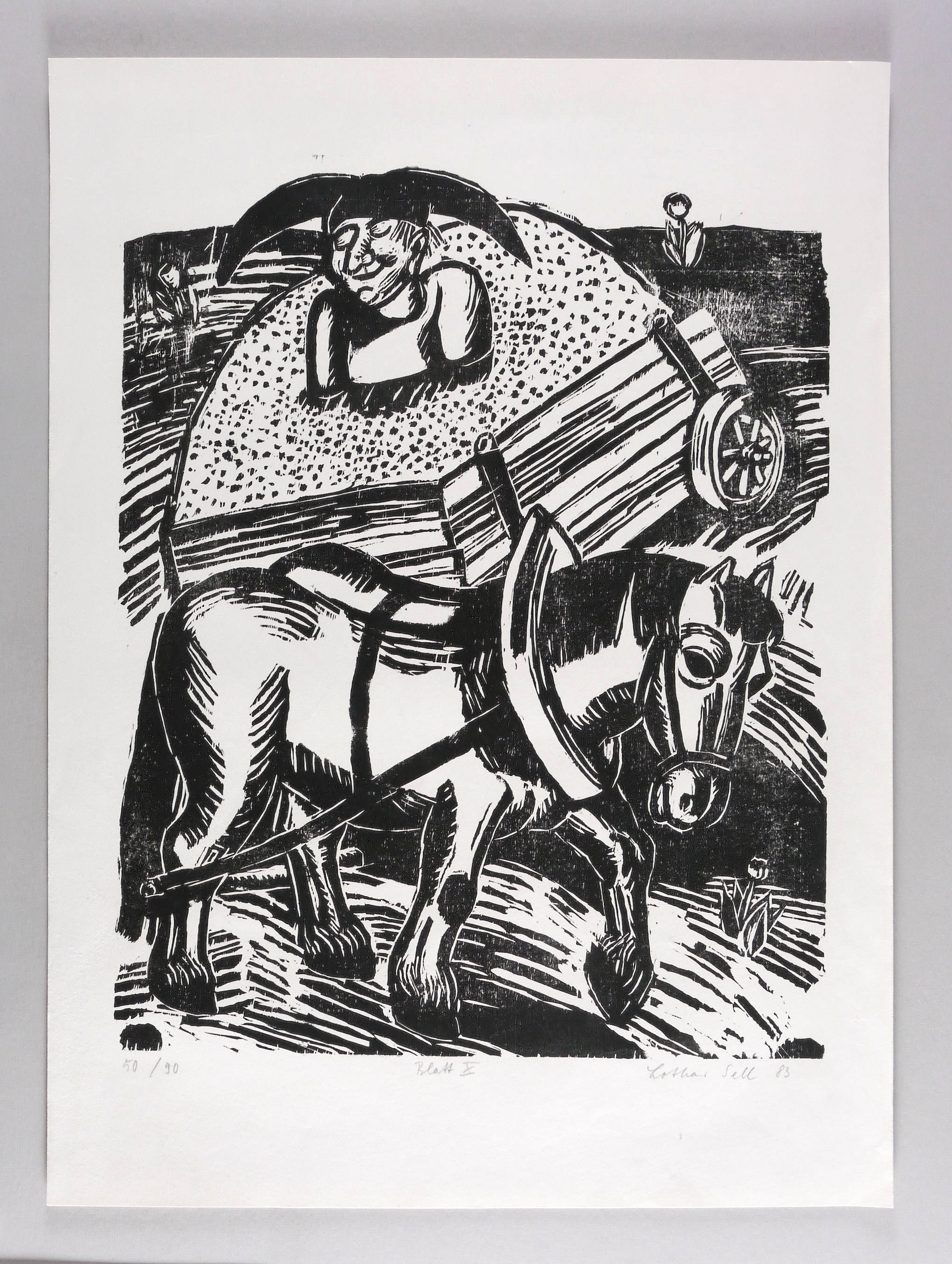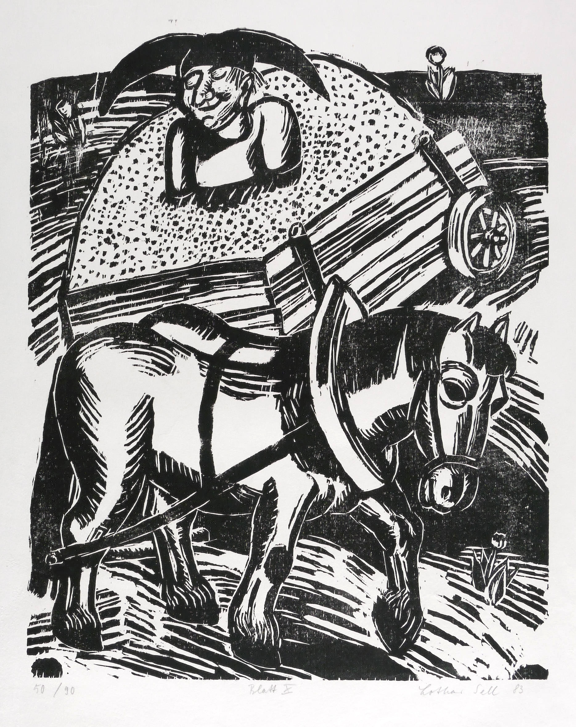 Aus: Lothar Sell, Till Eulenspiegel. 10 Holzschnitte von Lothar Sell (Berlin: Kunsthandel der DDR 1983). – Rechts unten in Bleistift signiert und datiert ″Lothar Sell 83″. Links Auflagenbezeichnung: ″50/90″. Mittig bezeichnet: ″Blatt X″. – Großformatige Illustration zur 26. Historie ″Wie Eulenspiegel einem Bauer einen Teil seines Landes abkaufte im Lüneburgischen und dann in einem Sturzkarren saß″ aus Till Eulenspiegel. – Sehr guter Zustand.