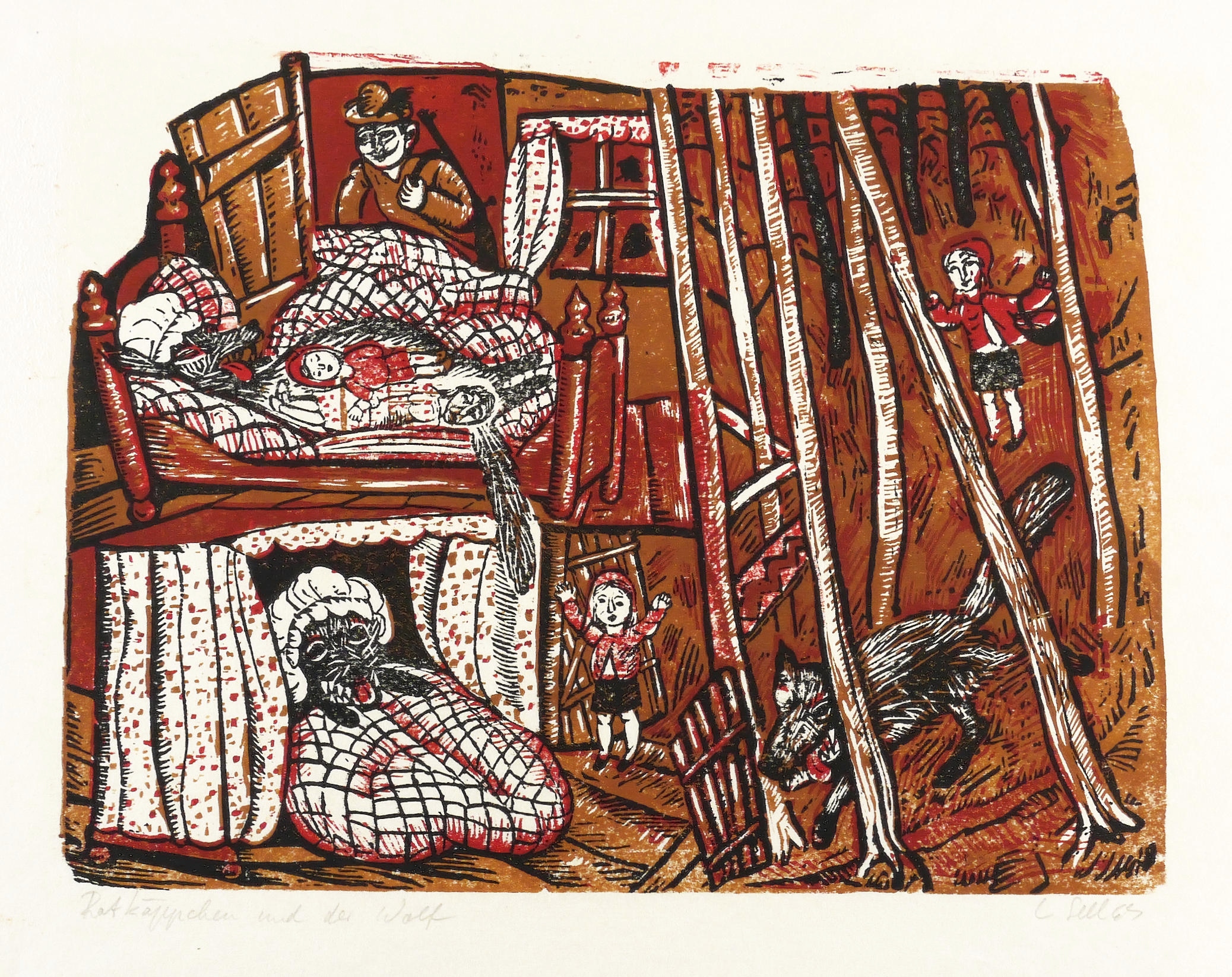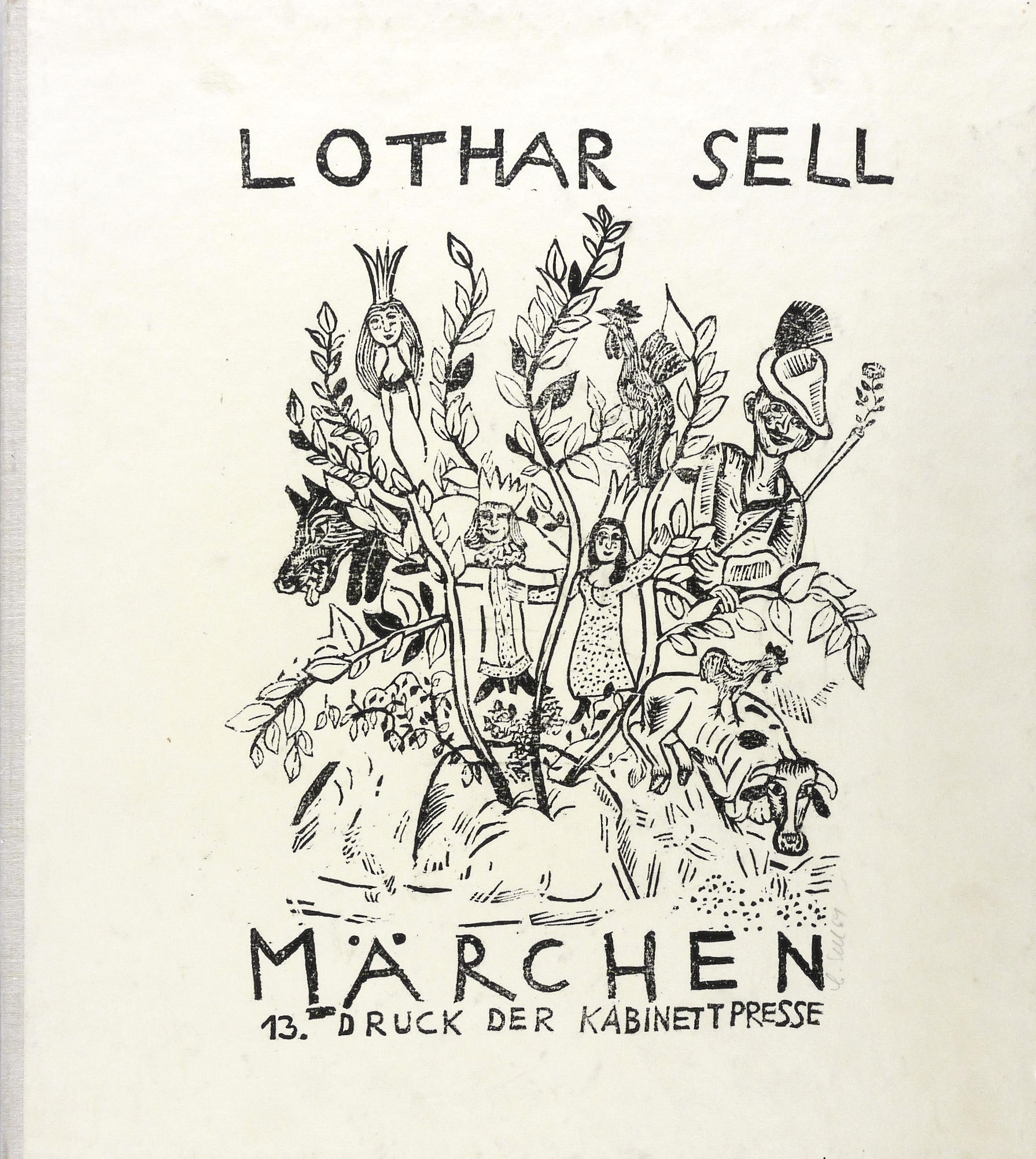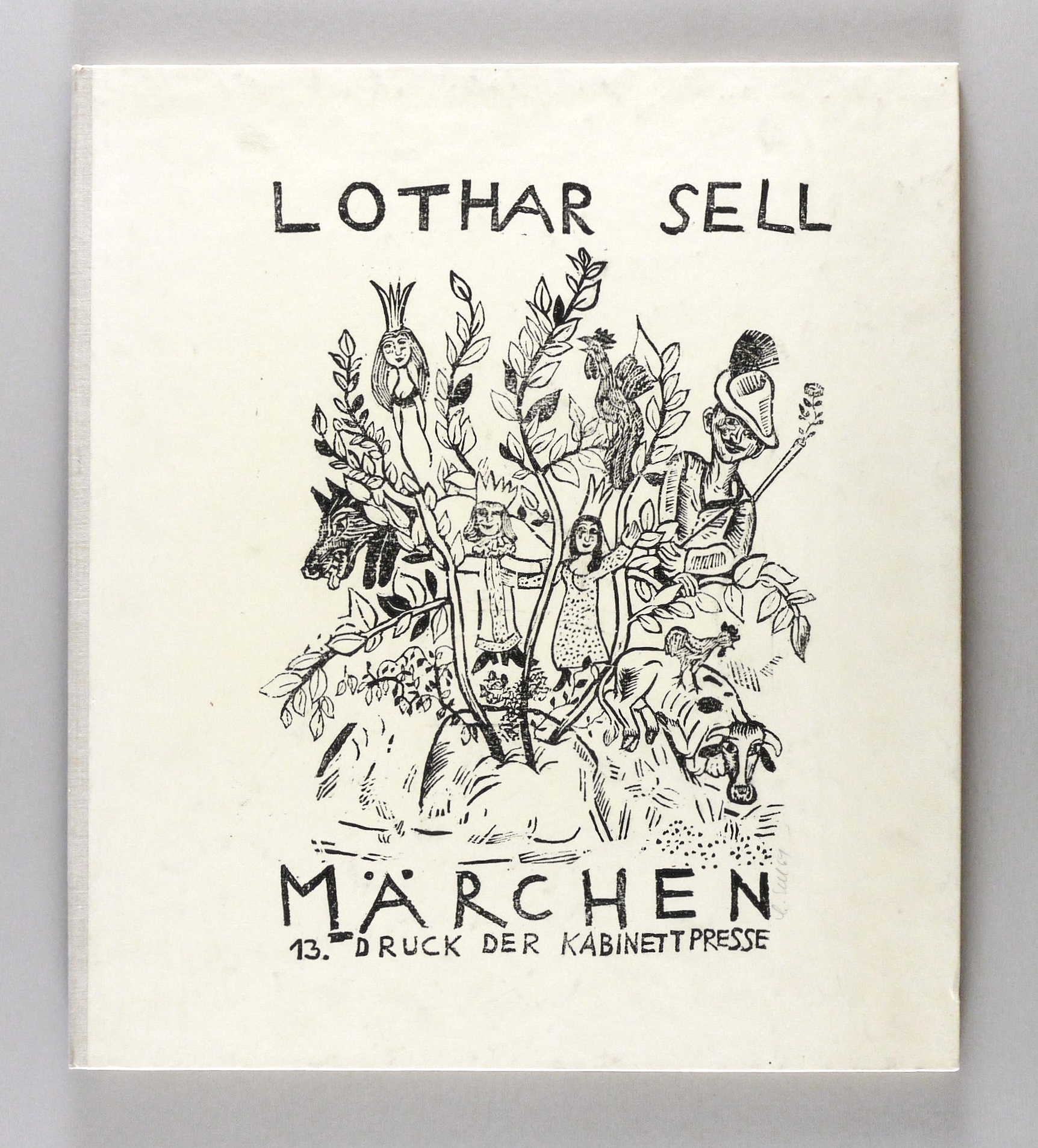 Aus: Lothar Sell, Grimms Märchen. 13. Druck der Kabinettpresse (Berlin: Kabinettpresse 1969). – Alle Holzschnitte einschließlich dem Außentitel unten in Bleistift signiert und datiert: ″L. Sell 69″. Handschriftliche Auflagenbezeichnung im Impressum. – Originale Grafikmappe von Lothar Sell für die Kabinettpresse Berlin. Mit dem speziell für diese Grafikmappe verfassten Begleittext von Franz Fühmann. Enthalten sind 7 Holzschnitte und 3 Farbholzschnitte: 0a. [Außentitel]. - 0b. [Innentitel]. - 1. Das Waldhaus. - 2. Die goldene Gans. - 3. Frau Holle. - 4. Rapunzel. - 5. Die Bremer Stadtmusikanten. - 6. Der Wolf und die sieben Geißlein. - 7. Dornröschen. - 8. Rotkäppchen und der Wolf. – Vollständig mit Umschlag und Außentitel, mit Impressum, Textblatt und allen Grafiken. Der Umschlag minimal berieben und fingerspurig. Die Blätter bisweilen unscheinbar gewellt. Schönes Exemplar. Guter bis sehr guter Zustand.