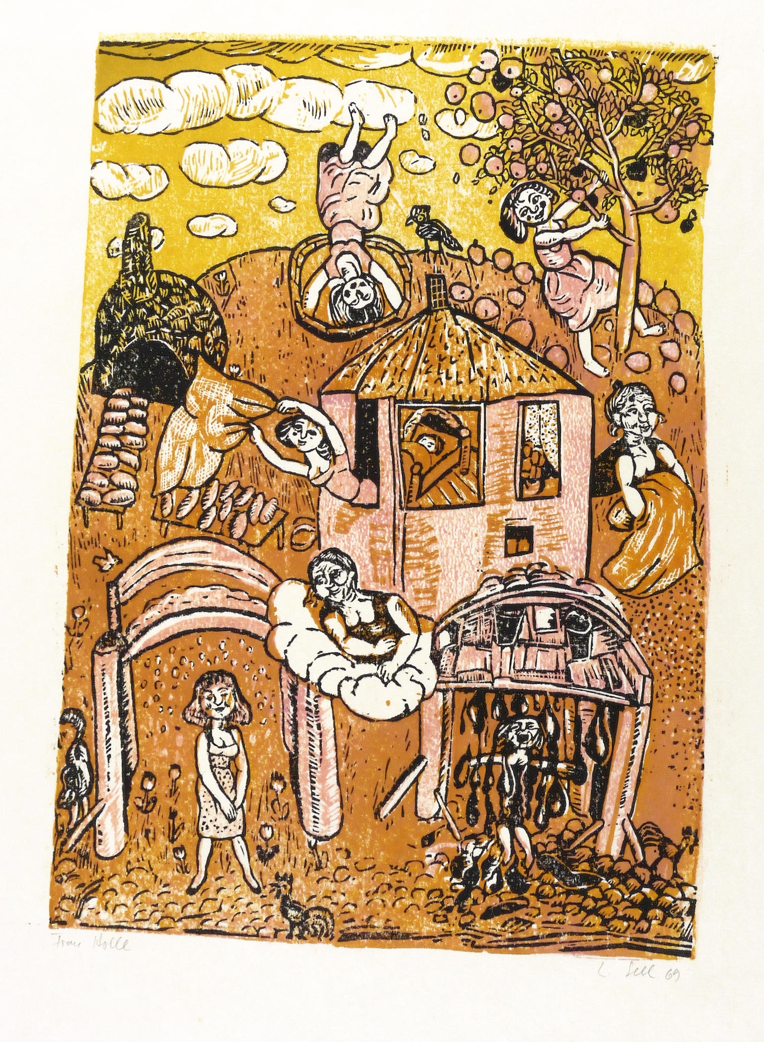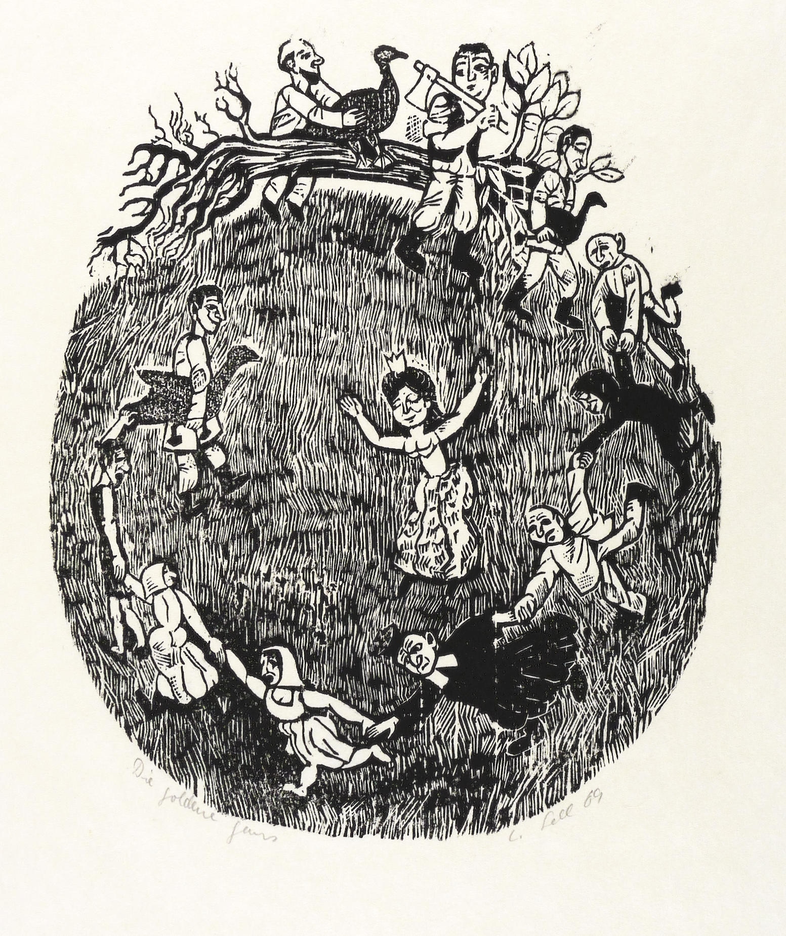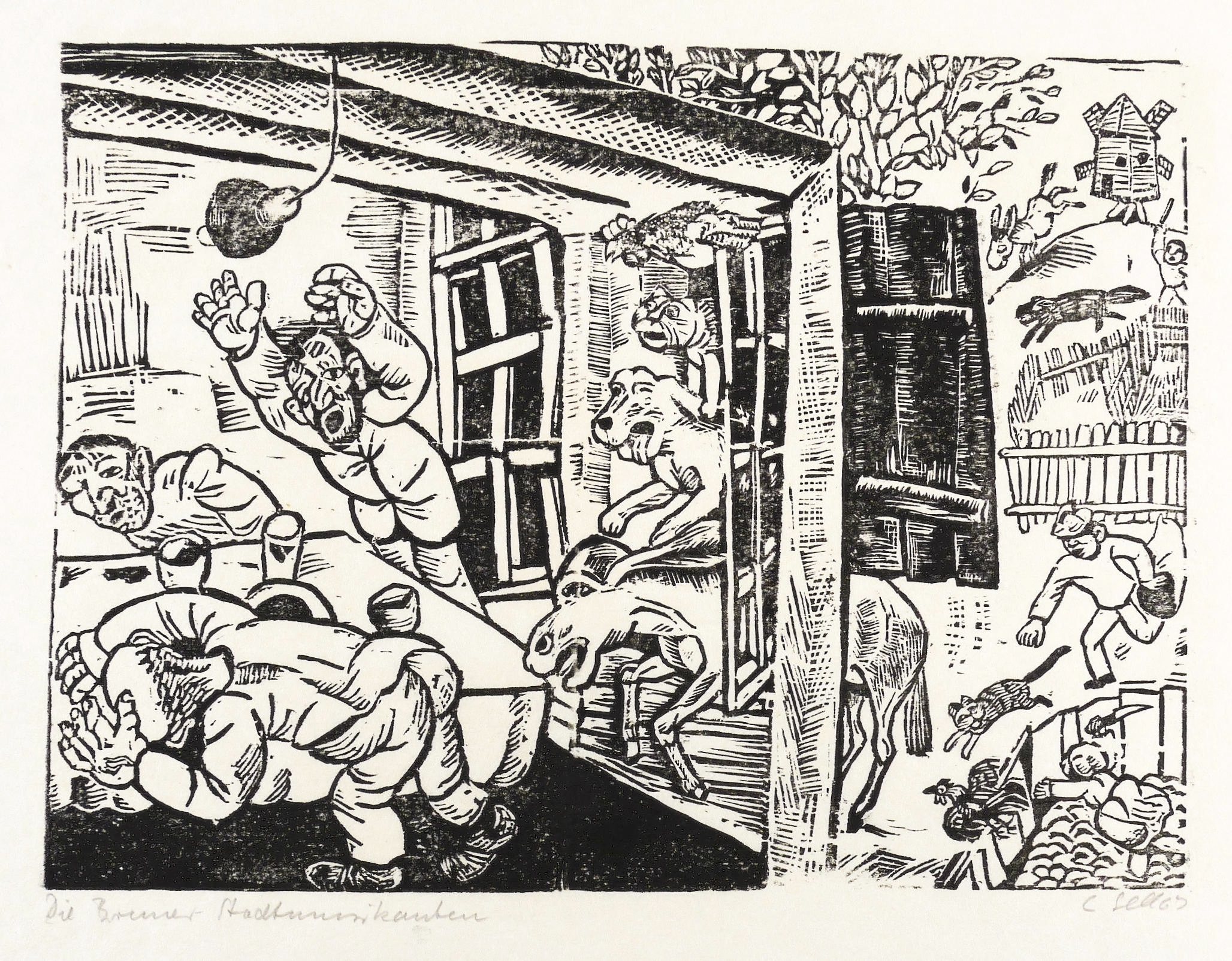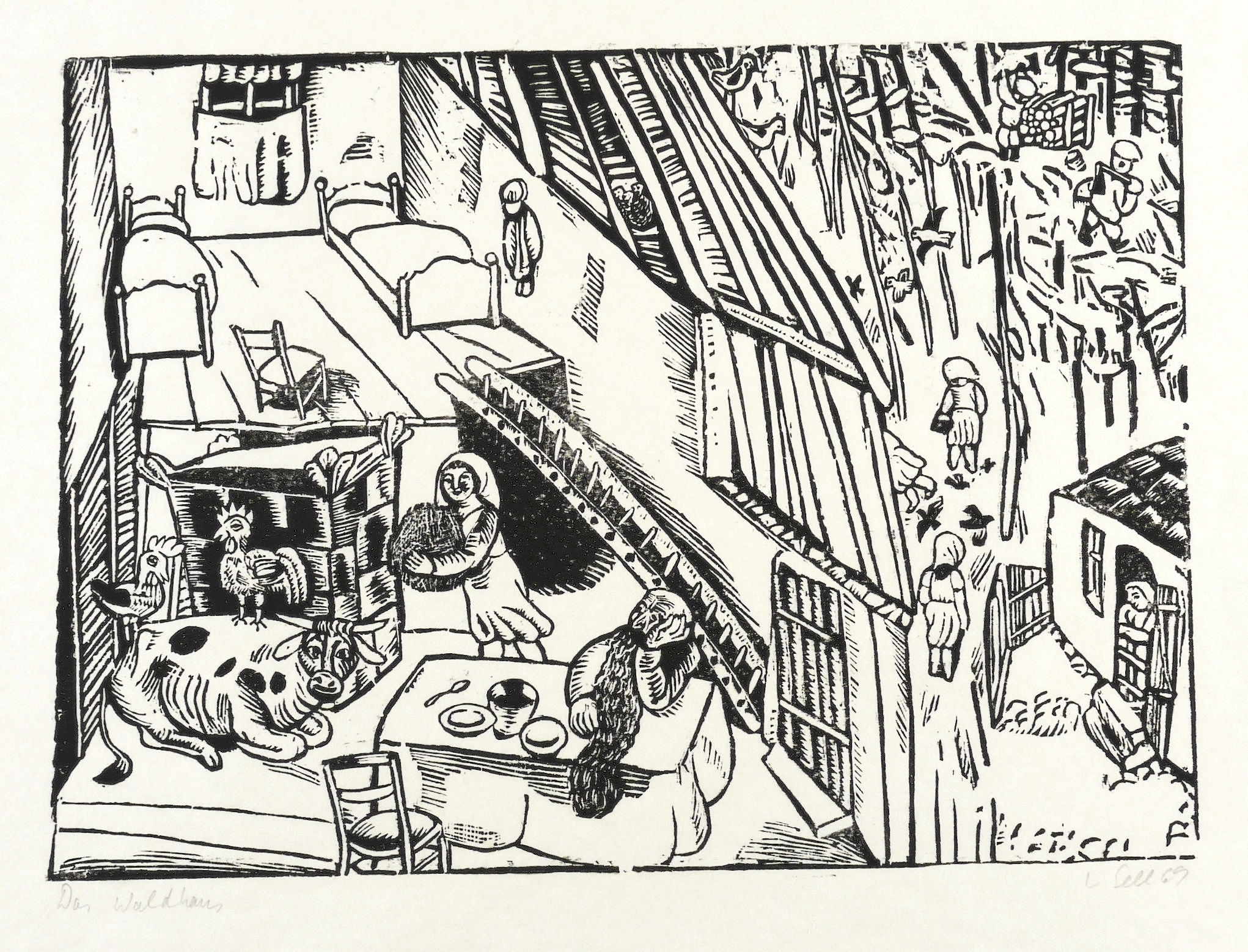 Aus: Lothar Sell, Grimms Märchen. 13. Druck der Kabinettpresse (Berlin: Kabinettpresse 1969). – Alle Holzschnitte einschließlich dem Außentitel unten in Bleistift signiert und datiert: ″L. Sell 69″. Handschriftliche Auflagenbezeichnung im Impressum. – Originale Grafikmappe von Lothar Sell für die Kabinettpresse Berlin. Mit dem speziell für diese Grafikmappe verfassten Begleittext von Franz Fühmann. Enthalten sind 7 Holzschnitte und 3 Farbholzschnitte: 0a. [Außentitel]. - 0b. [Innentitel]. - 1. Das Waldhaus. - 2. Die goldene Gans. - 3. Frau Holle. - 4. Rapunzel. - 5. Die Bremer Stadtmusikanten. - 6. Der Wolf und die sieben Geißlein. - 7. Dornröschen. - 8. Rotkäppchen und der Wolf. – Vollständig mit Umschlag und Außentitel, mit Impressum, Textblatt und allen Grafiken. Der Umschlag minimal berieben und fingerspurig. Die Blätter bisweilen unscheinbar gewellt. Schönes Exemplar. Guter bis sehr guter Zustand.