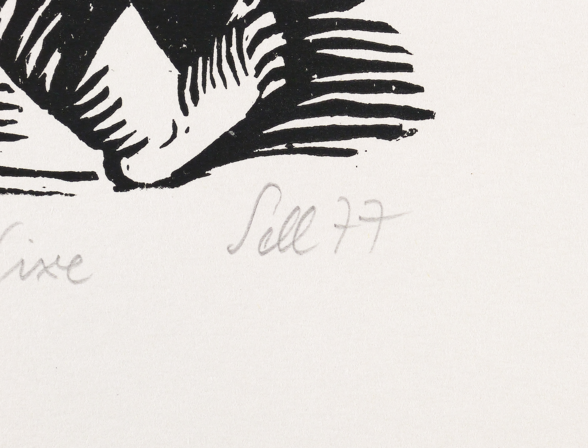 1977. Holzschnitt, in Schwarz, auf hellchamois Velinkarton. – Originale Künstlergrafik, von Lothar Sell. – 17,5 x 10,3 cm (Darstellung / Druckbild), 24 x 32 cm (Blatt).