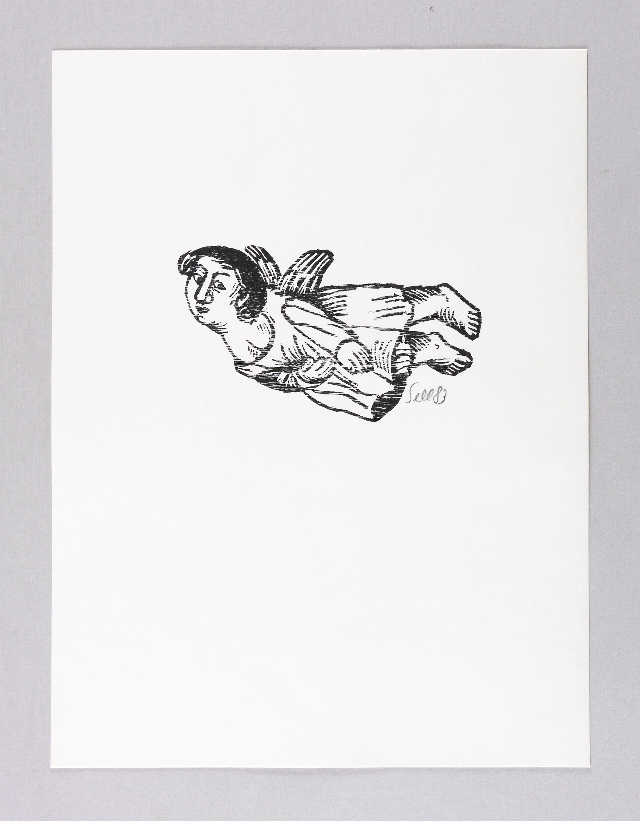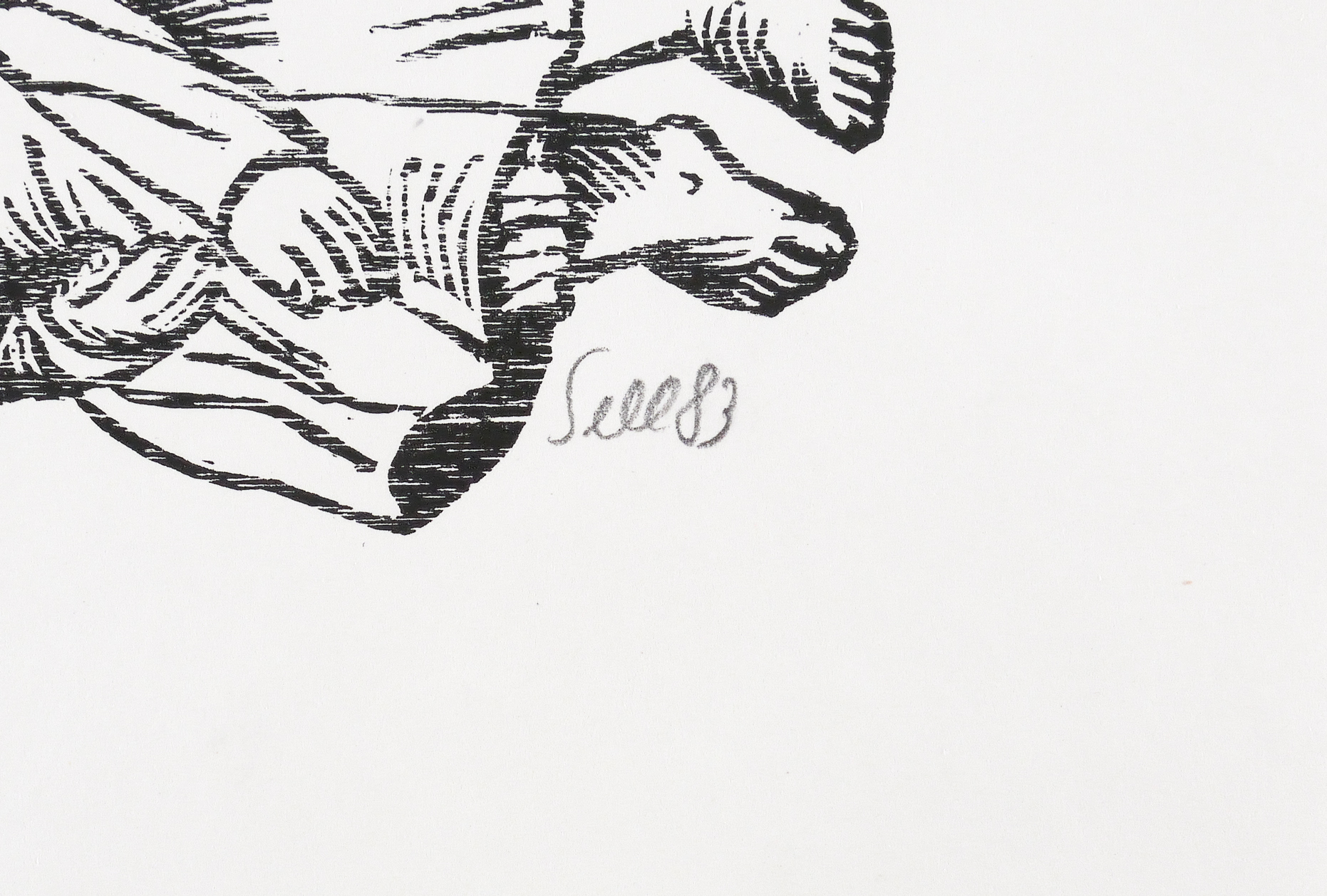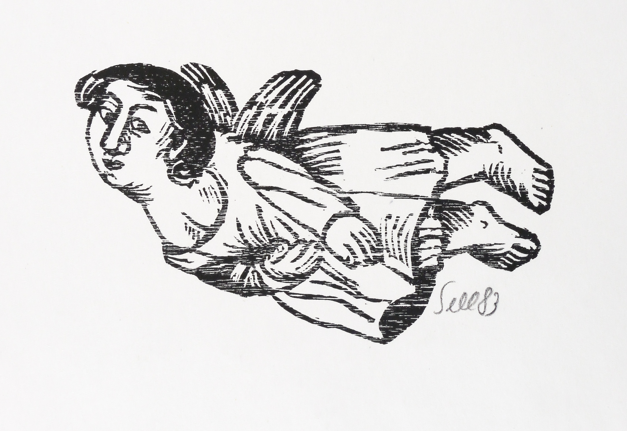 1983. Holzschnitt, in Schwarz, auf glattem hellgelbem Velin. – Originale Künstlergrafik, von Lothar Sell. – 7,9 x 13,6 cm (Darstellung / ohne Schrift), 32 x 24 cm (Blatt).
