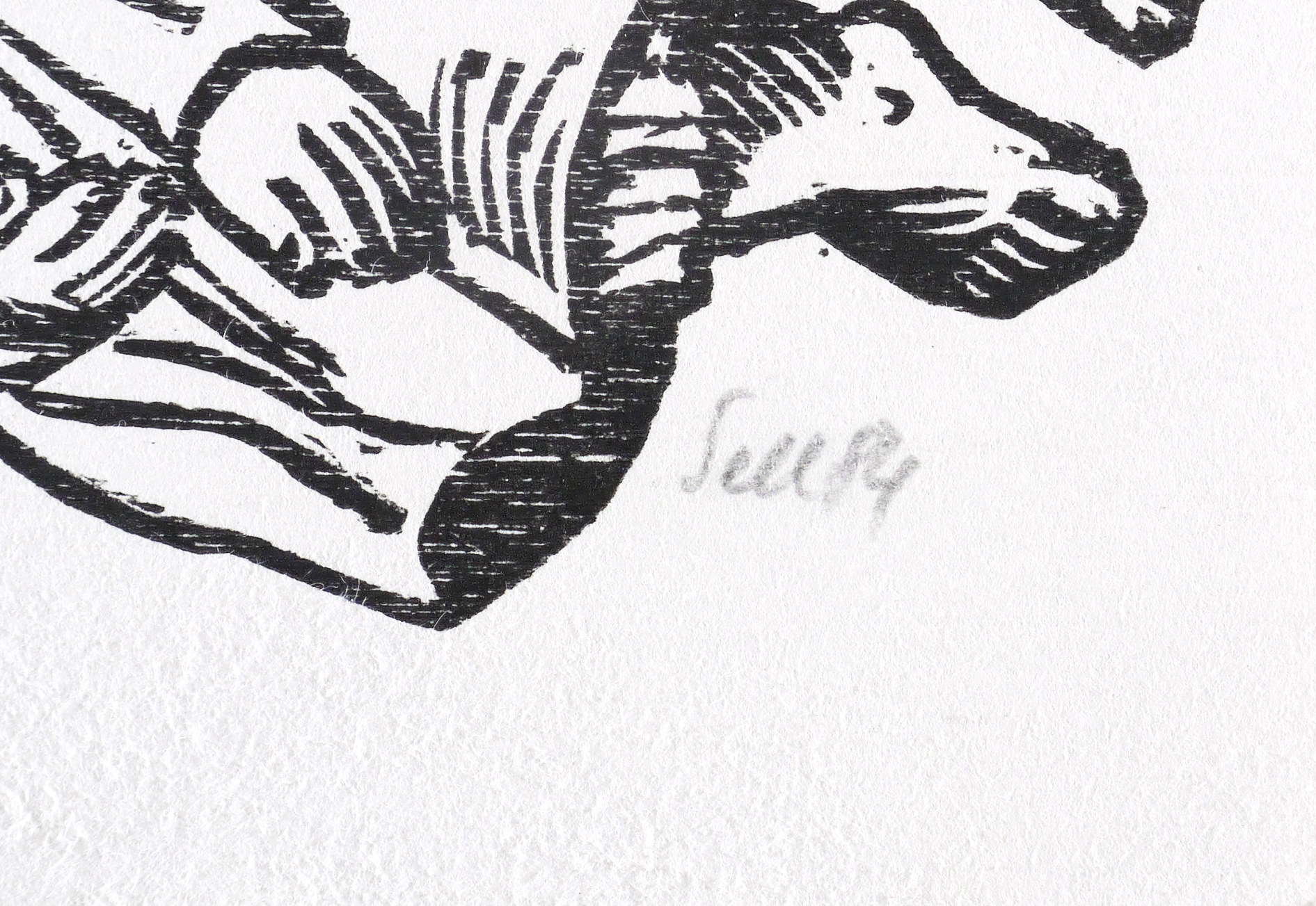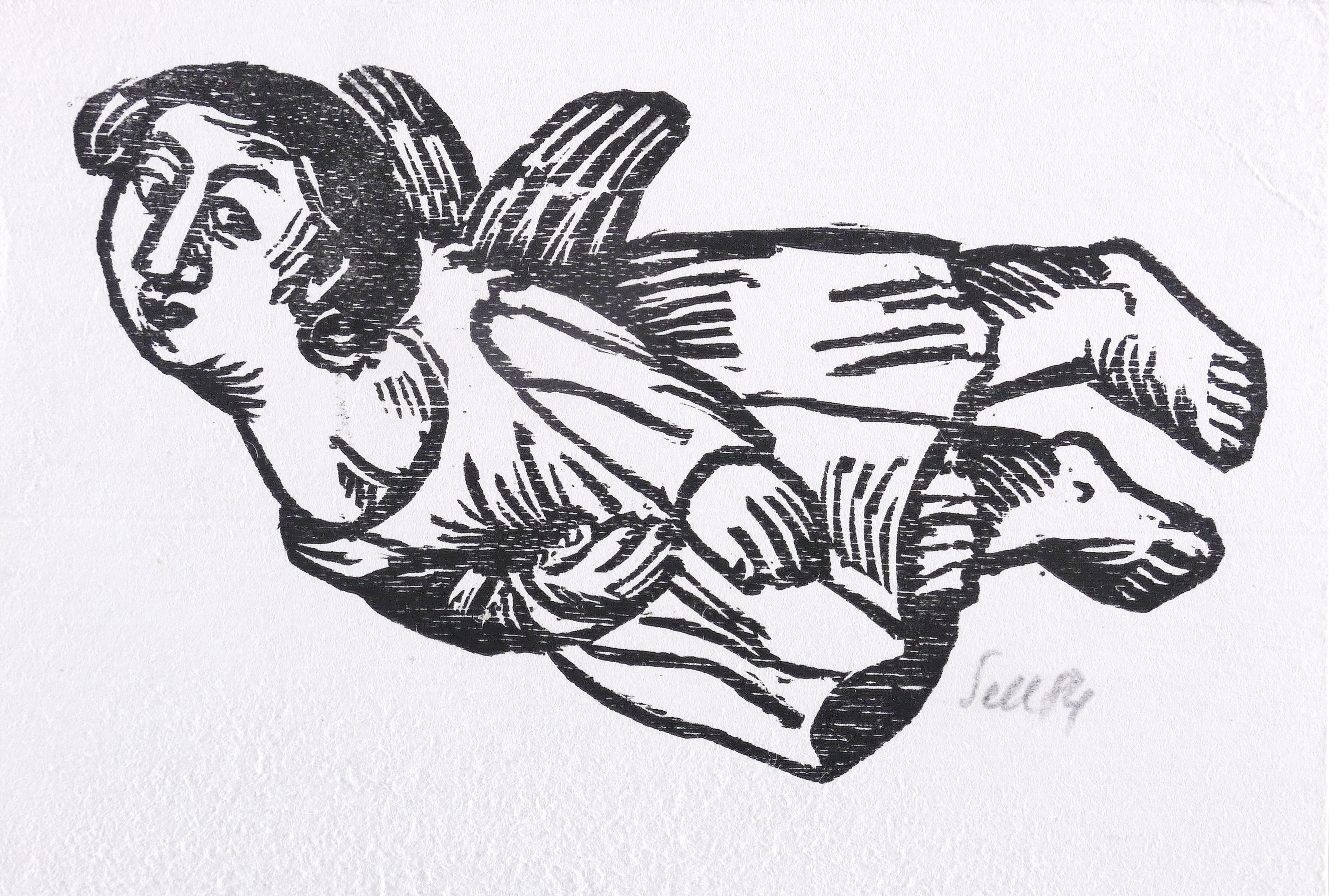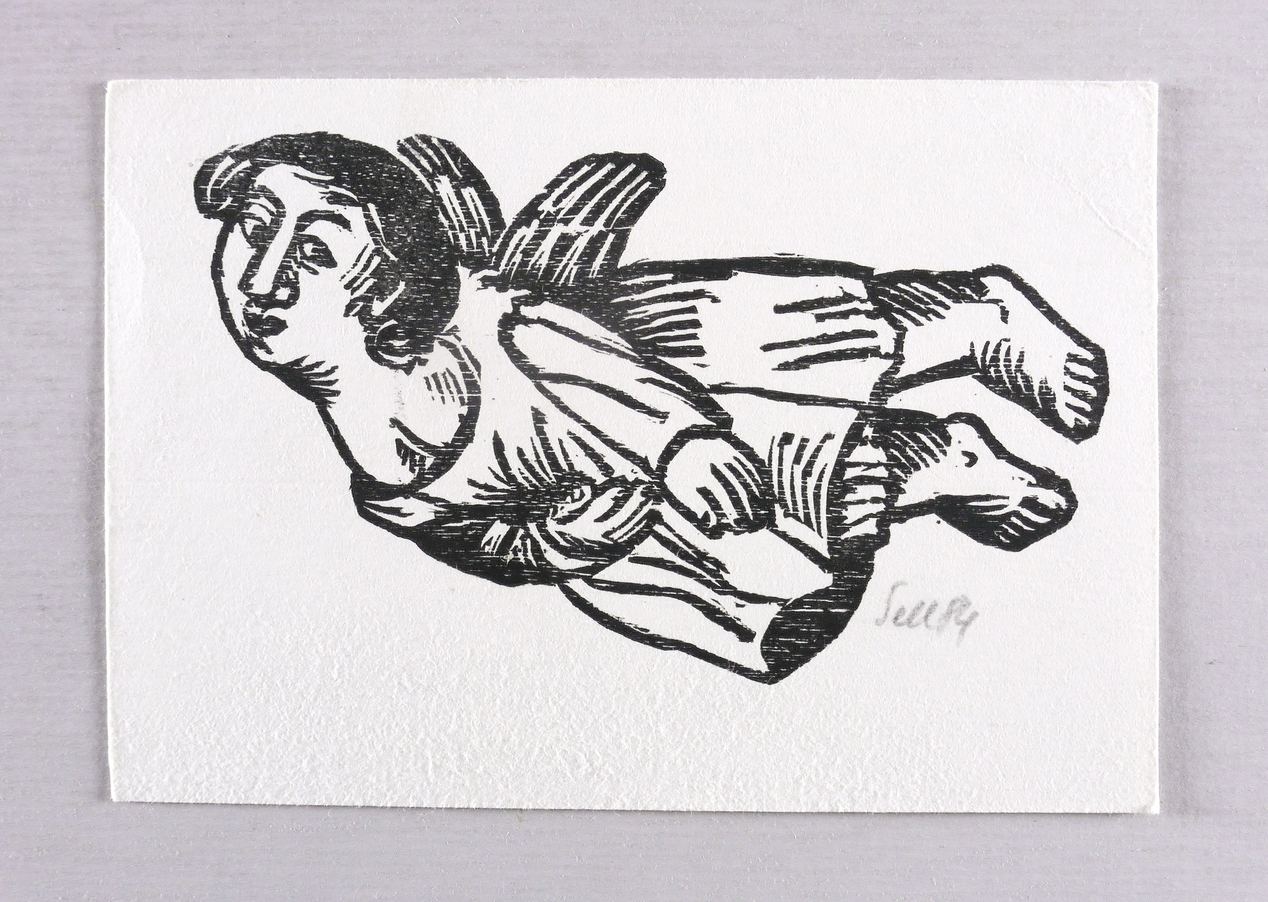 1984. Holzschnitt, in Schwarz, auf rauem weißlichem Velin. – Originale Künstlergrafik, von Lothar Sell. – 8,0 x 13,5 cm (Darstellung / Druckbild), 11 x 16 cm (Blatt).