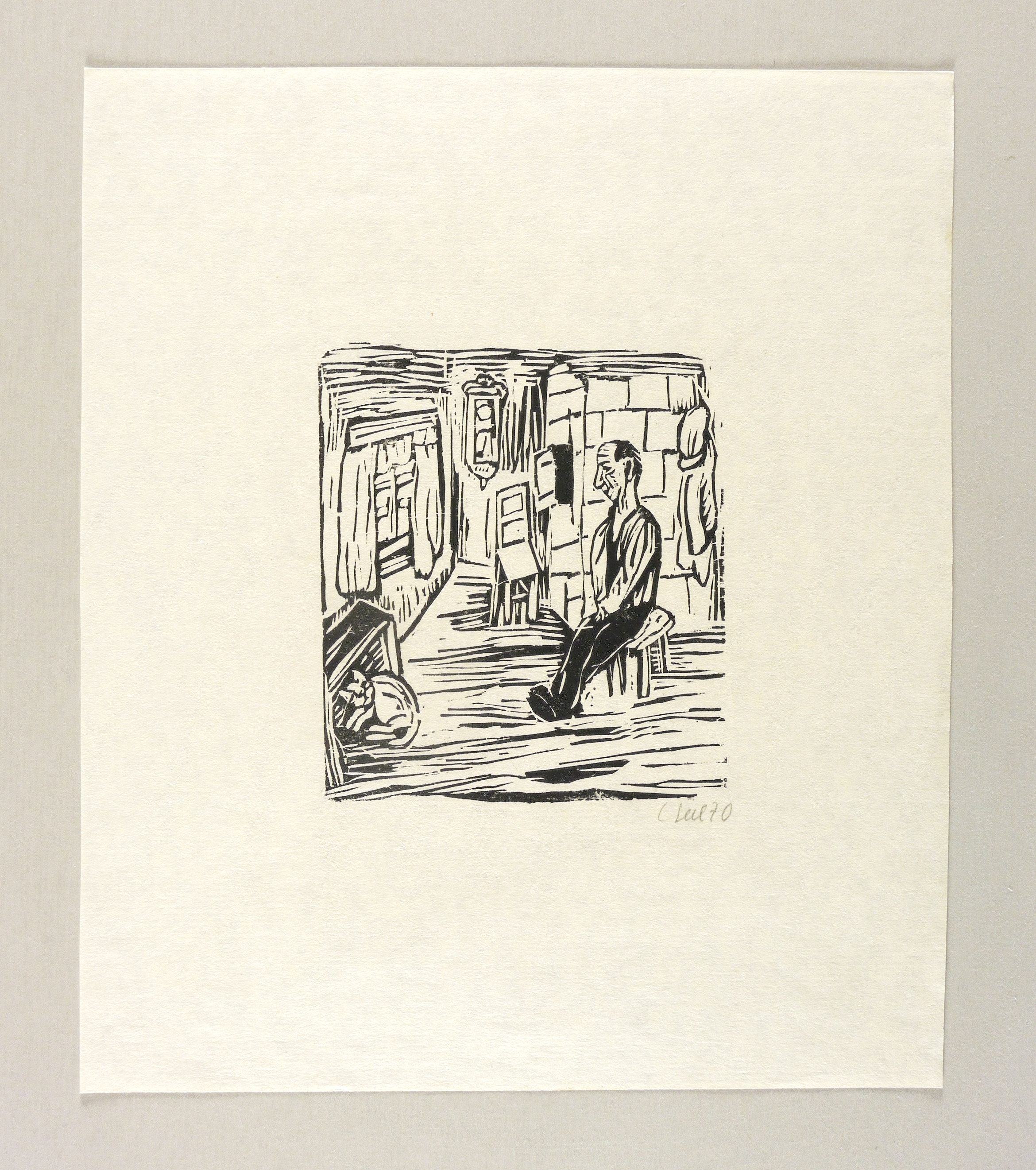 1970. Holzschnitt, in Schwarz, auf leichtem gelblichem Velin. – Originale Künstlergrafik, von Lothar Sell. – 13,0 x 11,2 cm (Darstellung / Druckbild), 29 x 25 cm (Blatt).