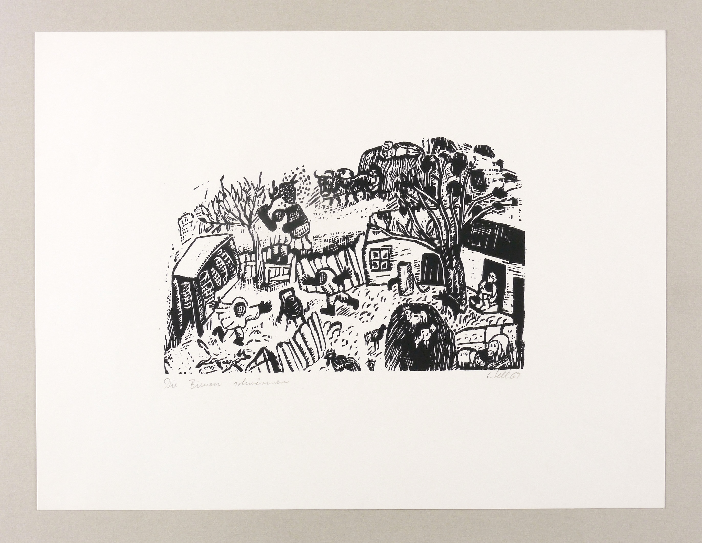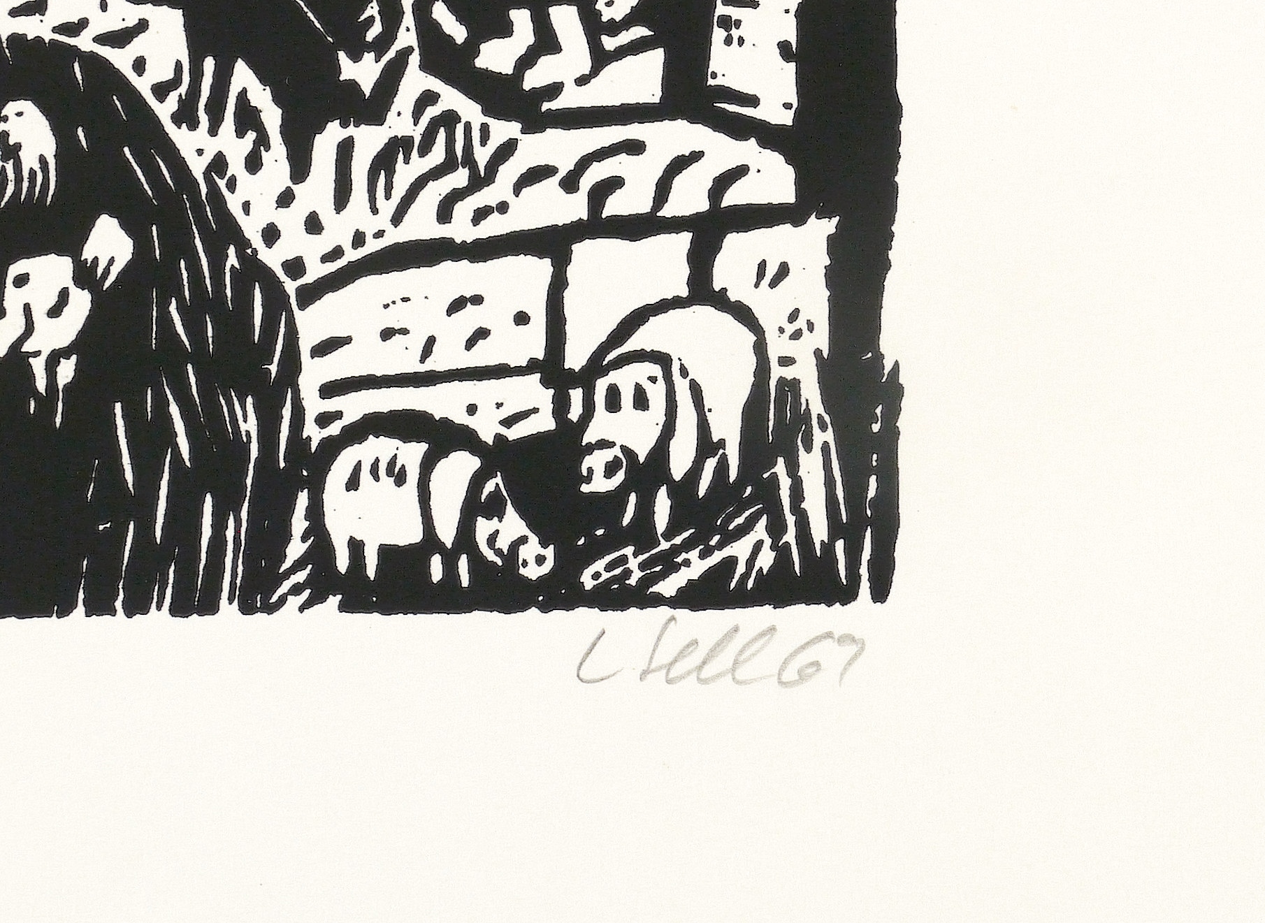 1969. Siebdruck / Serigrafie, nach Holzschnitt, in Schwarz, auf glattem weißem Velinkarton. – Originale Künstlergrafik, von Lothar Sell. – 18,7 x 28,7 cm (Darstellung / Druckstock), 38 x 51 cm (Blatt).