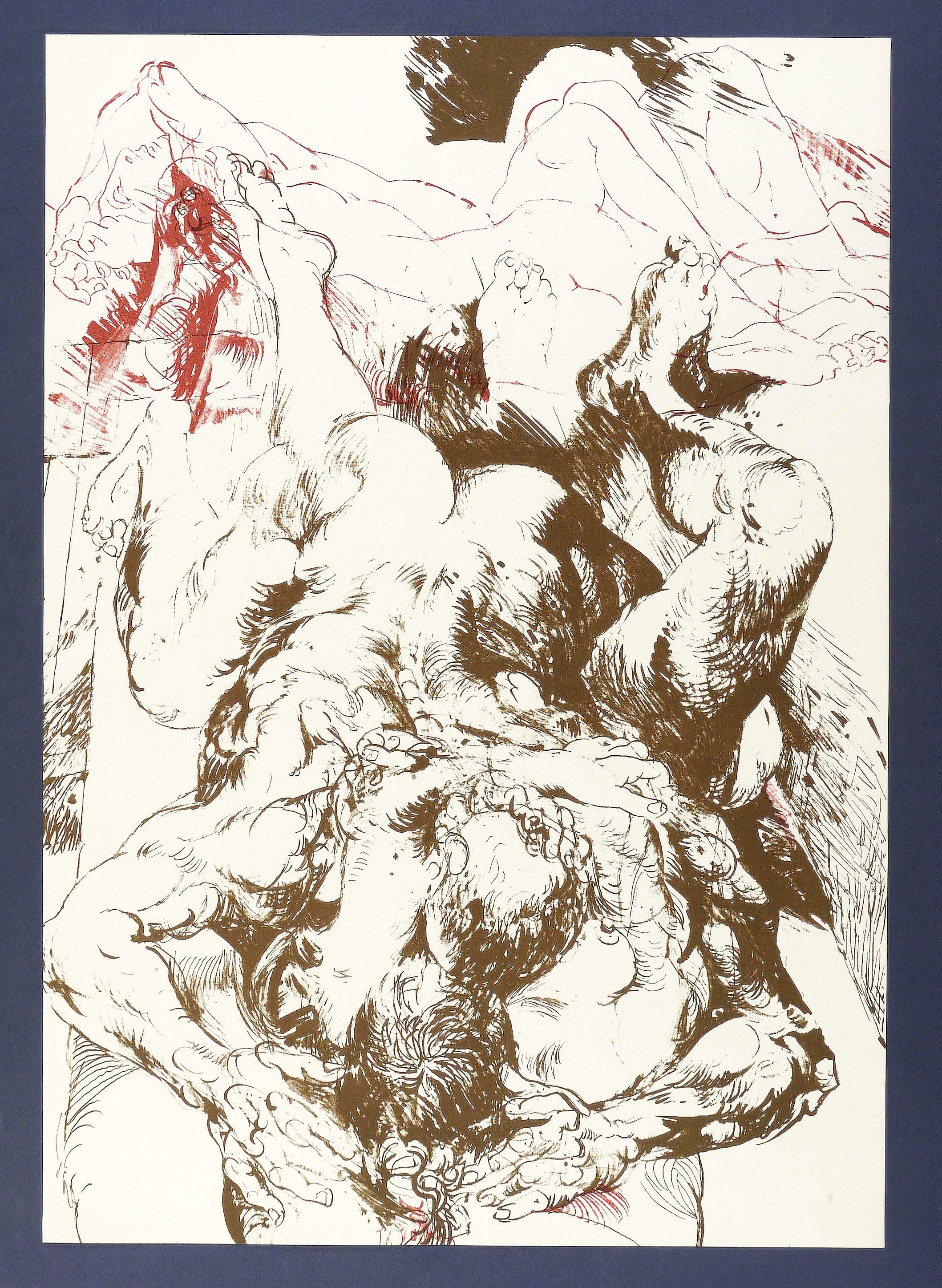 Aus: Willi Sitte, P. Ovidi Nasonis Ars amatoria. Die Liebeskunst (Berlin: Akademie-Verlag 1970). – Verso Notationen in Bleistift. – Originale Lithografie zum Mappenwerk der Ars amatoria. – Sehr guter Zustand.