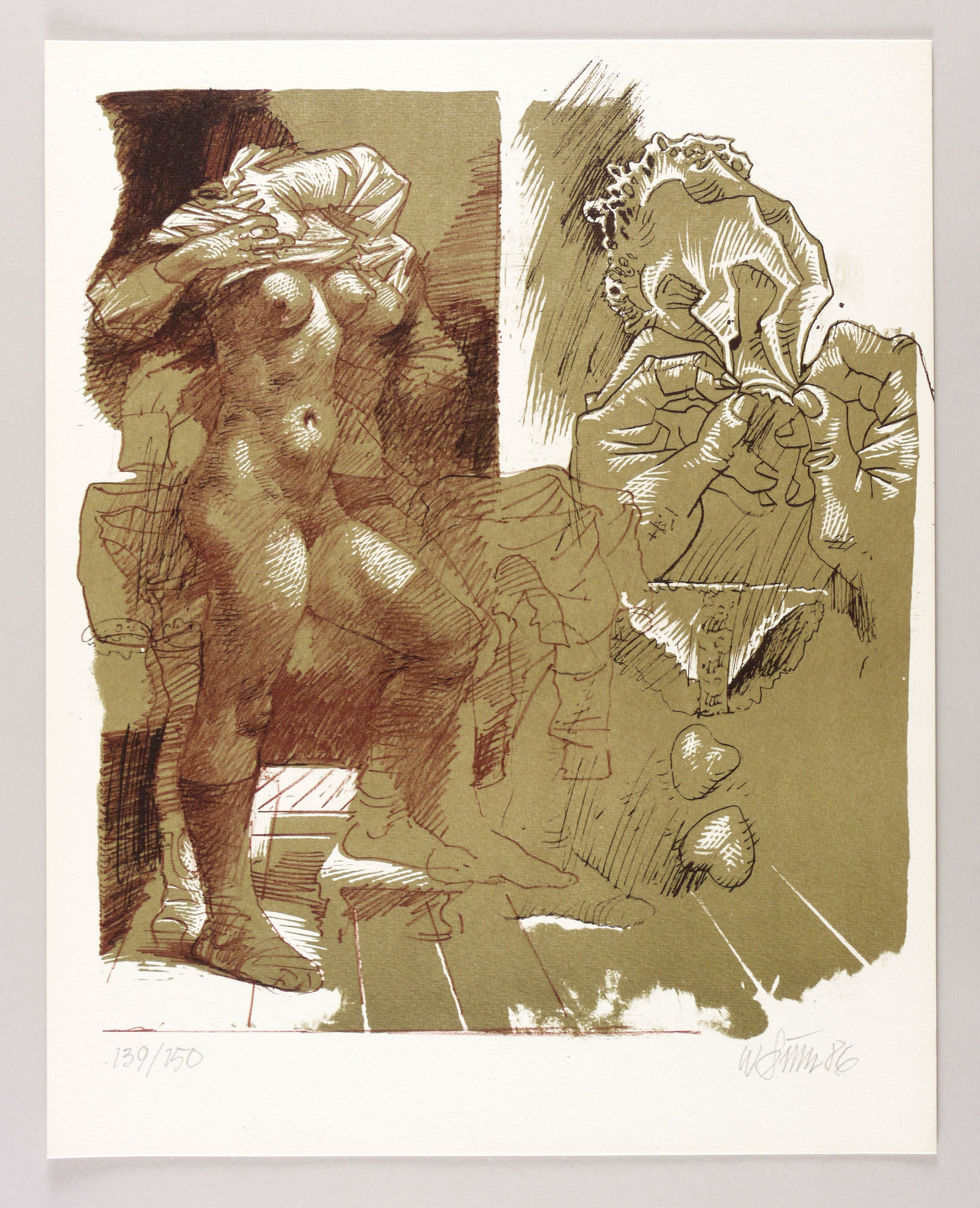 Aus: Willi Sitte, Baals Lied. Willi Sitte Sechs Lithografien zu Liebesgedichten von Bertolt Brecht. Grafik-Edition XXIII (Leipzig: Reclam 1986). – Rechts unten in Bleistift signiert und datiert: ″W. Sitte 86″. Links eigenhändige Auflagenbezeichnung: ″139/150″. – Schönes Exemplar. Tadelloser Zustand.