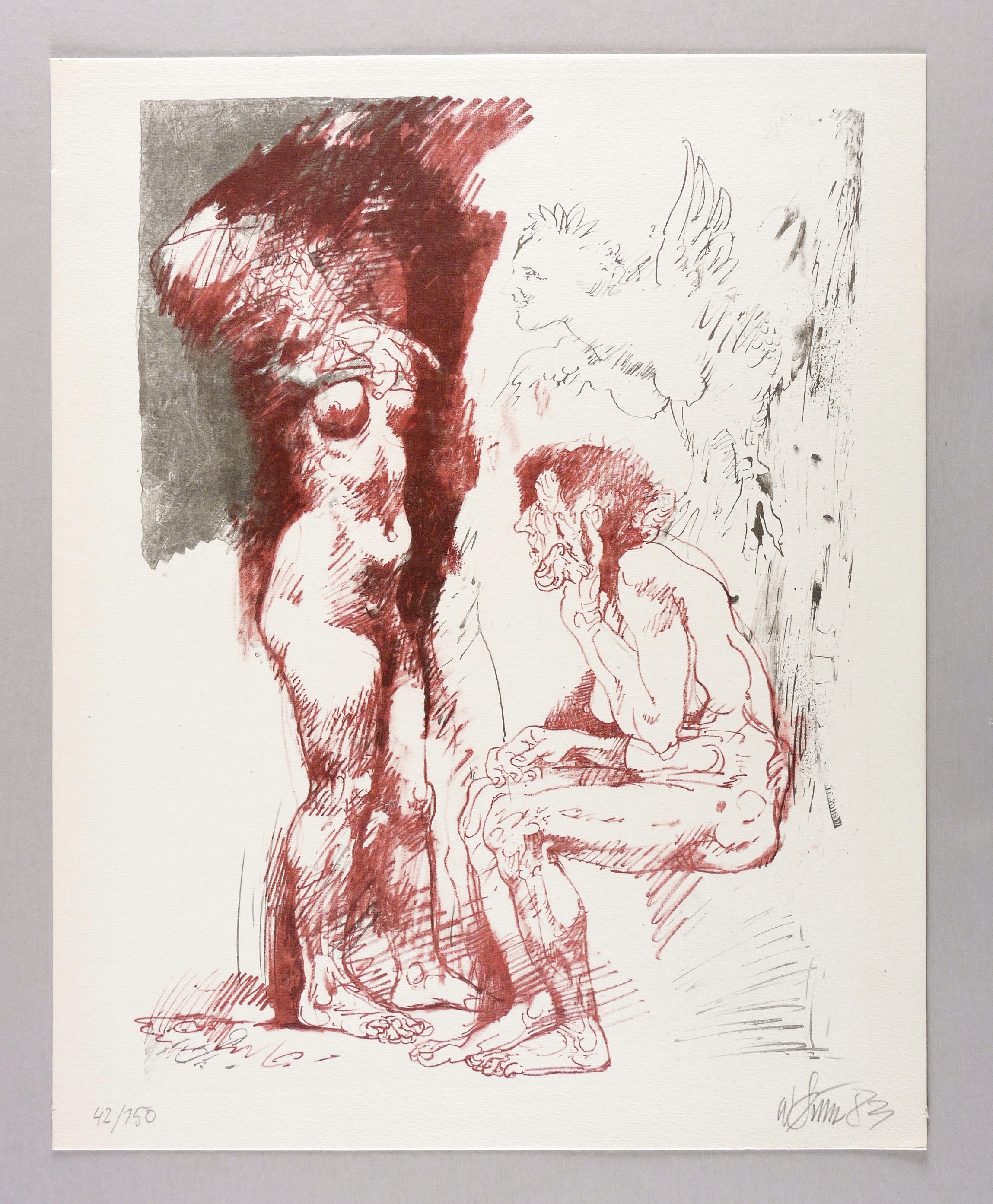 Aus: Willi Sitte, O Liebe, wie machst du der Freuden so viel! Sechs Lithografien zum Hochzeitsscherz von Johann Christian Günther. Grafik-Edition XVII (Leipzig: Reclam 1984). – Rechts unten in Bleistift signiert und datiert: ″W Sitte 83″. Links Auflagenbezeichnung: ″42/150″. – Schönes Exemplar. Tadelloser Zustand.