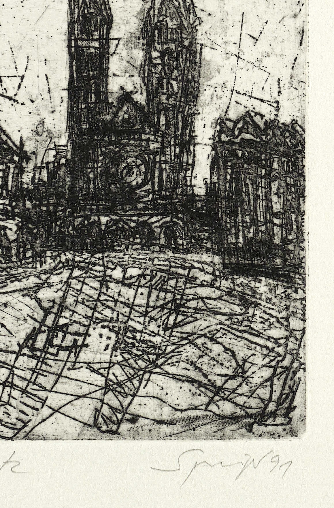 1991. Radierung / Strichätzung, Roulette & Reservage, in Schwarz, auf hellchamois Büttenpapier. – Originale Künstlergrafik, von Reinhard Springer. – Künstlerexemplar (e.a.). – 11,2 x 16,5 cm (Darstellung / Platte), 27 x 40 cm (Blatt).