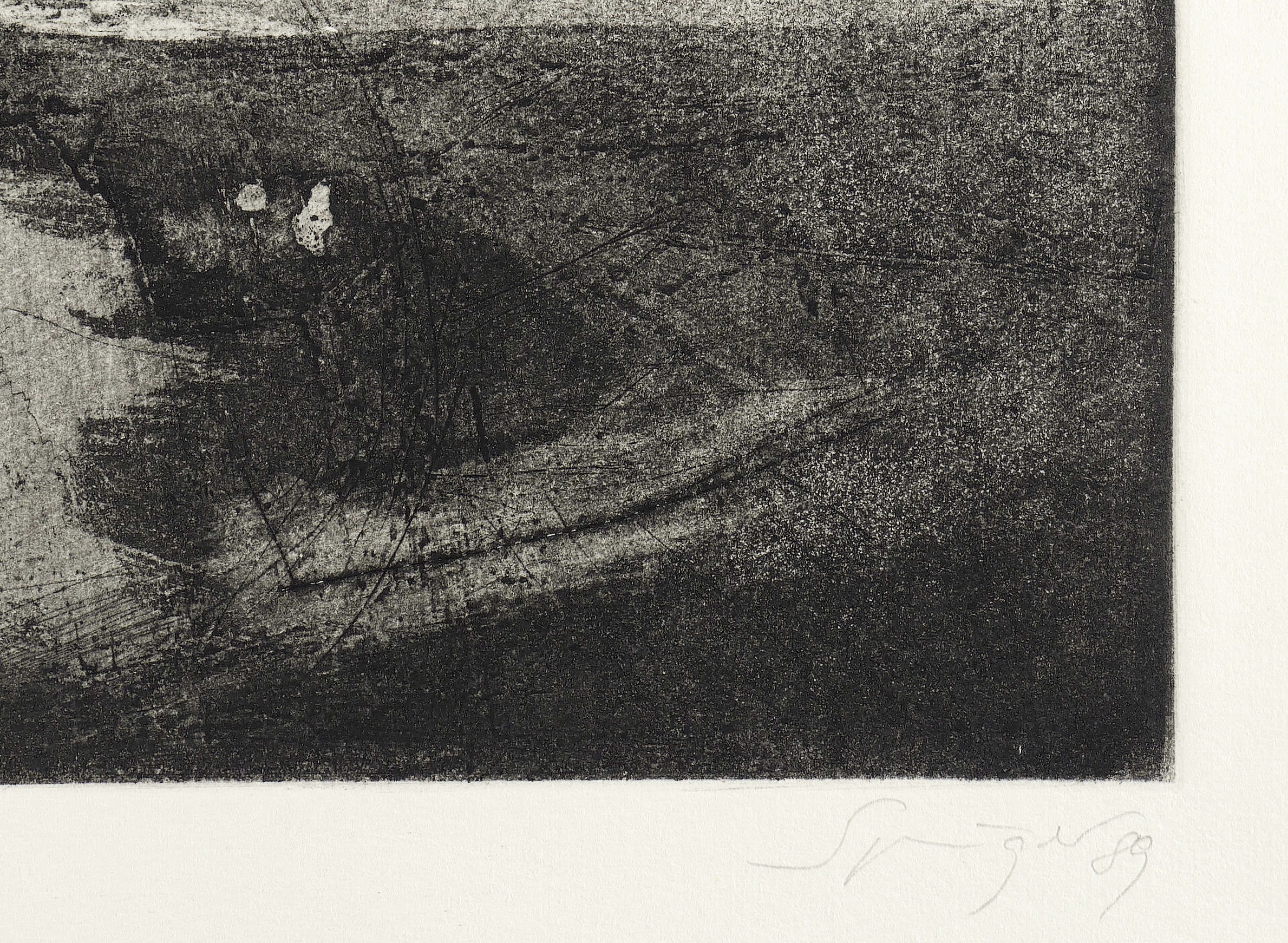 1989. Radierung / Aquatinta, Reservage & Roulette, in Schwarz, auf schwerem Hahnemühle-Bütten. – Originale Künstlergrafik, von Reinhard Springer. – Künstlerexemplar (e.a.). – 37,0 x 48,0 cm (Darstellung / Platte), 44 x 54 cm (Blatt).