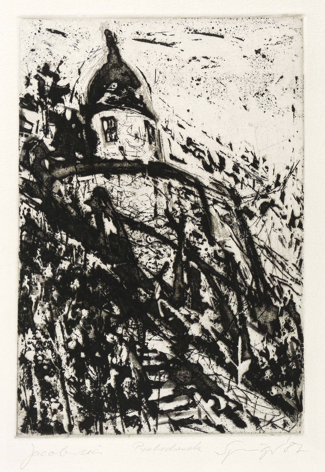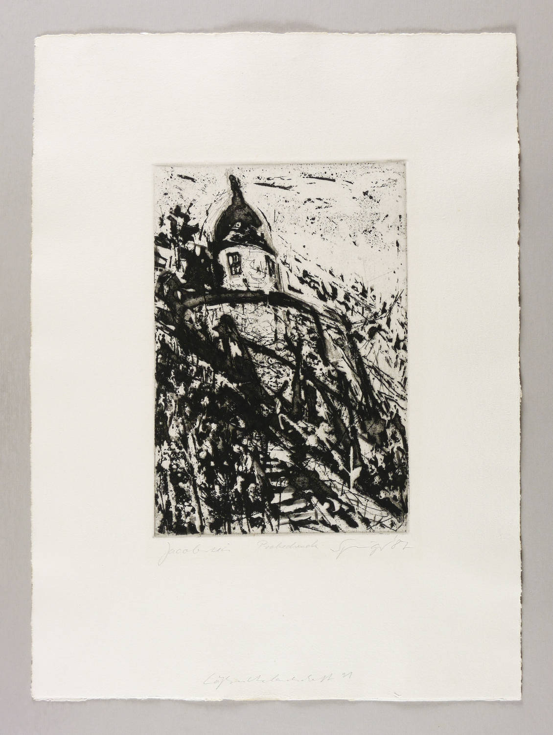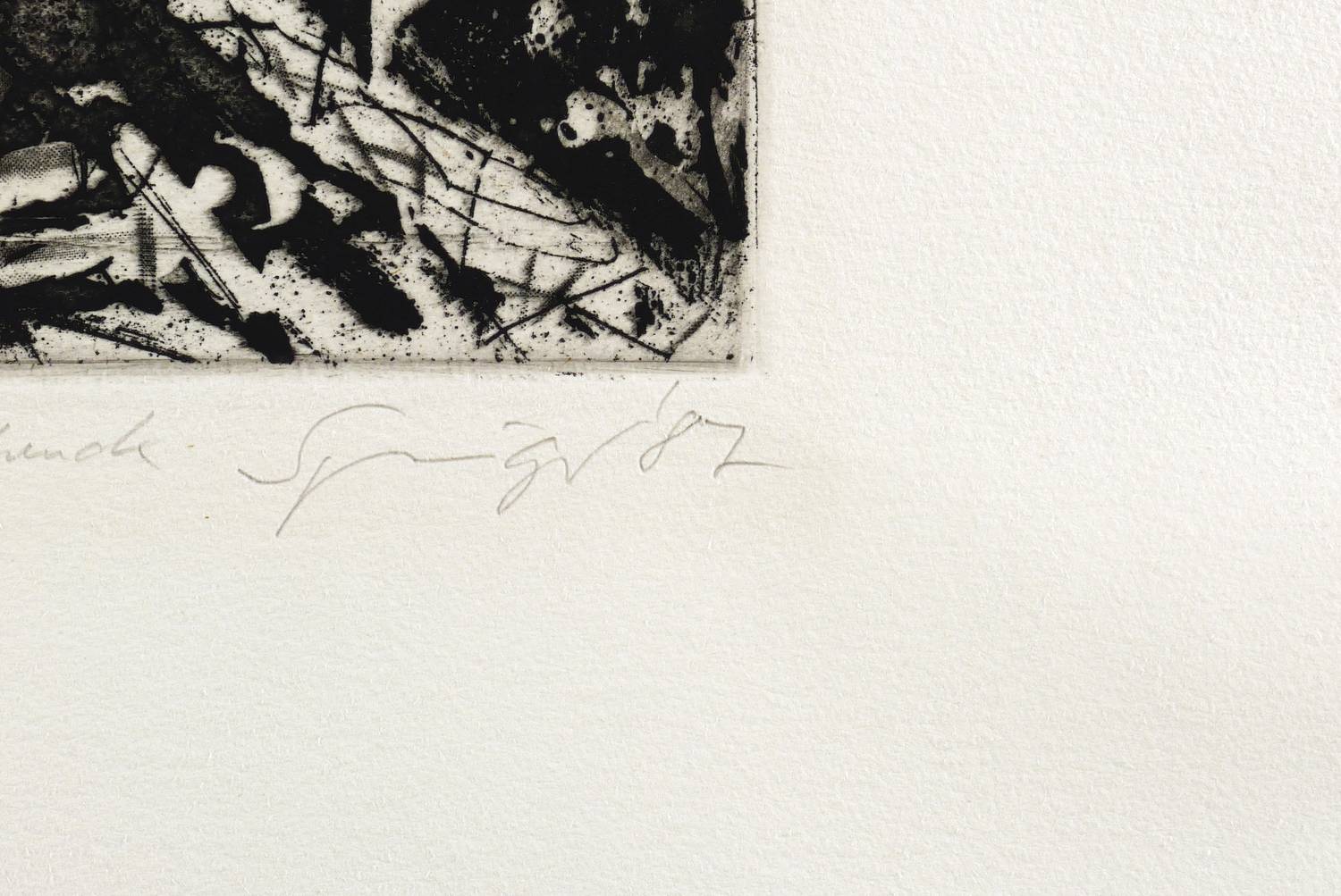 1987. Radierung / Aquatinta, Roulette & Strichätzung, in Schwarz, auf schwerem Hahnemühle-Bütten. – Originale Künstlergrafik, von Reinhard Springer. – Probedruck. – 29,8 x 20,4 cm (Darstellung / Platte), 53 x 39 cm (Blatt).