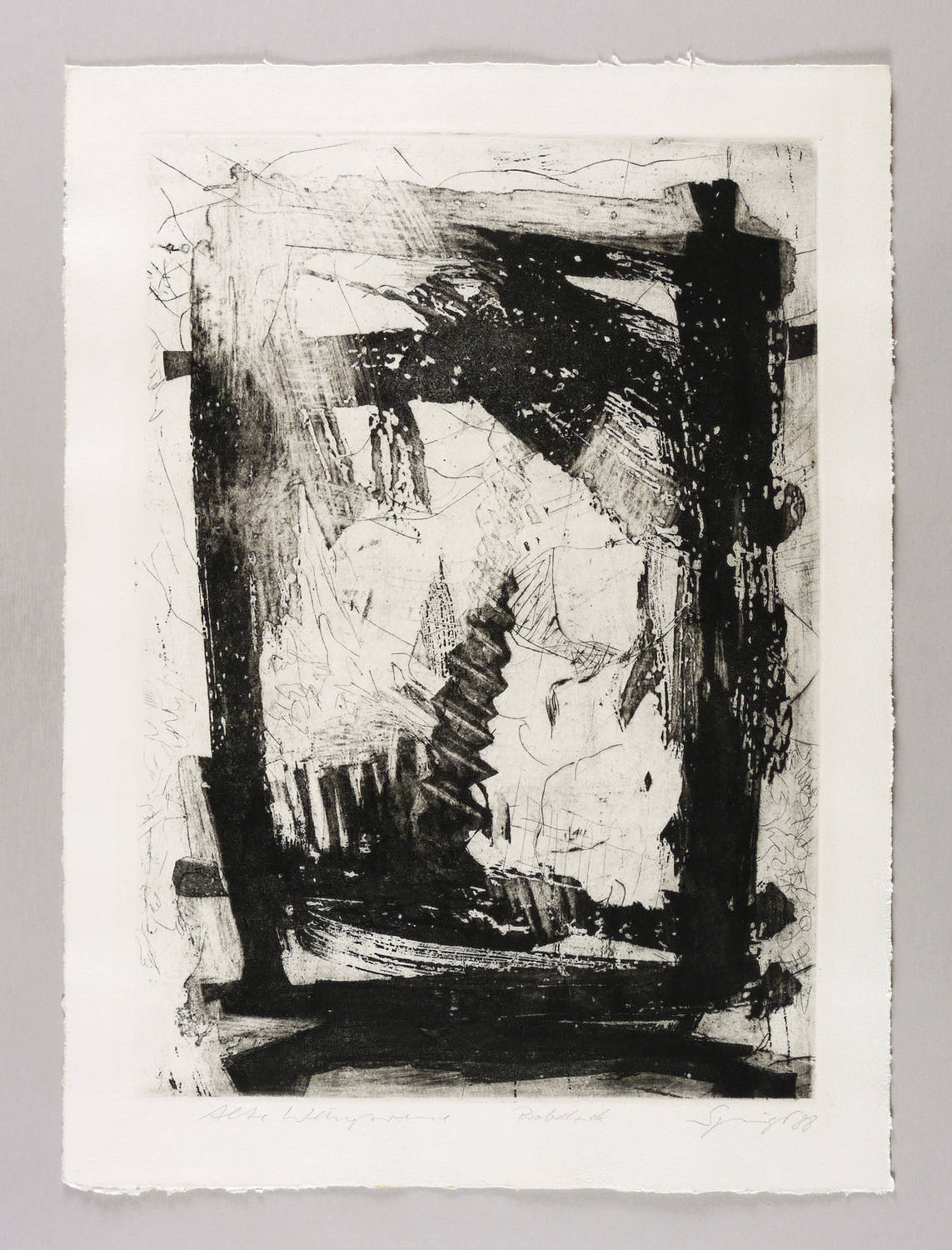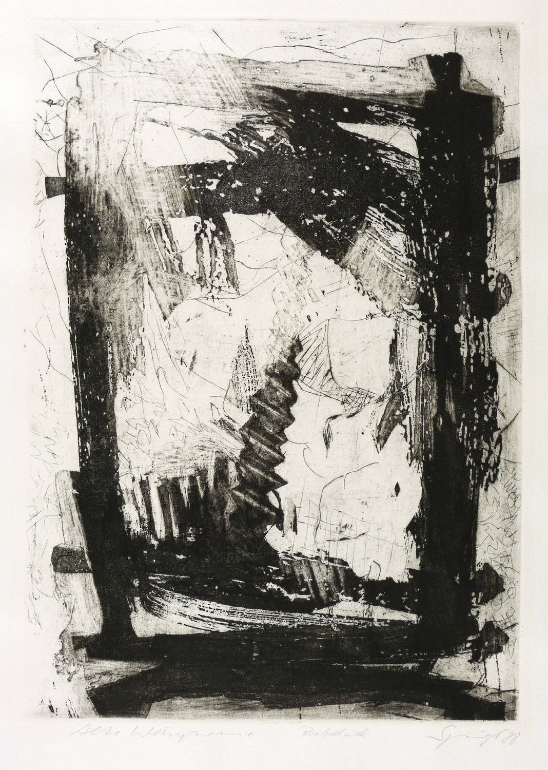 1988. Radierung / Reservage, Aquatinta & Strichätzung, in Schwarz, auf schwerem gelbem Hahnemühle-Bütten. – Originale Künstlergrafik, von Reinhard Springer. – Probedruck. – 45,6 x 32,5 cm (Darstellung / Platte), 53 x 39 cm (Blatt).