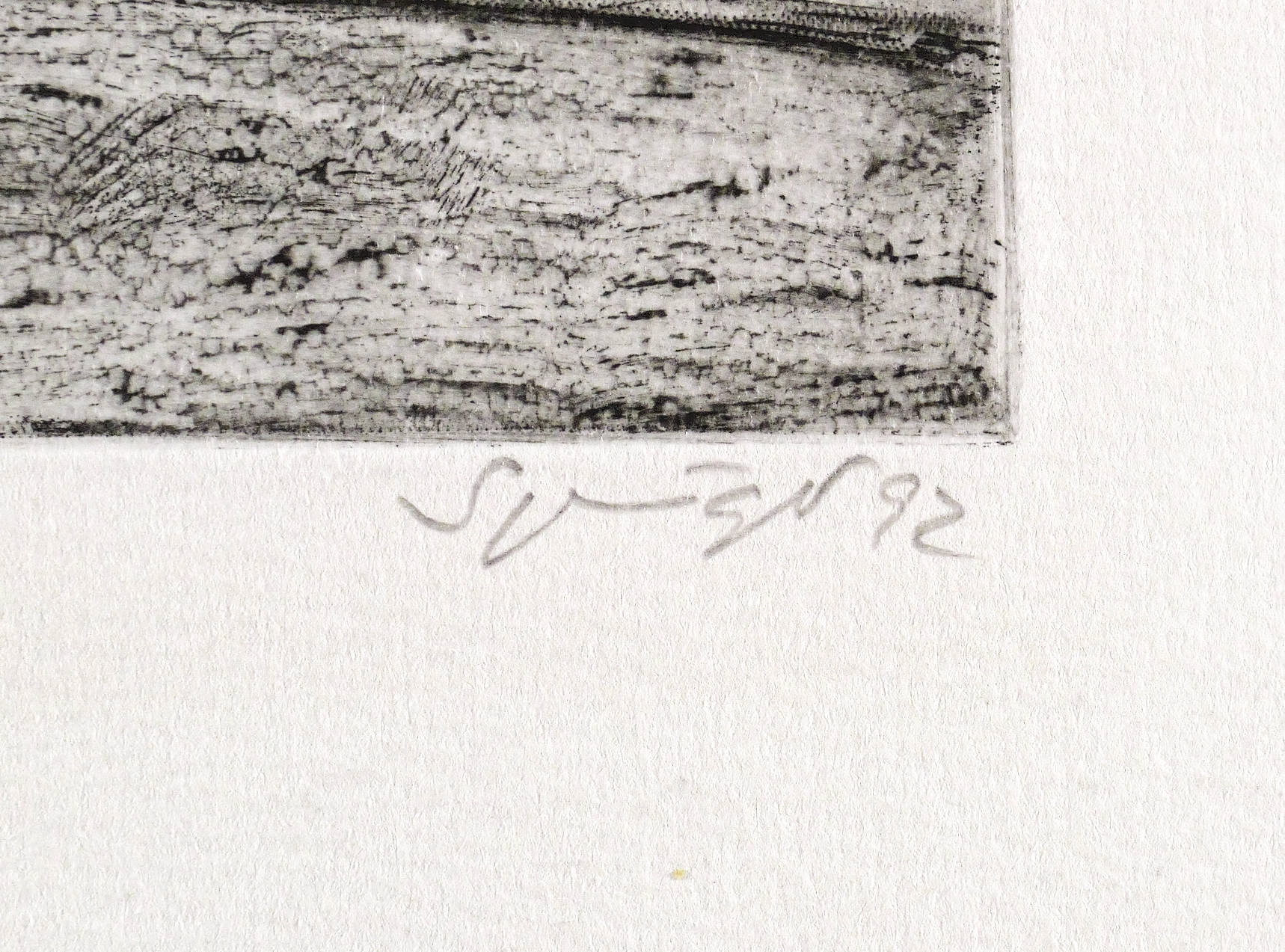 1992. Radierung / Roulette, Reservage & Strichätzung, in Schwarz, auf hellchamois Hahnemühle. – Originale Künstlergrafik, von Reinhard Springer. – Künstlerexemplar (e.a.). – 10,2 x 26,5 cm (Darstellung / Platte), 25 x 38 cm (Blatt).